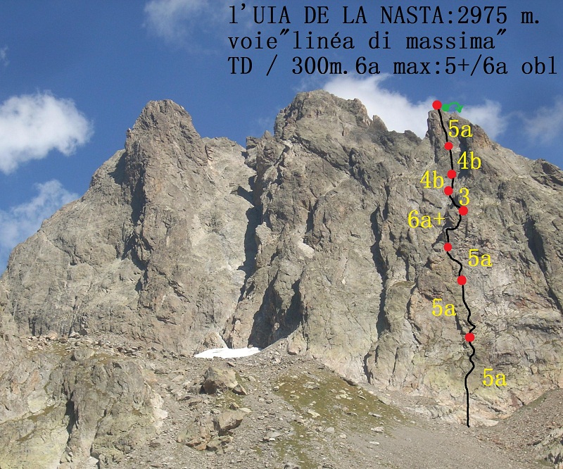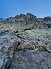 - L7: scalare il bel diedro, poi diritto per placche a vaschette e lame, proseguire lungo uno sperone articolato fino alla sosta posta in un terrazzino sulla destra (50 m, 4b, sosta su chiodo e spit)