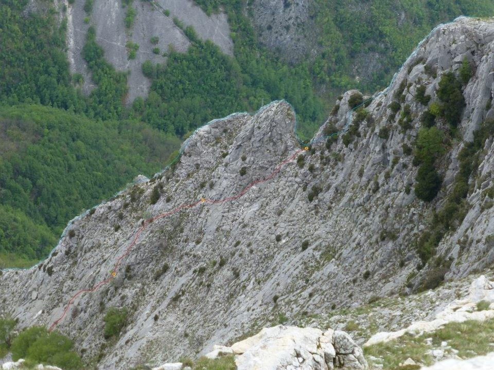 Si arriva quindi in una sella abbastanza larga, dove con camminata si raggiunge la base del canalino dell’anticima, divertente e protetto da vento (occhio ai sassi smossi dalle capre!), e quindi con altri passi di arrampicata misti a camminata si arriva sul traverso prima delle placche finali. Il traverso è in costante salita, non difficile ma con terreno friabile. Notato qualche spit che sembra di recente collocazione, e un “filo” metallico arrugginito che non mette troppa sicurezza.