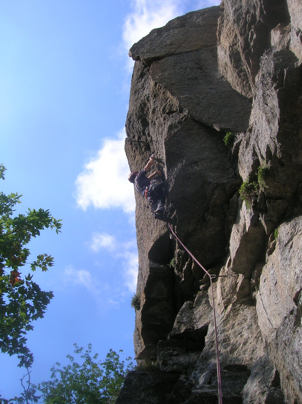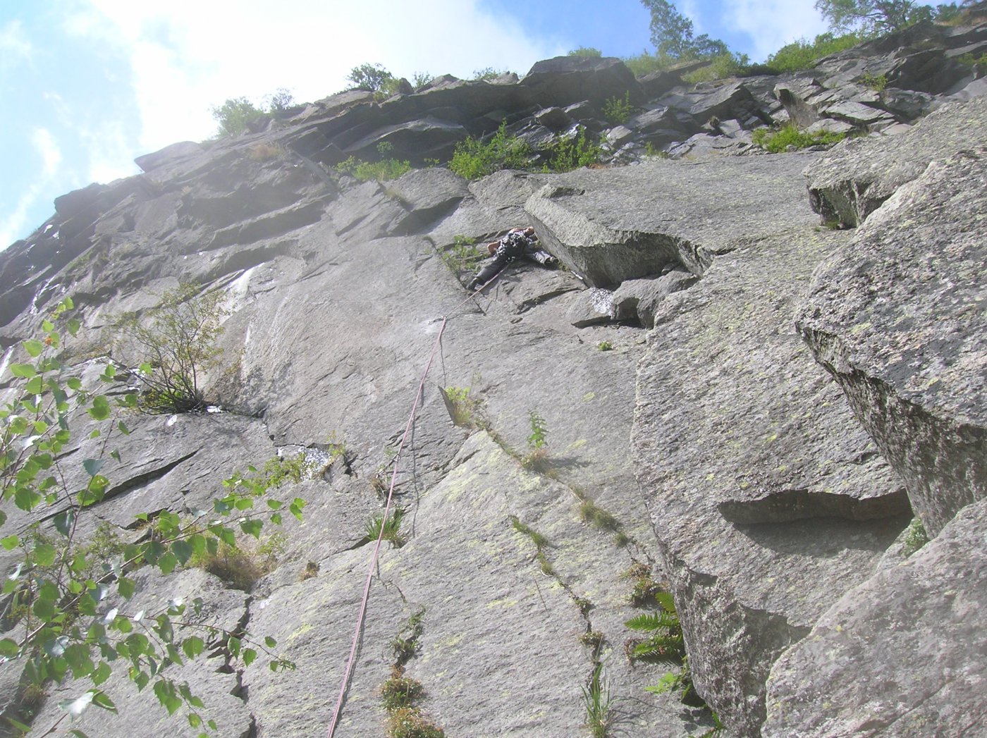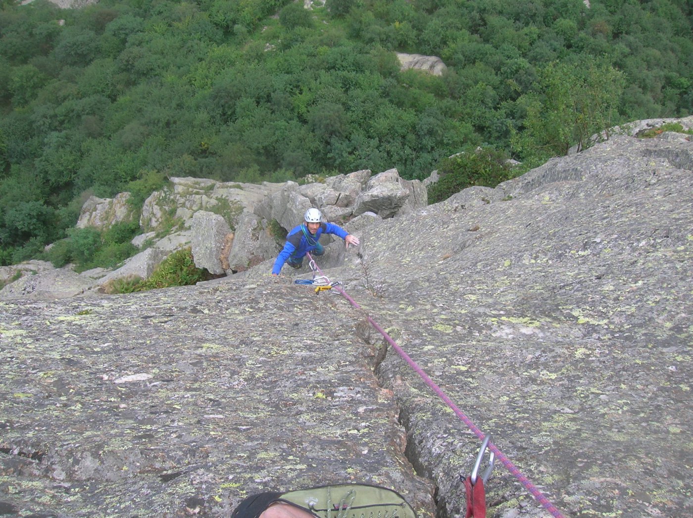 L1-Attaccare nel punto in cui inizia la stretta rampa erbosa salendo il muro (1 fix visibile alla partenza) fino sotto la fessura strapiombante, afferrarla (ottimo 2BD) e superare l’iniziale strapiombo sfruttando provvidenziali gradini sul bordo dx, continuare quindi a seguire la fessura fin dove si raddrizza (ottimo 1BD). Superare la magnifica e difficile fessura da dita (1 fix e friend con misure 0.5, 0.4 e 0.3 BD, utili anche nut medio grandi) fino al suo termine dove muore contro il muro (1 fix). Proseguire verso sx “camminando” sulla grossa lama che poi si raddrizza, vincerla alla Dulfer (2 fix) e pervenire in una zona fessurata più facile (friend BD medi) fino in sosta (2 fix di sosta non collegati). Difficoltà: il tratto verticale è 7A, il resto del tiro è 6A+(5 fix).