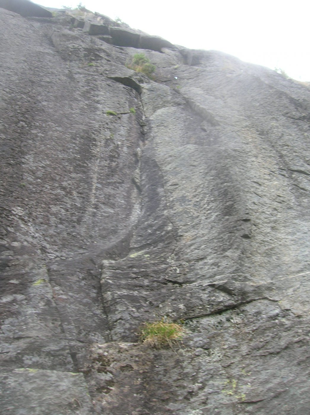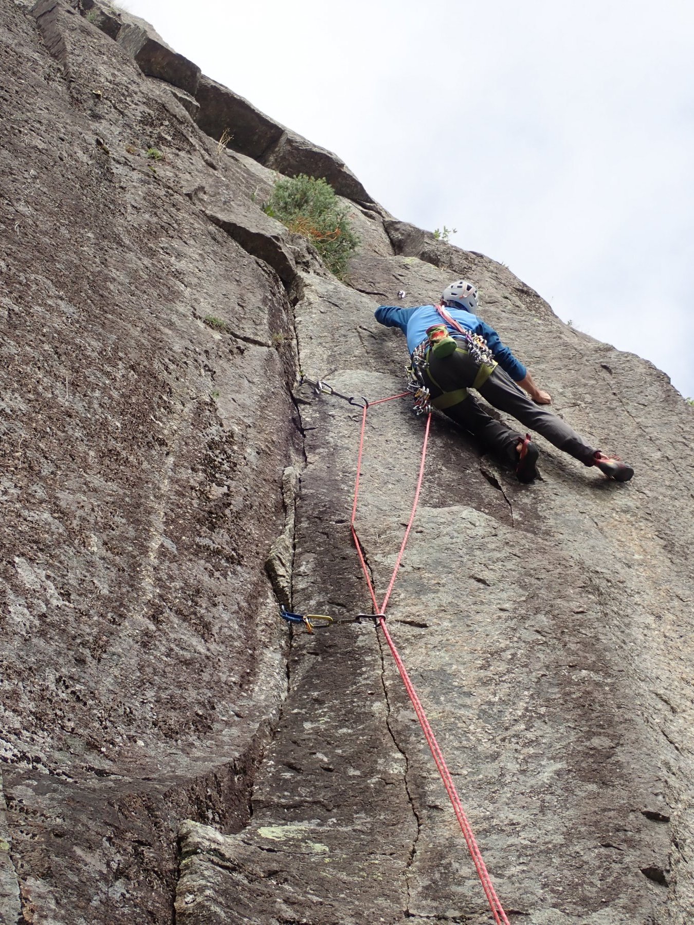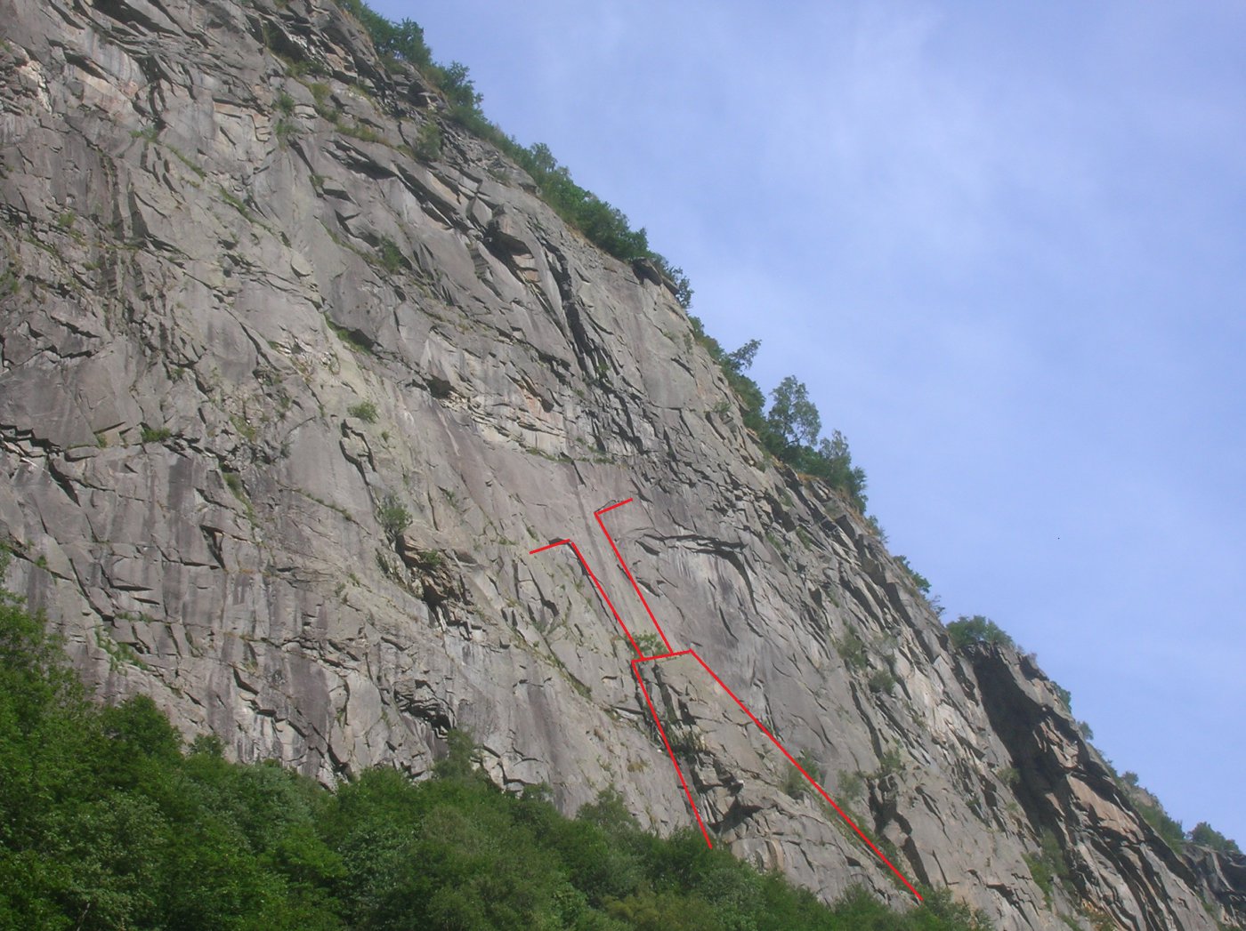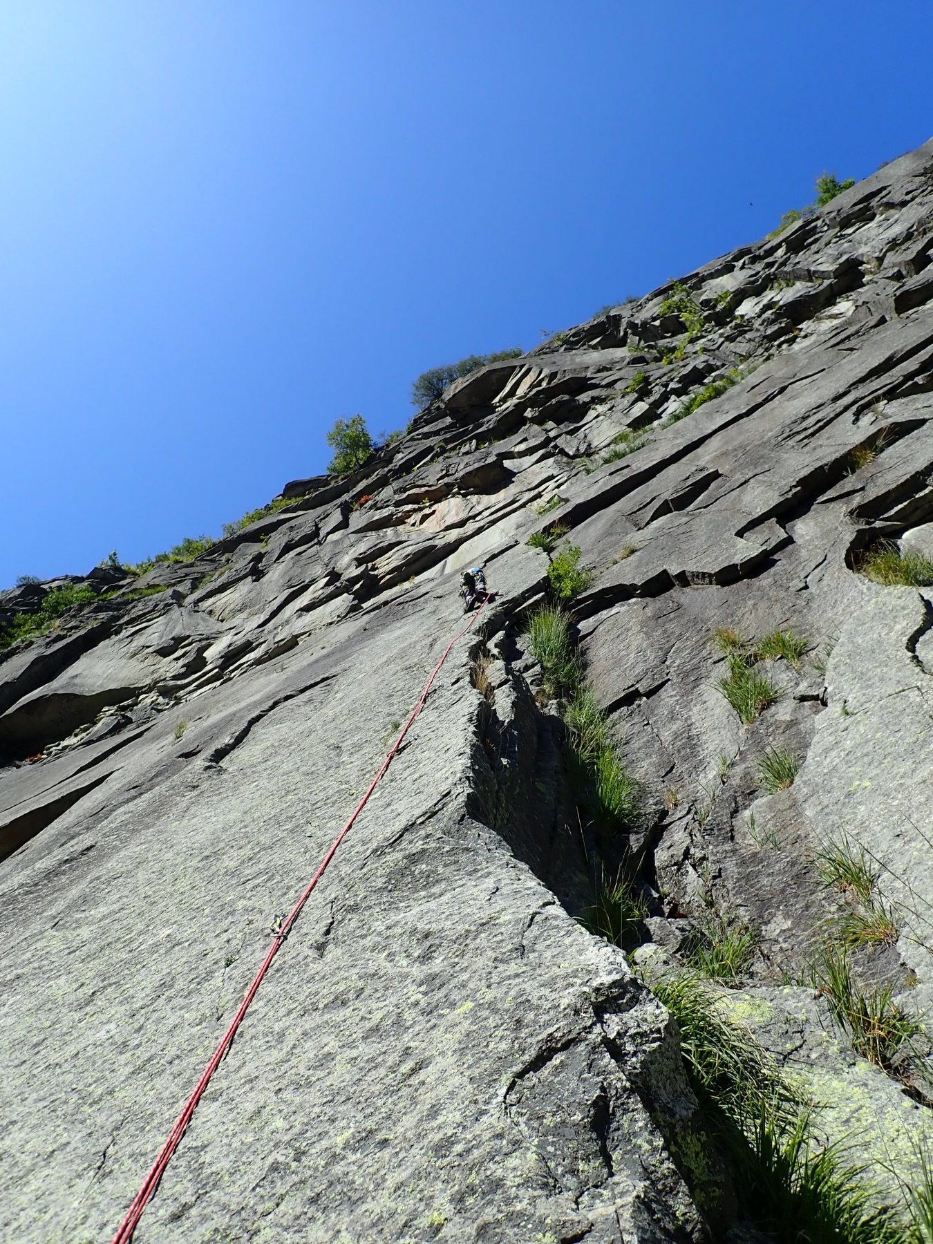 L1-Salire la bella fessurina (proteggibile con friend piccoli e nut) fino a moschettonare il primo fix. Da questo traversare e ribaltarsi con un difficile movimento sulla placca di dx, salire quindi più facilmente fino al secondo fix. Un ottimo cubetto a dx permette di ribaltarsi su un gradino sotto a un tettino (friend 0.5 e microfriend), alzarsi e vincere quindi il difficile ribaltamento (1 fix). Traversare quindi delicatamente verso sx, ancora un passo un po’ obbligatorio permette di moschettonare il fix successivo. Superare ancora un passaggio delicato e traversare quindi più facilmente verso sx a un’ottima terrazza. Sosta con 1 fix da integrare con friend (0.4 o 0.75) (6C, 4 fix + 1 di sosta).