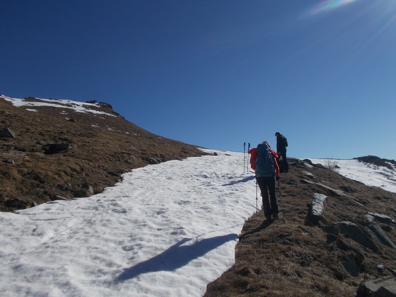 Versante di salita privo di neve fino alla strada dei Cannoni.Poi neve compatta ma spesso evitabile .Abbiamo usato i ramponcini dopo la Bassa di Rasis .Salito prima il Nebin e poi il Cugulet.Discesa sul sentiero del costone est che porta direttamente al Santuario di S.Maria di Morinesio