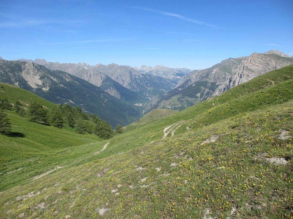 Discesa per la via normale direttamente al Colle Serour, su bel sentiero, senza passare dal Colle Moura delle Vinche. Dal Colle Serour si scende nel bel Vallone degli Spagnoli, volendo anche per una traccia più diretta al fondo della conca sottostante( non è molto chiara la deviazione anche perchè avviene in un tratto di prato dove il sentiero si perde)seguendo invece il sentiero di sx (segnavia B/R)bisogna prestare attenzione nei tratti dove questo si perde, in special modo dopo le vasche(abbeveratoio con vicina sorgente)all’interno del bosco, perchè sparisce completamente, proseguire a dx stando più o meno alla stessa quota, dopo un centinaio di metri lo si ritrova e si prosegue superando la congiunzione delle due tracce poco prima del Gias Salè, sotto le spettacolari pareti della falesia della Cordiera e in breve si perviene sulla sterrata del Colle Valcavera (palina) , si entra nel Vallone della Madonna e si arriva al Gias Mure; da qui si percorre tutto lo spettacolare vallone su bel sentiero fino a ritornare a Sambuco.