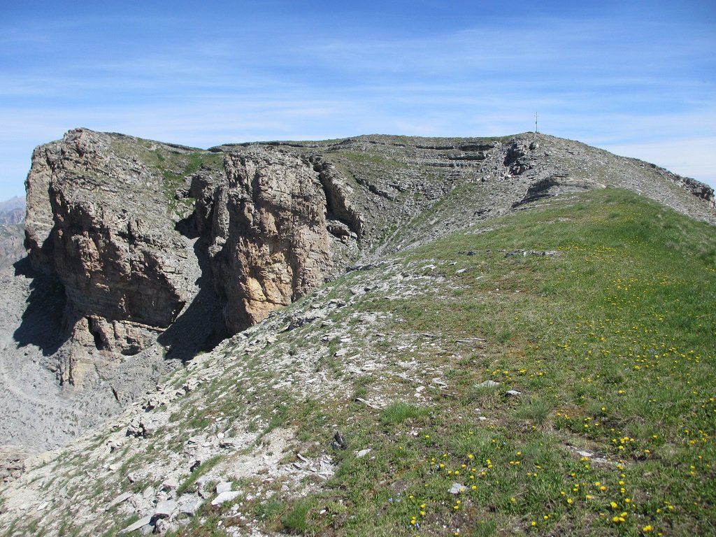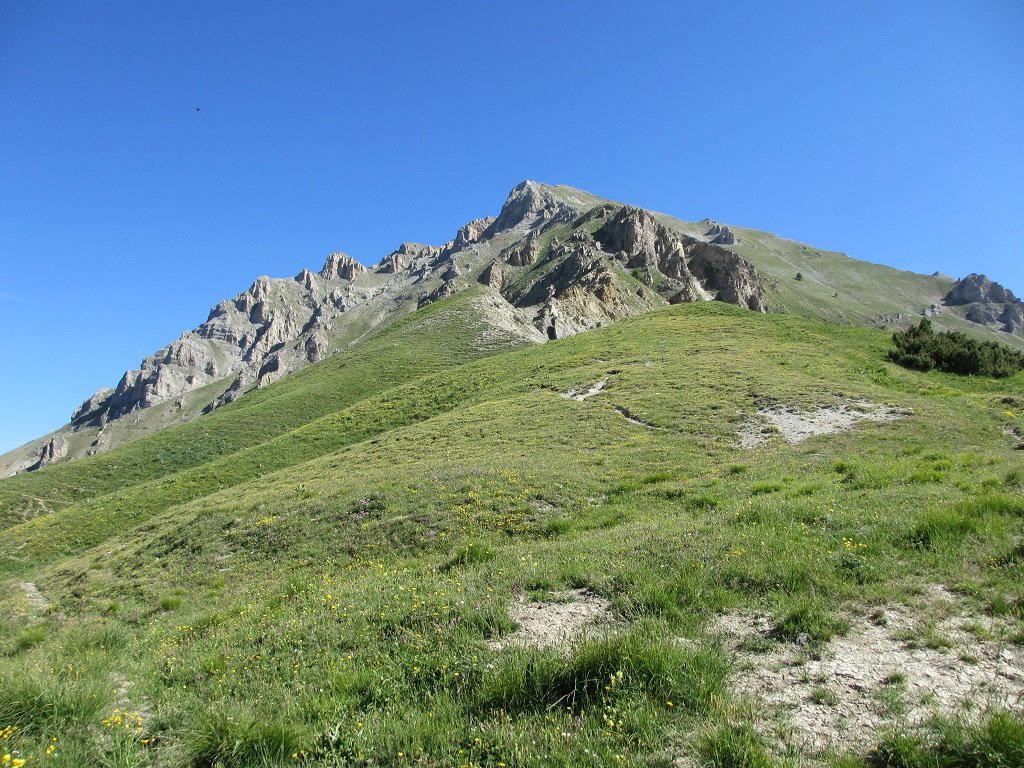 Dall’abitato di Sambuco indicazioni per il Colle Neraissa/Colle Valcavera; si parcheggia poco oltre l’inizio dello sterrato. Pochi metri e si prende a dx (ponte, indicazioni per Chiardoletta/Colle Neraissa) e si percorre la sterrata che conduce alla bella e panoramica borgata Chiardoletta (grande chiesa di S.Anna 1432 m; si prosegue poi su bel sentiero in bellissimo ambiente fino al poggio a quota 1761 m palina) e successivamente fino al Colle Neraissa 2015 m. Da qui si sale subito sulla cresta, con un primo tratto roccioso aggirabile su sfasciumi e tratti erbosi, superato il quale si accede alla facile parte superiore che porta ad un successivo tratto roccioso, anche questo facilmente superabile seguendo i bolli verdi. Si raggiunge ora la quota 2501 m e quindi non resta che superare l’ultimo castello roccioso, tutto ben scalinato, sempre seguendo i bolli verdi da cui si esce alla croce di vetta.