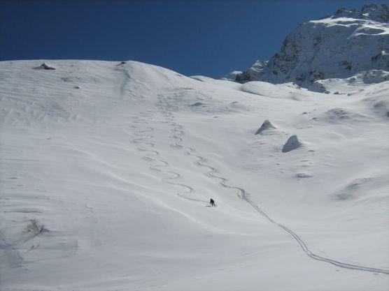 Attenzione: se al ritorno si vuole passare dall’alpe di Nefelgiù è meglio ripellare subito dopo e salire ancora sul dosso che cercare di fare il traverso sotto, per il momento troppo carico.