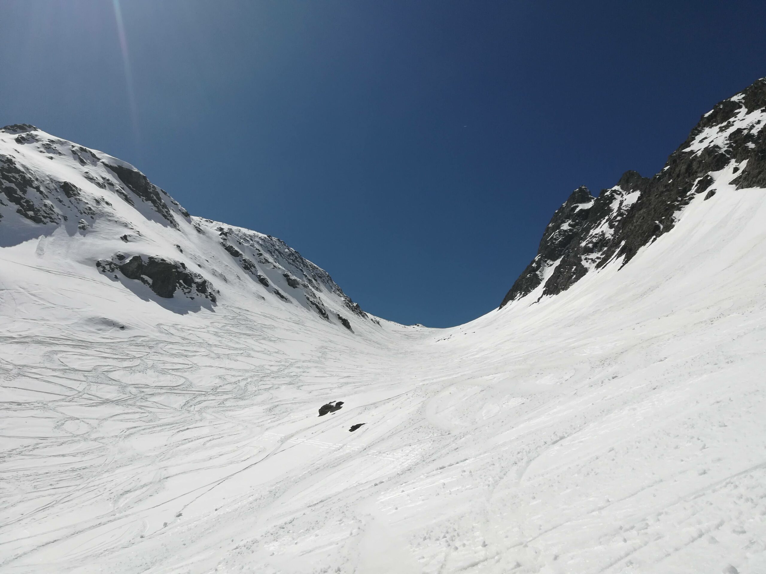 Discesa verso le 12.30, prima parte sul pendio dal colletto appena dopo la cima su polvere intonsa su fondo duro. Poi neve mollata al punto giusto divertente sino in fondo.