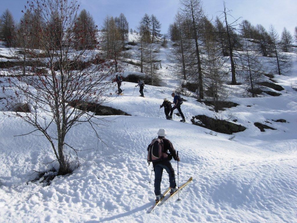 Si svolta a sx superando a monte di un fortino l’aperto pendio di media inclinazione che porta sulla piatta cresta