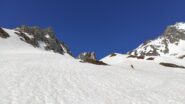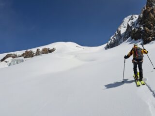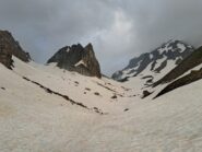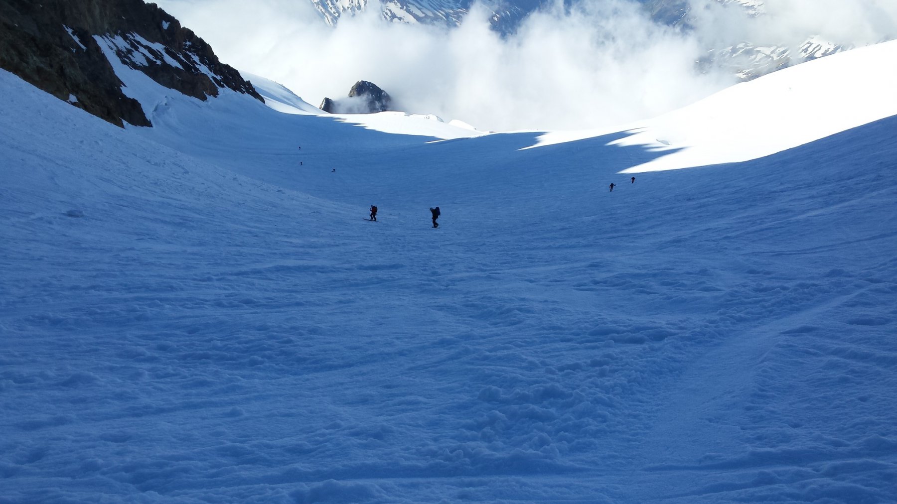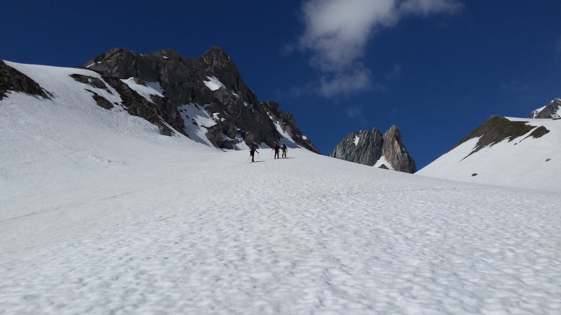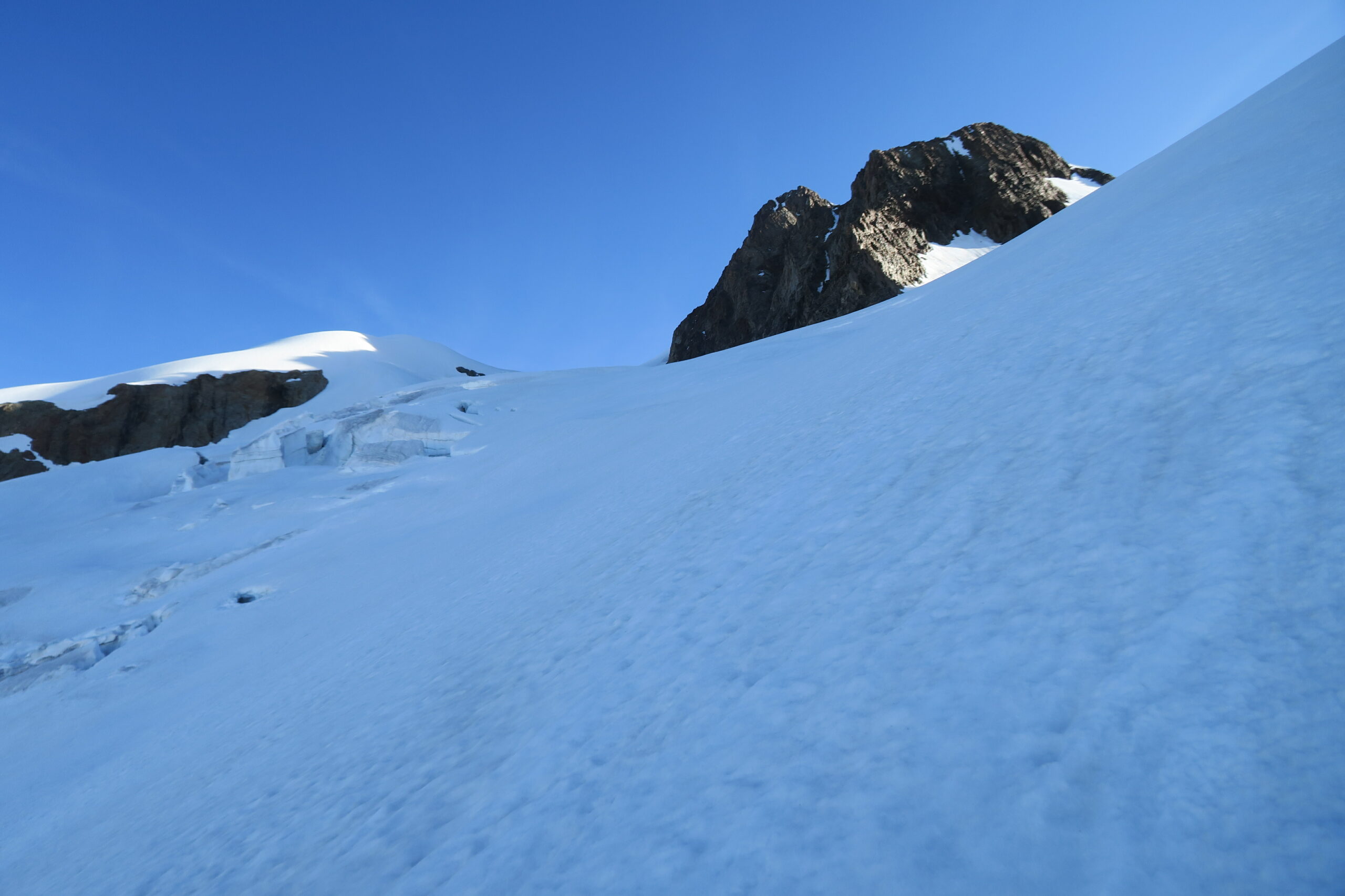 Continuare per pietraie e nevai (condizioni variabili a seconda del periodo) e con un breve tratto ripido si sale fino alla sella posta tra le pendici sud della Petite Aiguille des Glaciers e lo sperone roccioso delle Cabottes (3001 m), oltrepassata la quale si prende piede sul Glacier des Glaciers. Risalire il ghiacciaio con percorso variabile facendo attenzione ad evitare le numerose zone crepacciate fino al Dome des Glaciers (3592 m).