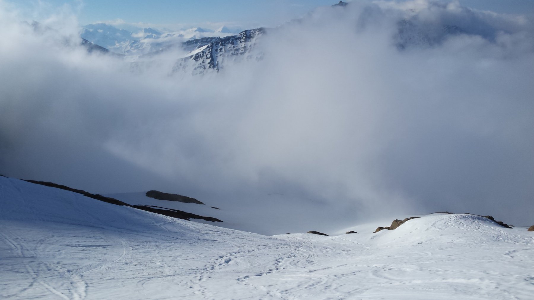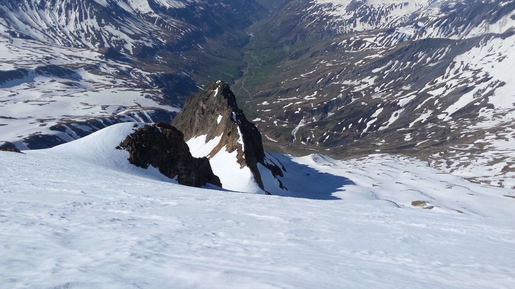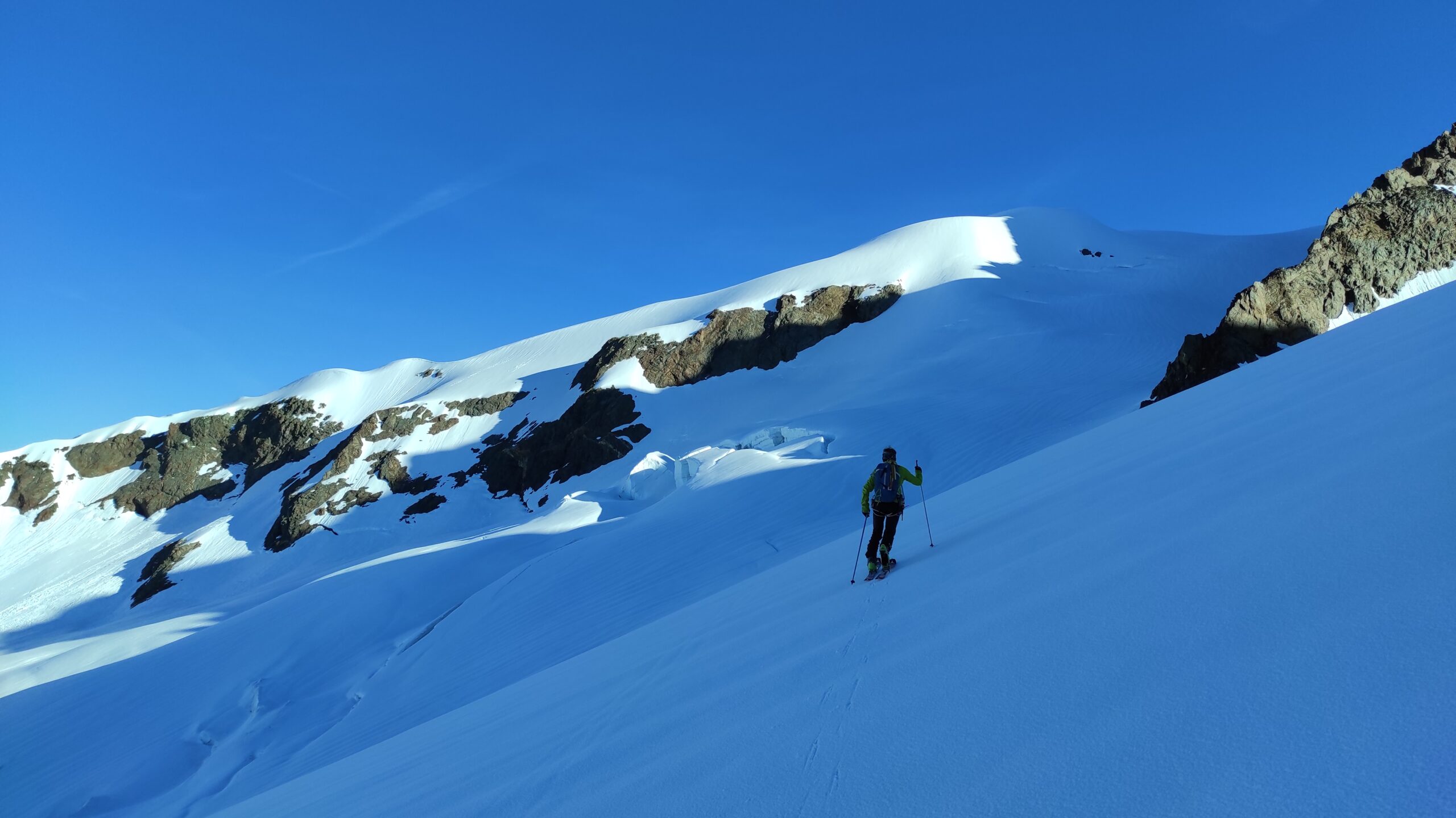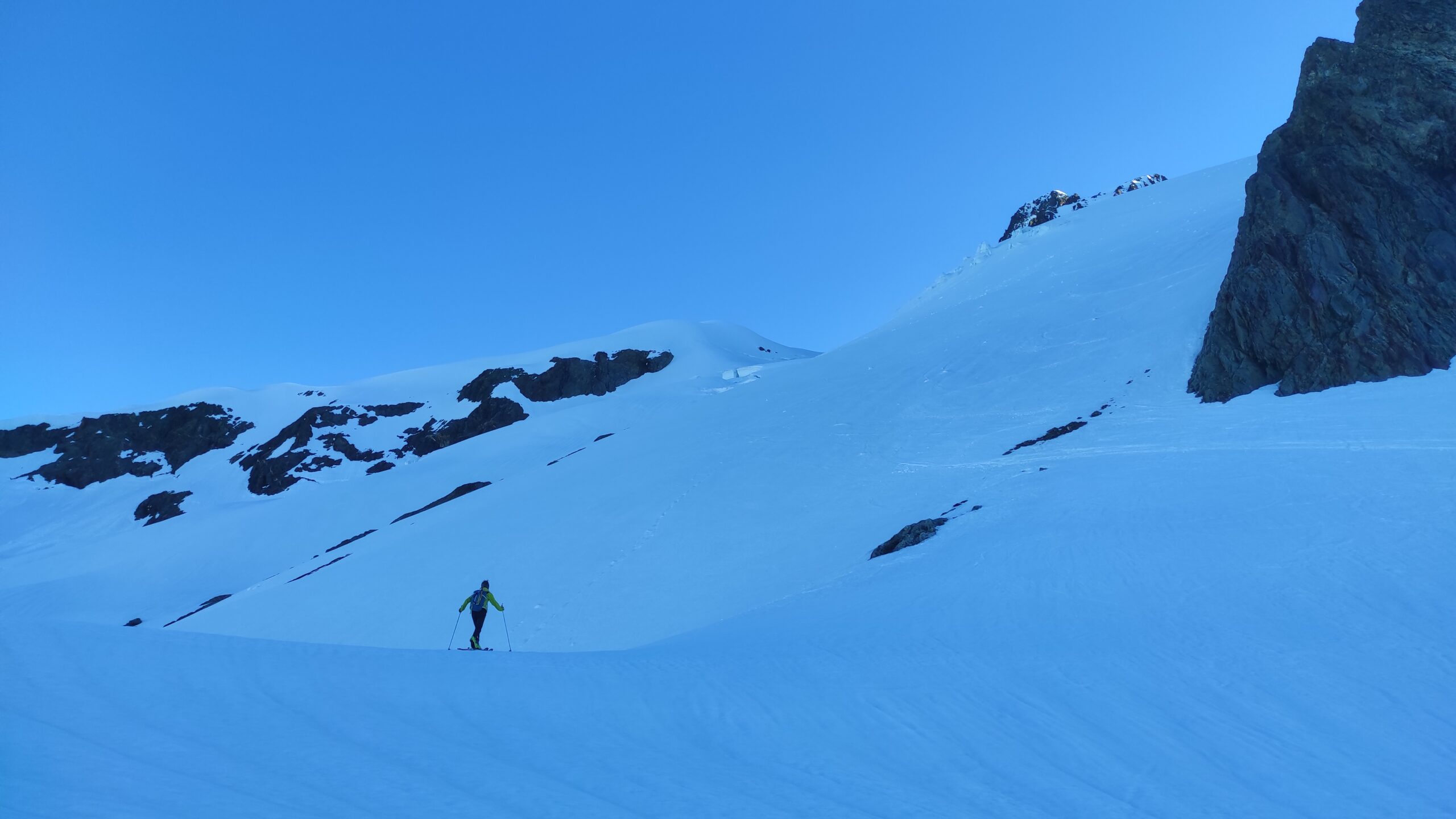 Continuare per pietraie e nevai (condizioni variabili a seconda del periodo) e con un breve tratto ripido si sale fino alla sella posta tra le pendici sud della Petite Aiguille des Glaciers e lo sperone roccioso delle Cabottes (3001 m), oltrepassata la quale si prende piede sul Glacier des Glaciers. Risalire il ghiacciaio con percorso variabile facendo attenzione ad evitare le numerose zone crepacciate fino al Dome des Glaciers (3592 m).