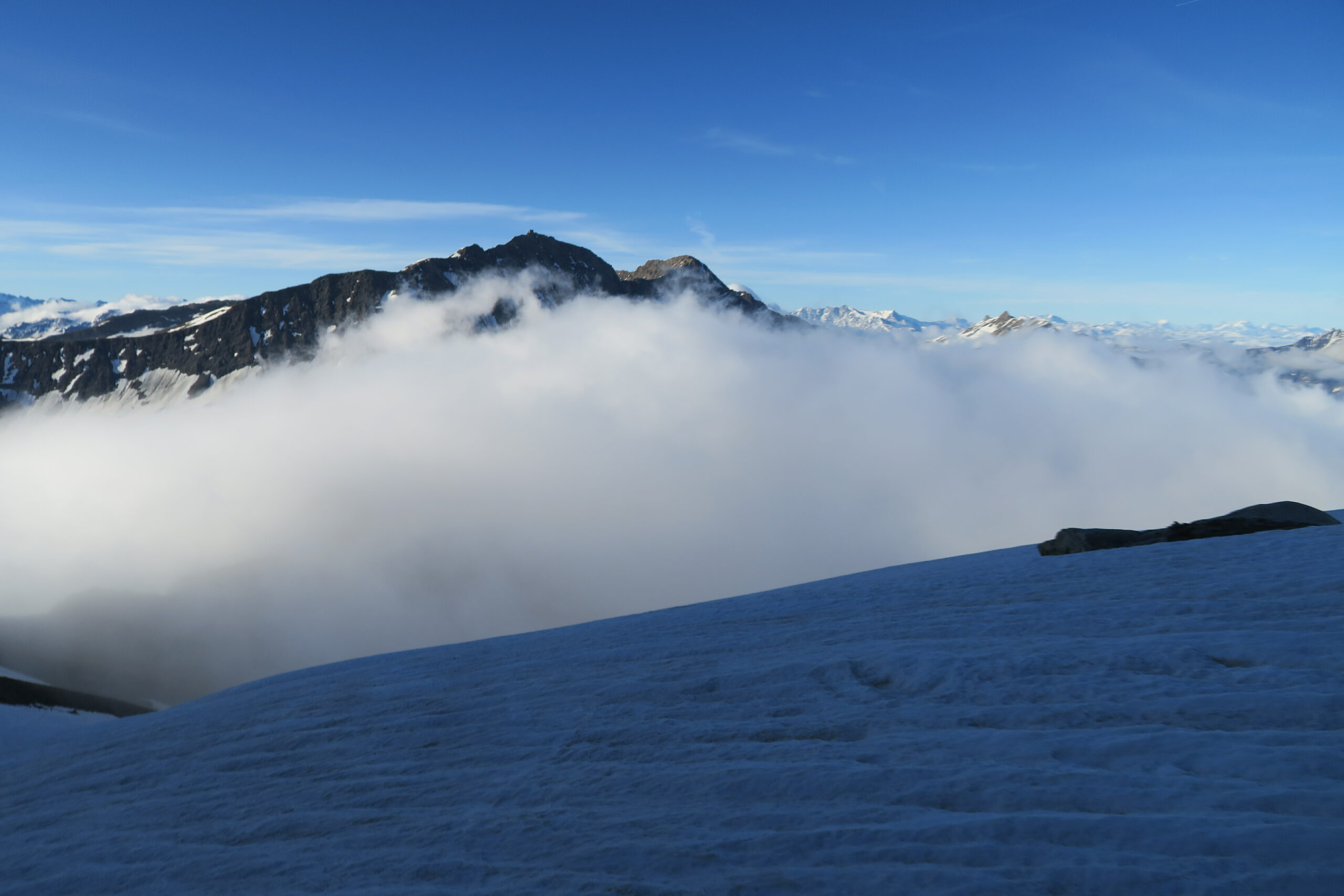 Breve tratto a piedi per raggiungere il colletto per il rientro nel versante italiano e successiva bella discesa su neve smollata il giusto.