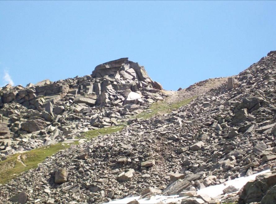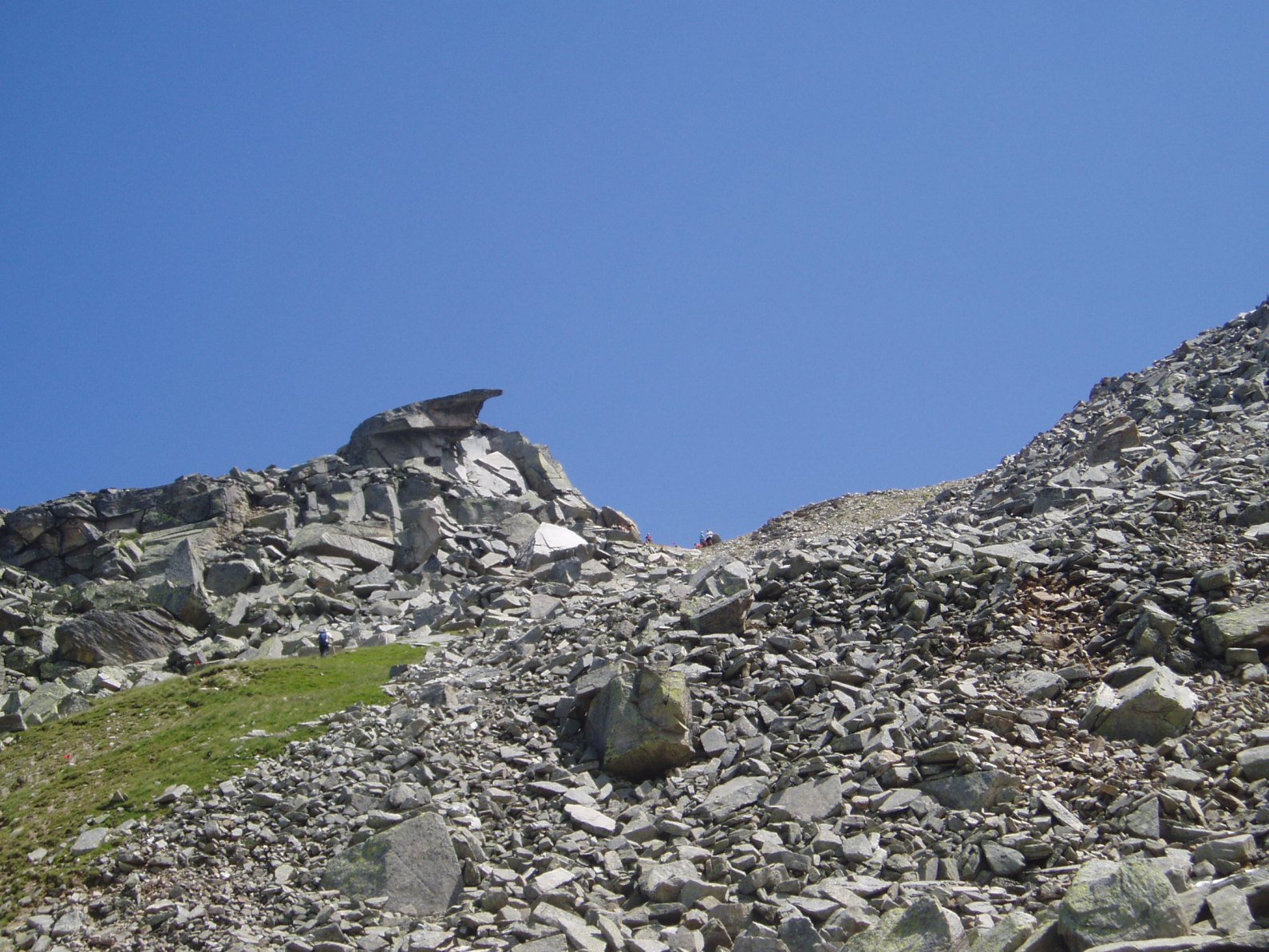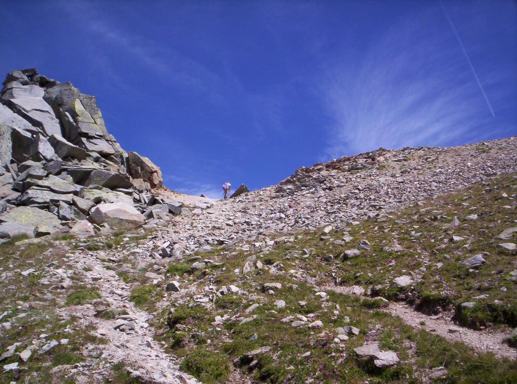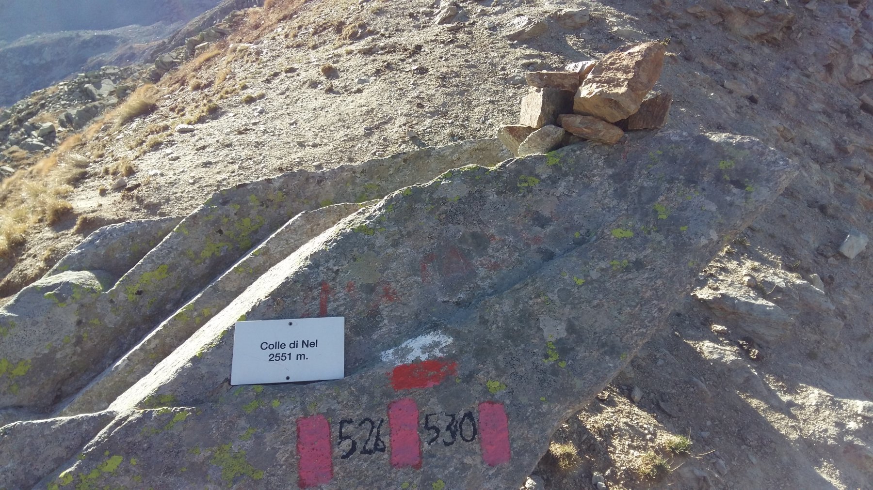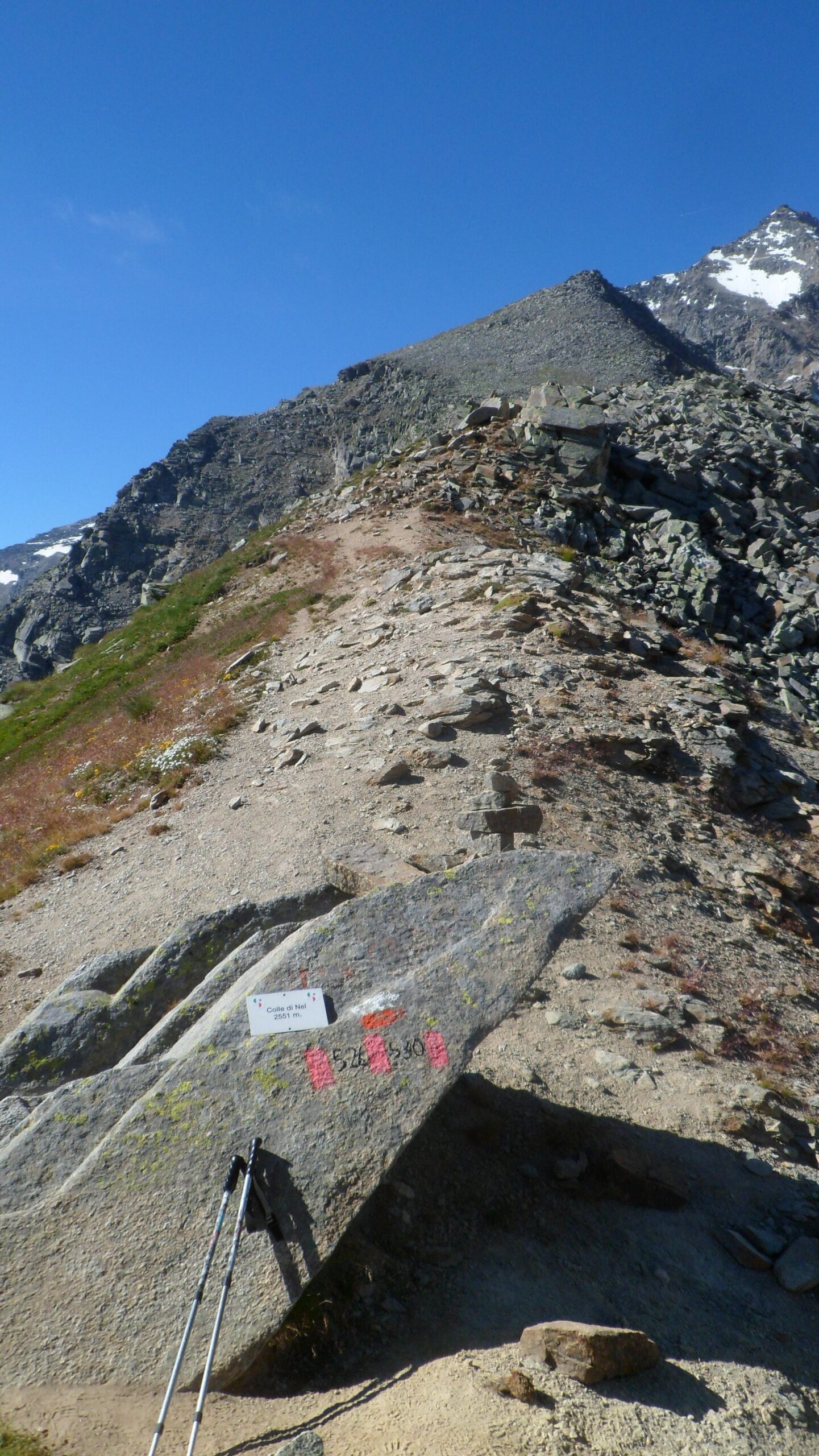 Procedendo fra massi e sfasciumi e rocce montonate si prosegue secondo le indicazione degli ometti. Piegando verso sinistra, cioè verso est, comincia una ripida salita che, in breve, ci riporta molto al di sopra della conca sottostante fino al Colle di Nel.