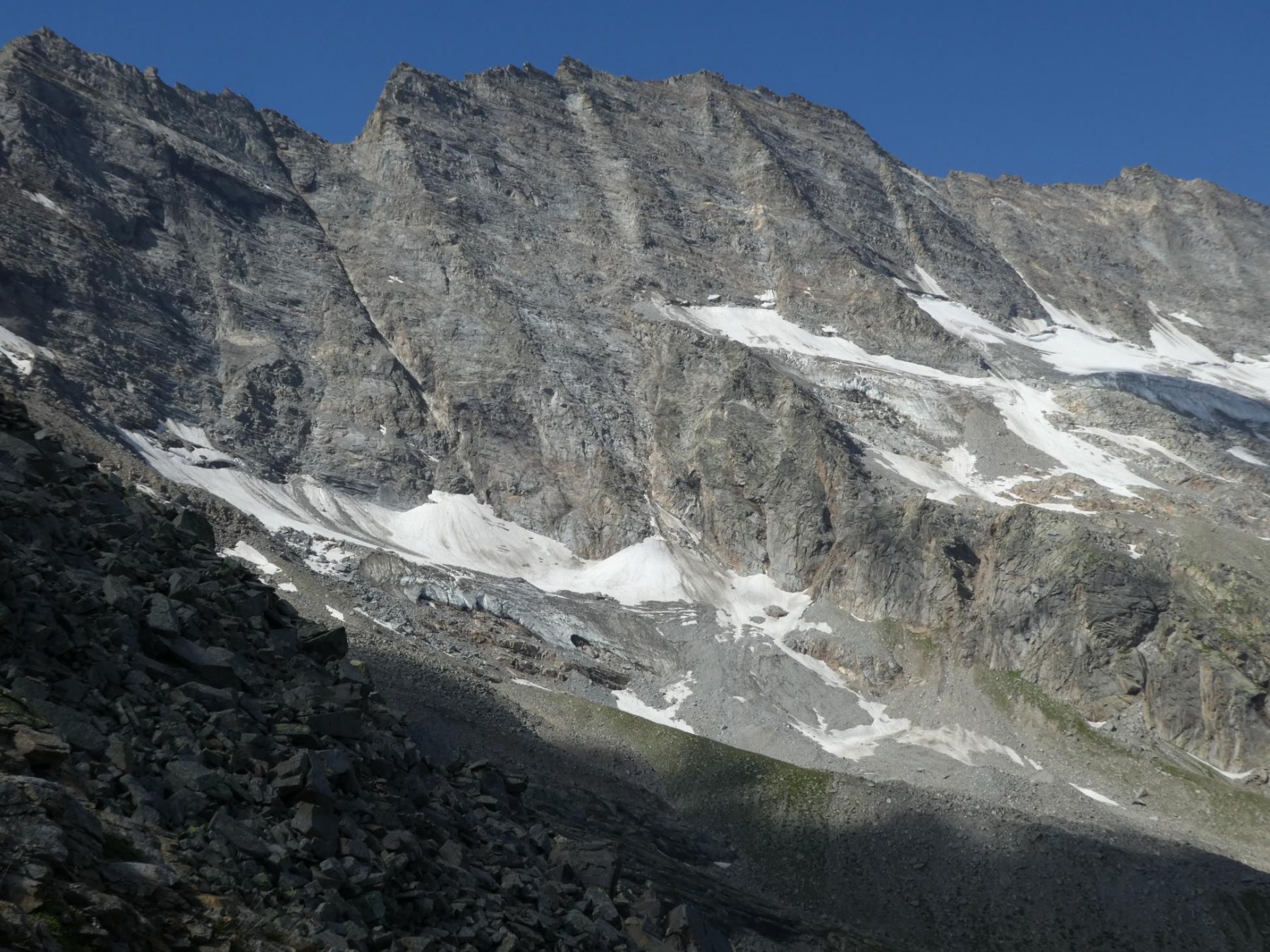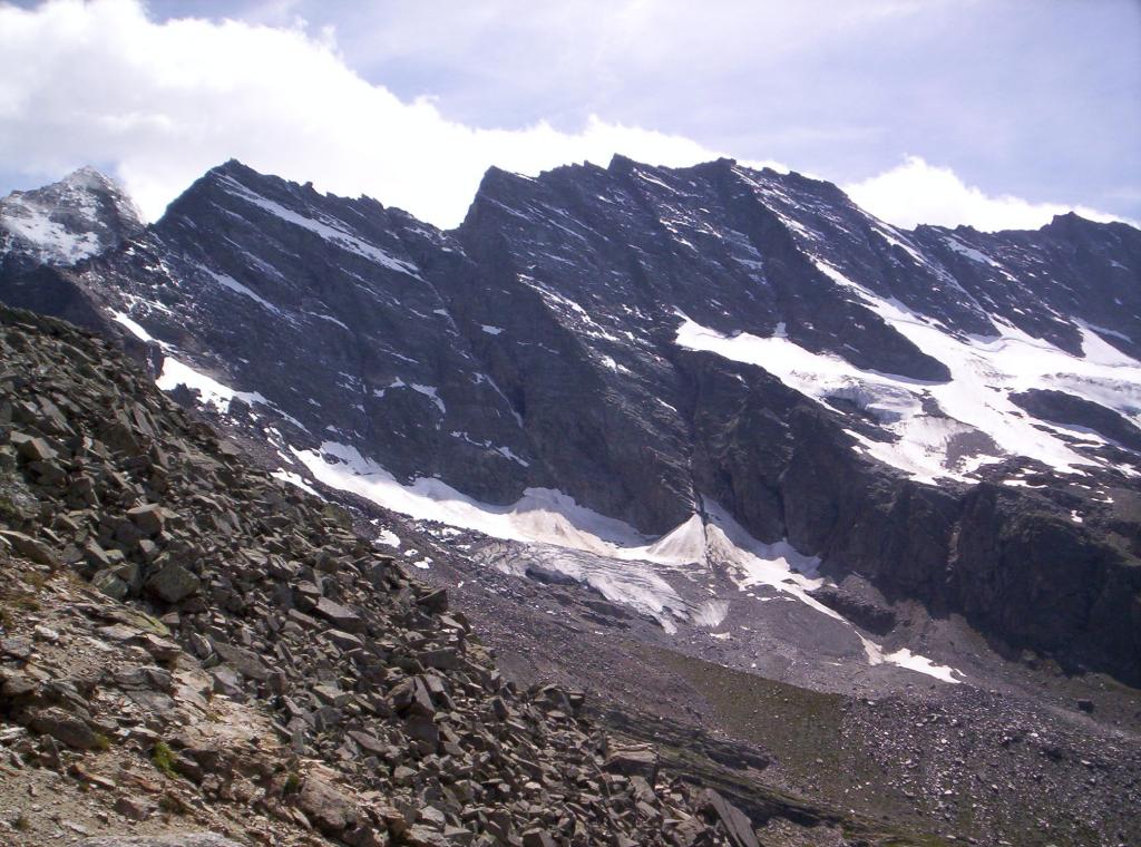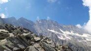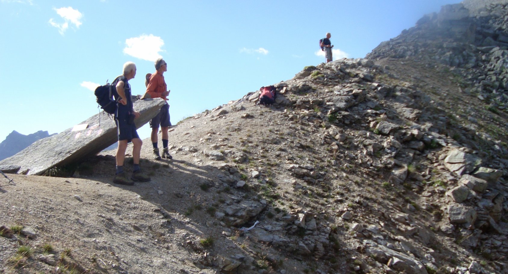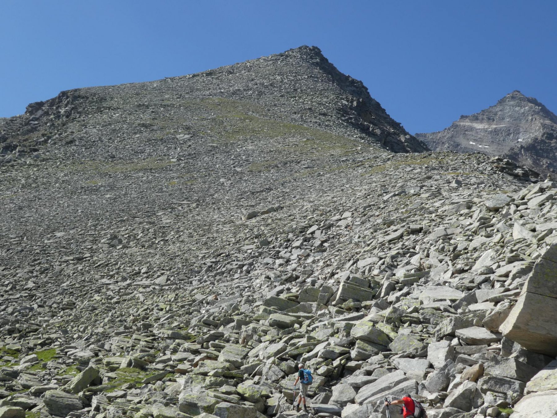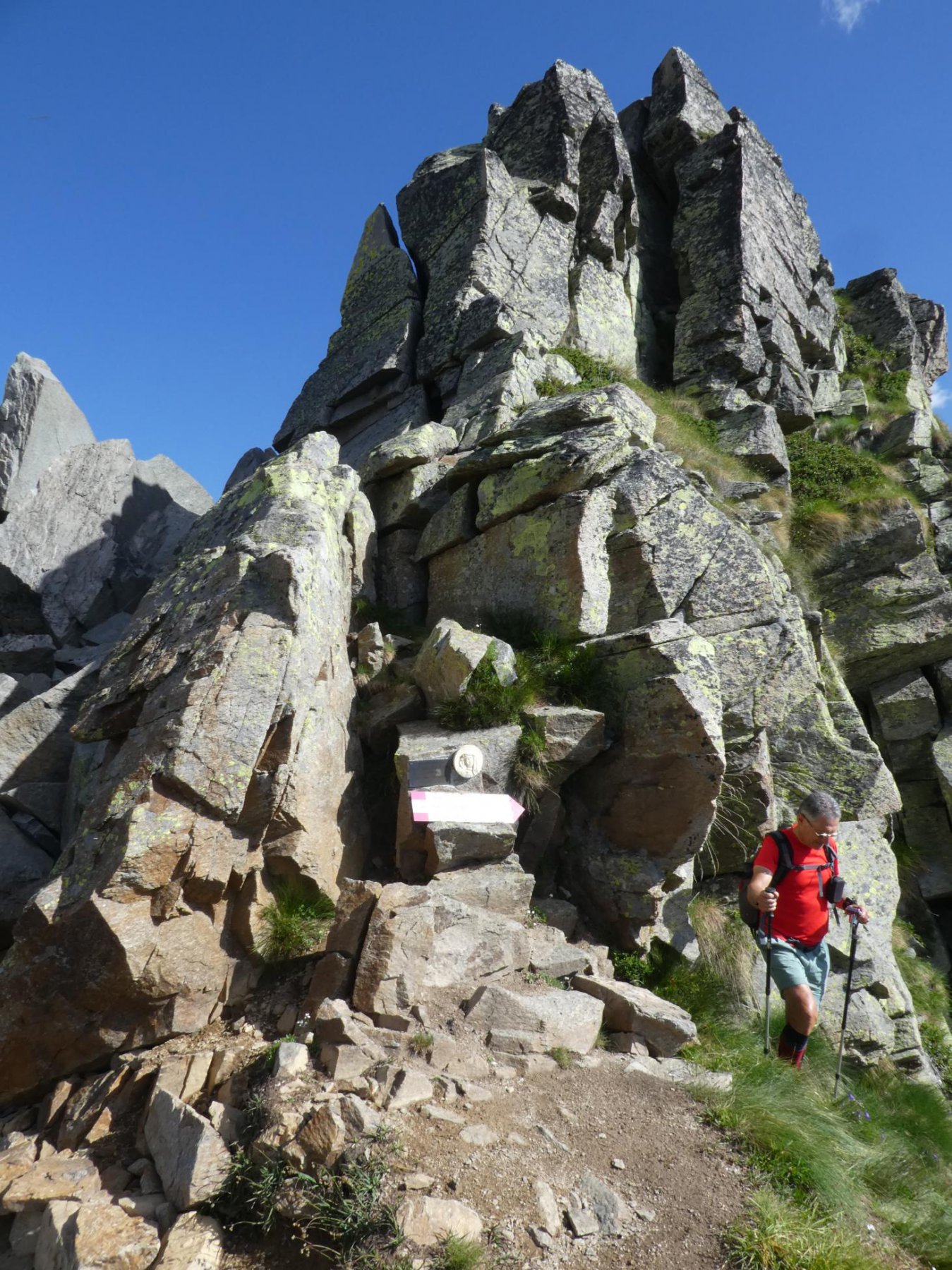 Procedendo fra massi e sfasciumi e rocce montonate si prosegue secondo le indicazione degli ometti. Piegando verso sinistra, cioè verso est, comincia una ripida salita che, in breve, ci riporta molto al di sopra della conca sottostante fino al Colle di Nel.