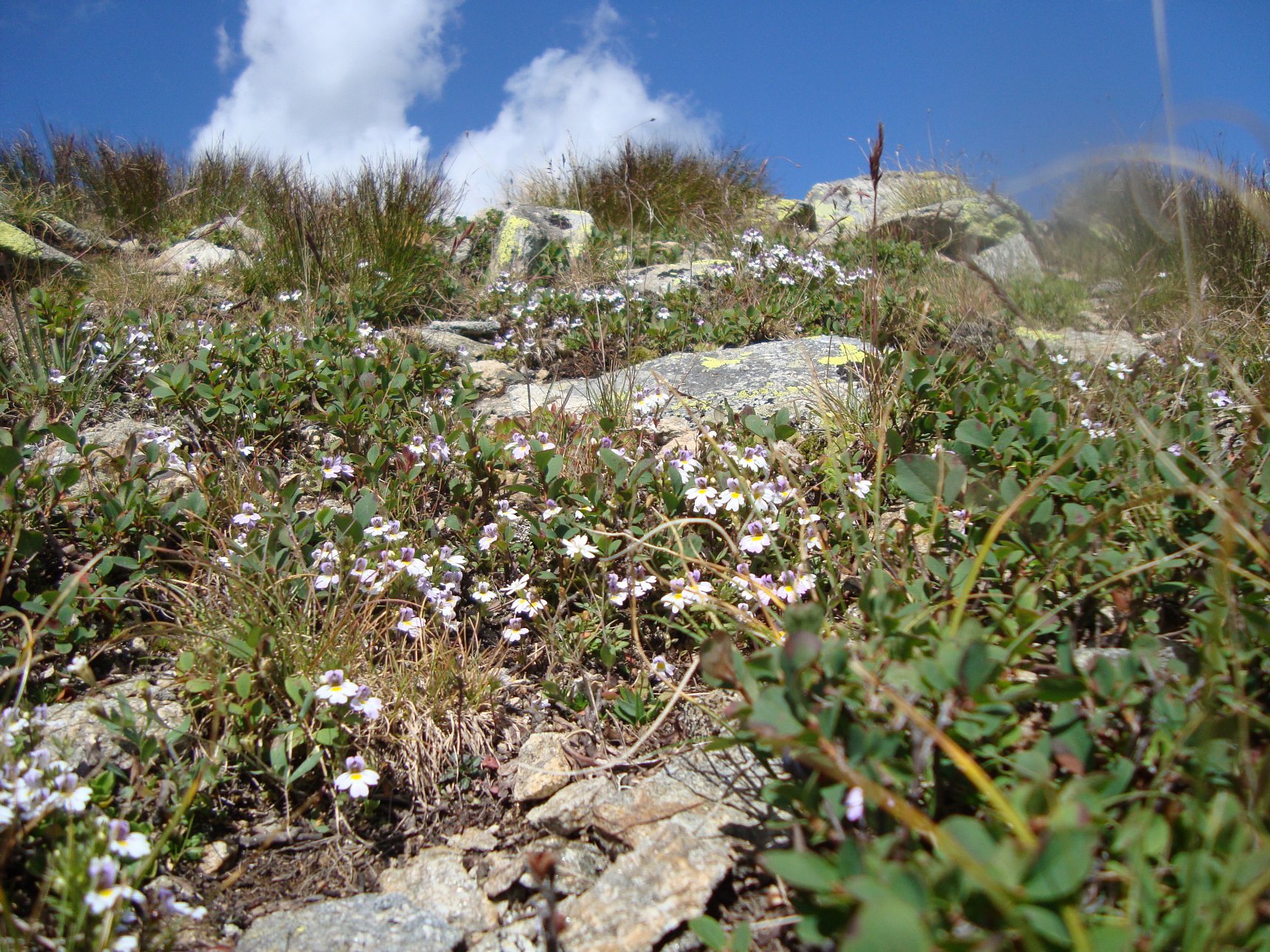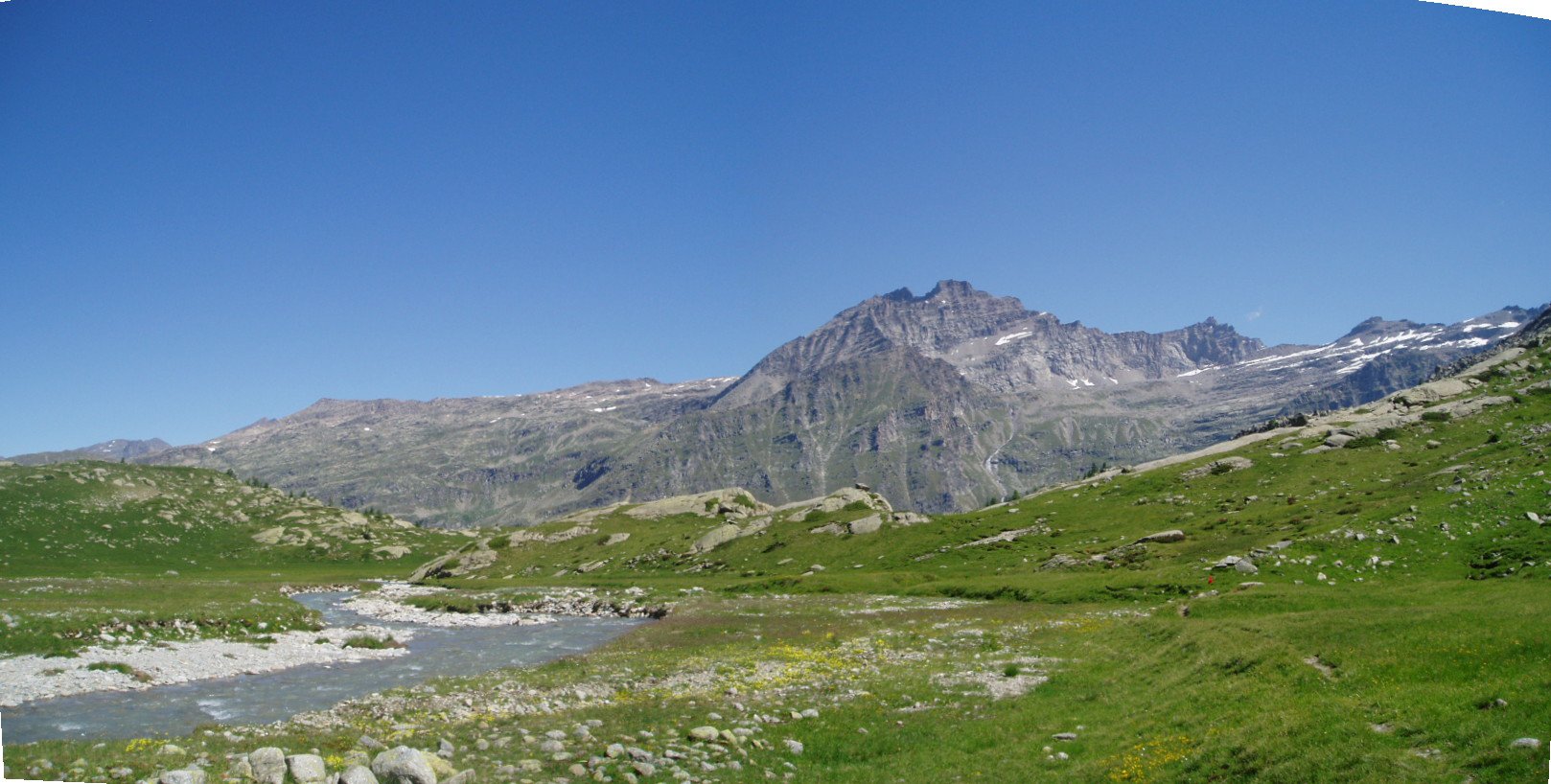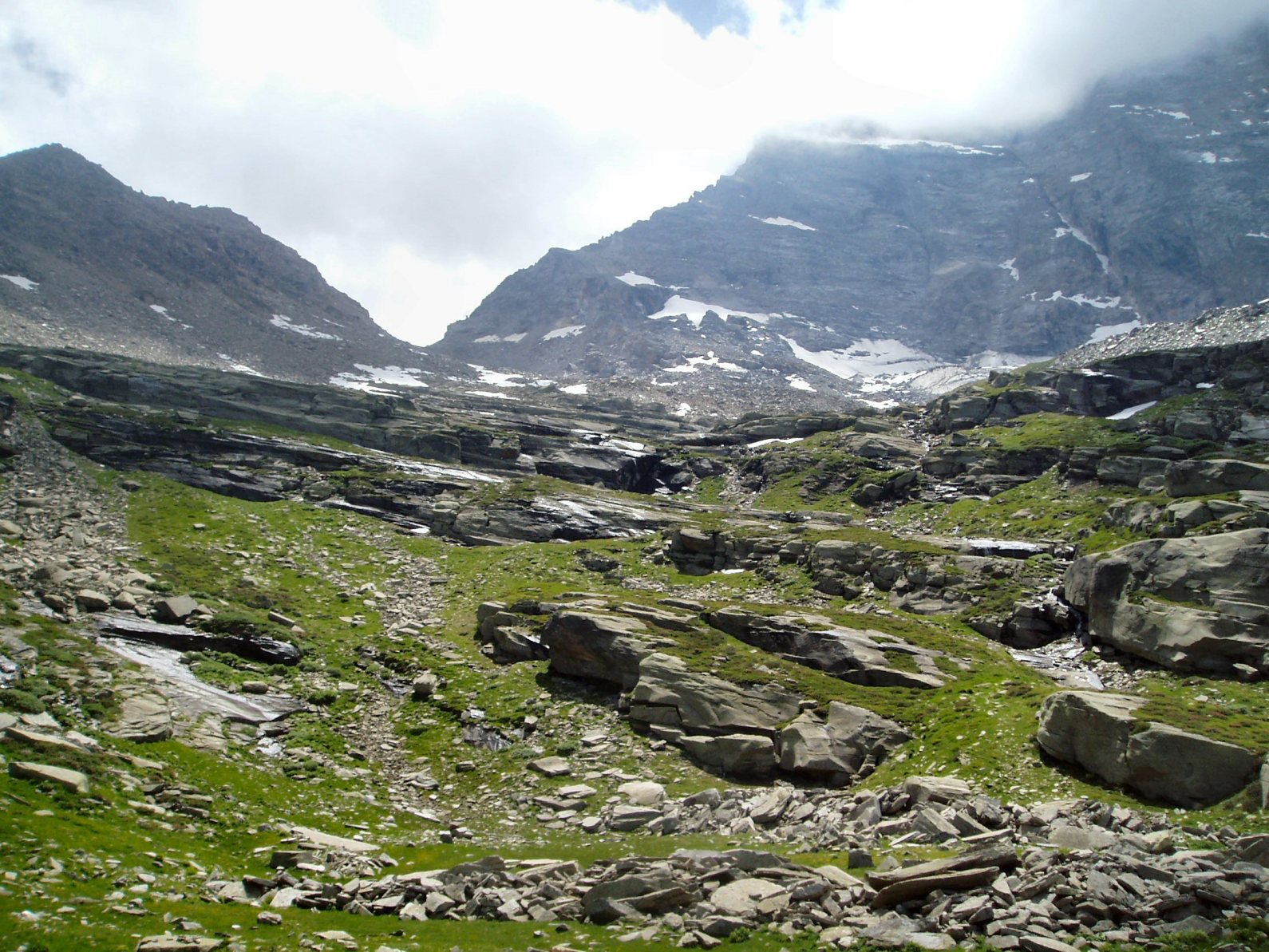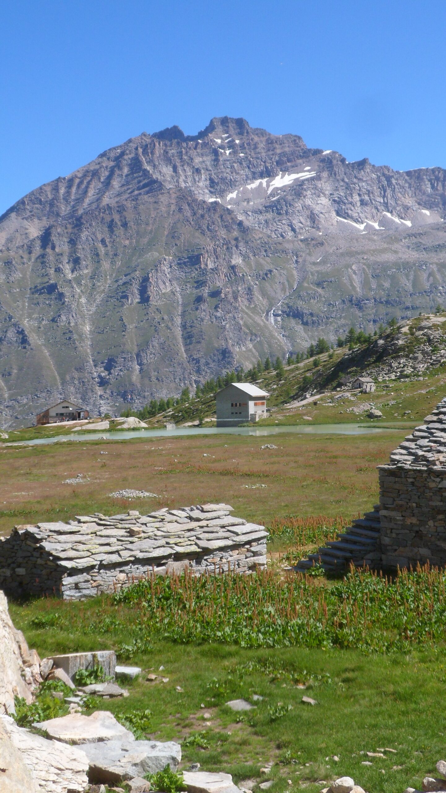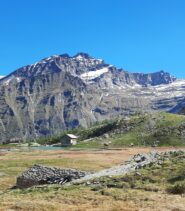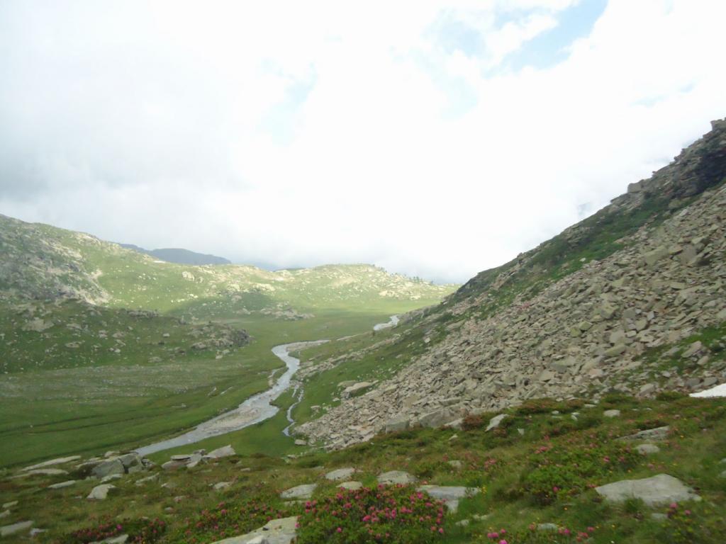 Si lasciano a sinistra due piccoli specchi d’acqua e si prosegue, a tratti in piano, a tratti per ripidi gradoni, verso il pianoro dove si scorgono vari alpeggi.