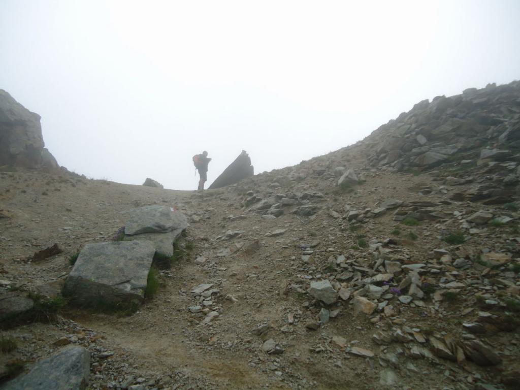 La discesa è subito ripida e bolli di vernice ed ometti sono un buon riferimento, specie in caso di nebbia