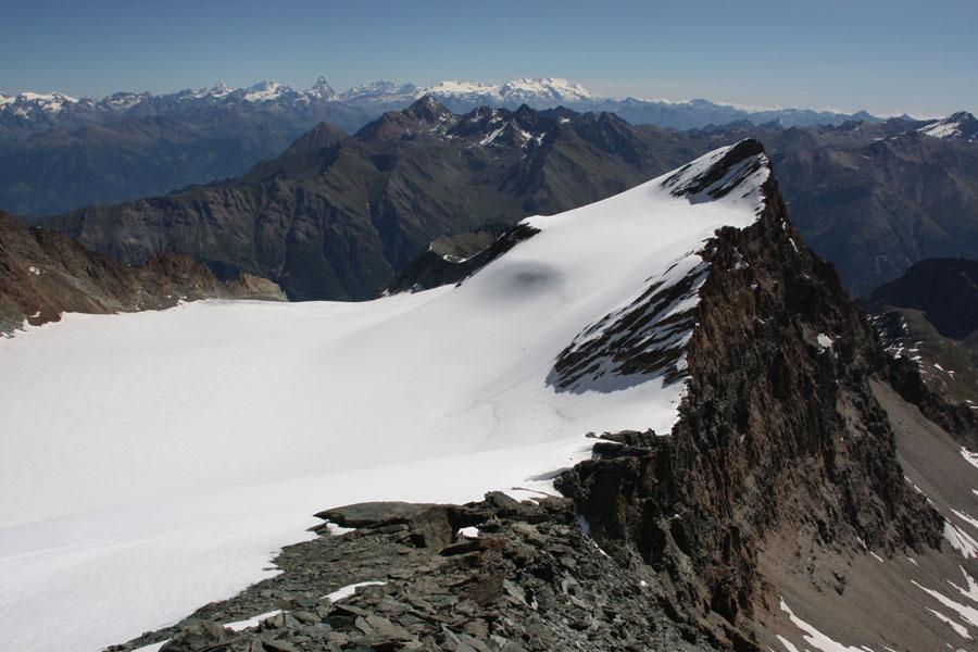 Si percorre tutta la cresta, per ottima traccia, mantenendosi sul filo, poco al di sopra del lembo del Ghiacciaio del Trajo che riveste la parete della montagna. Non si incontrano grandi difficoltà fino in vetta (3630 m, 1,30 ore).