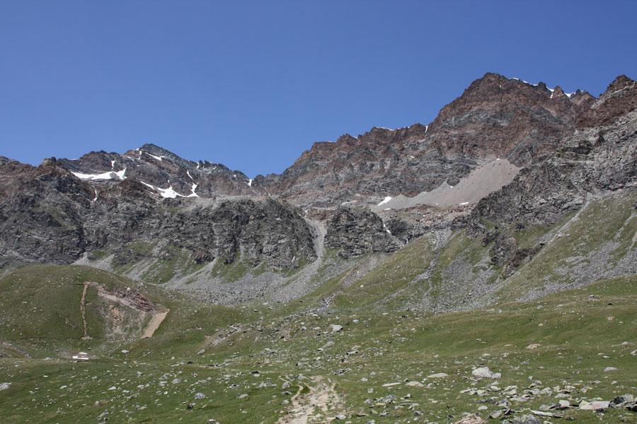 Poco più in alto a destra è posto il bivacco Gratton. Da qui si risale direttamente l'erto pendio di pietrame instabile (qualche ometto), arrivando così sulla cresta nord-est, nei pressi della Q. 3417.