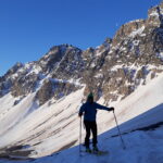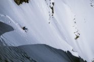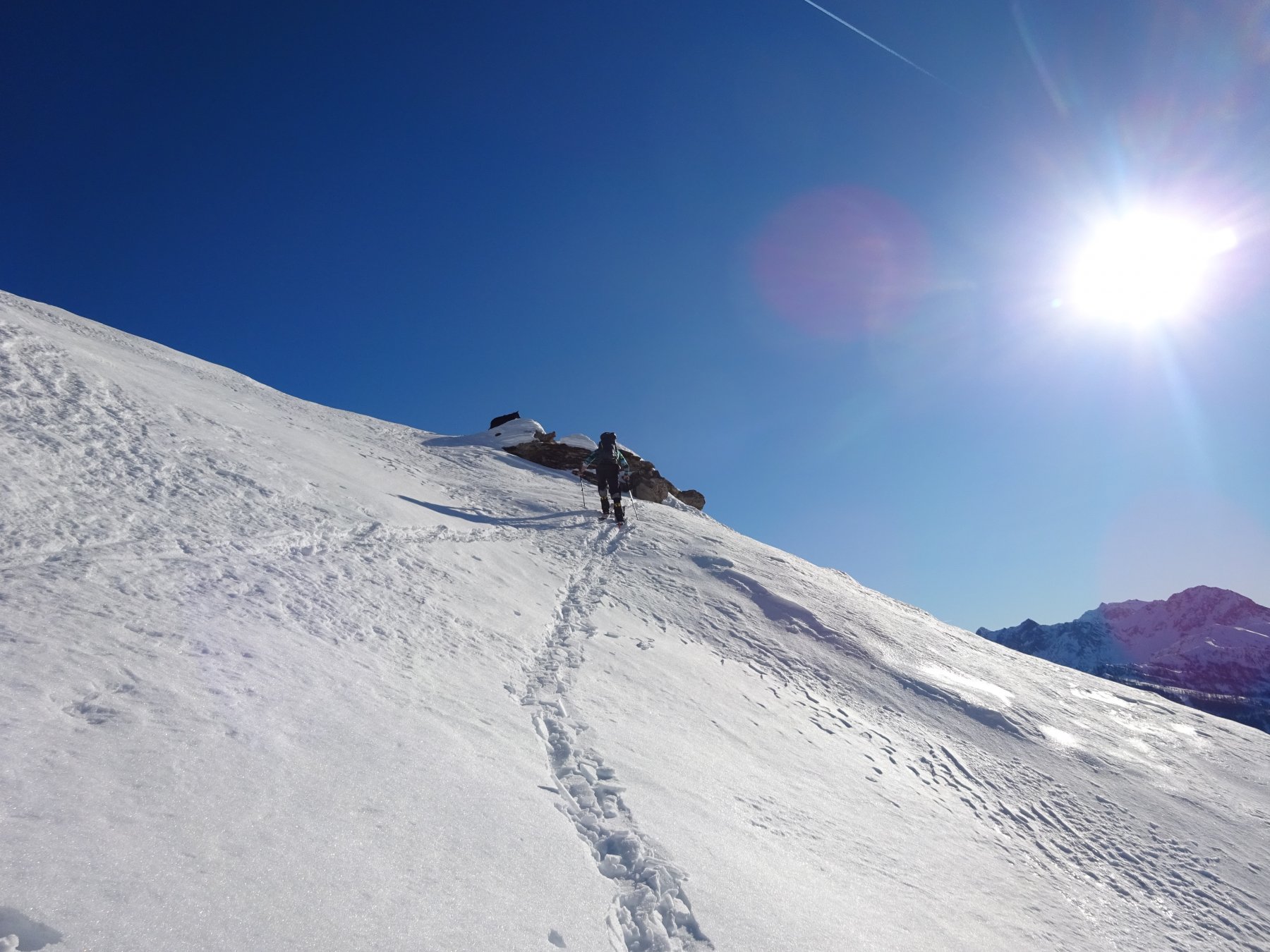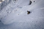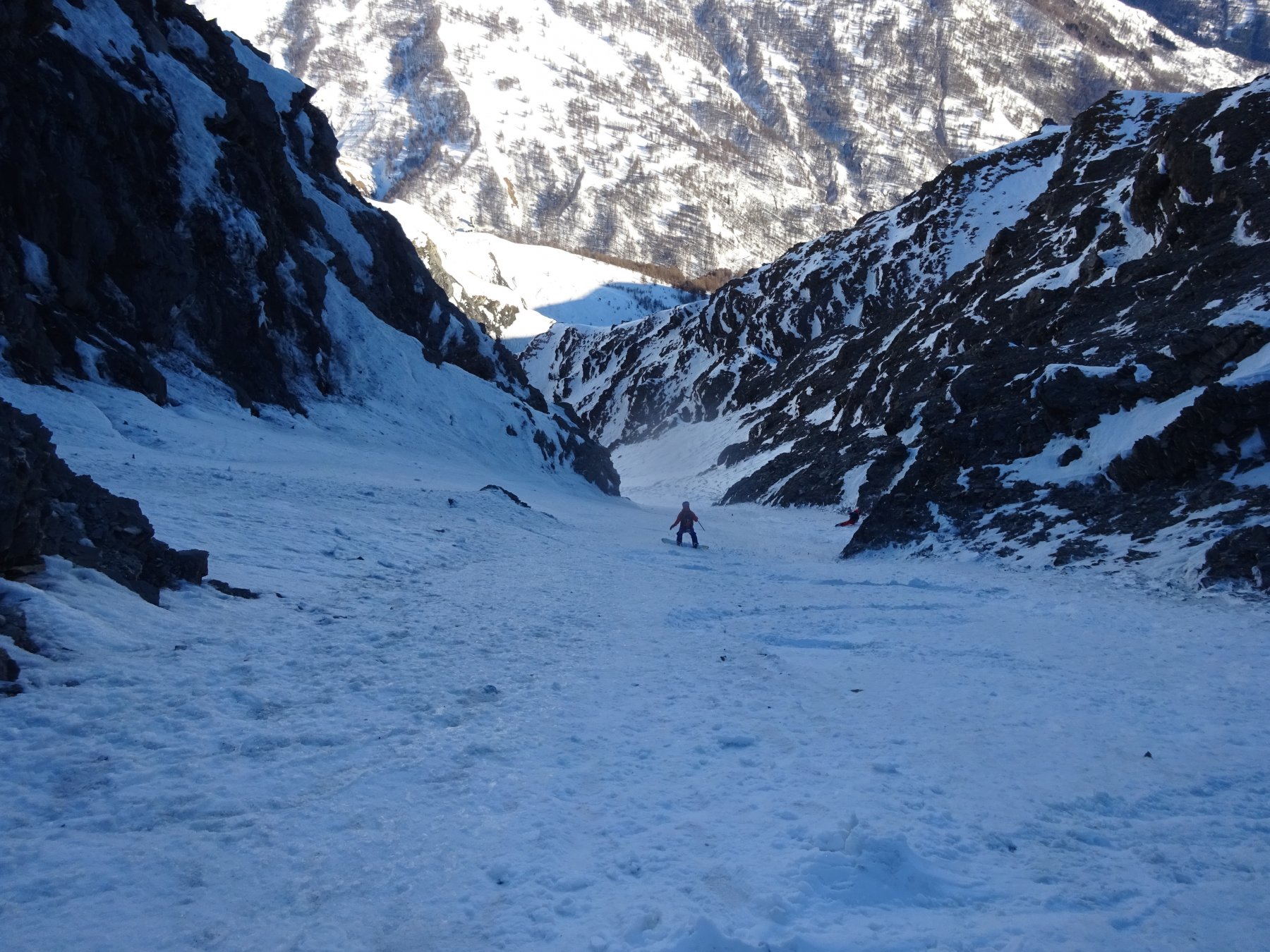 Dopo un centinaio di m. la pendenza molla (40°) ma l’ambiente circostante rimane unico. Ancora più in basso il canale si allarga e si unisce con quello sud est che scende lalla punta Nera (35°, q. 2380 m).