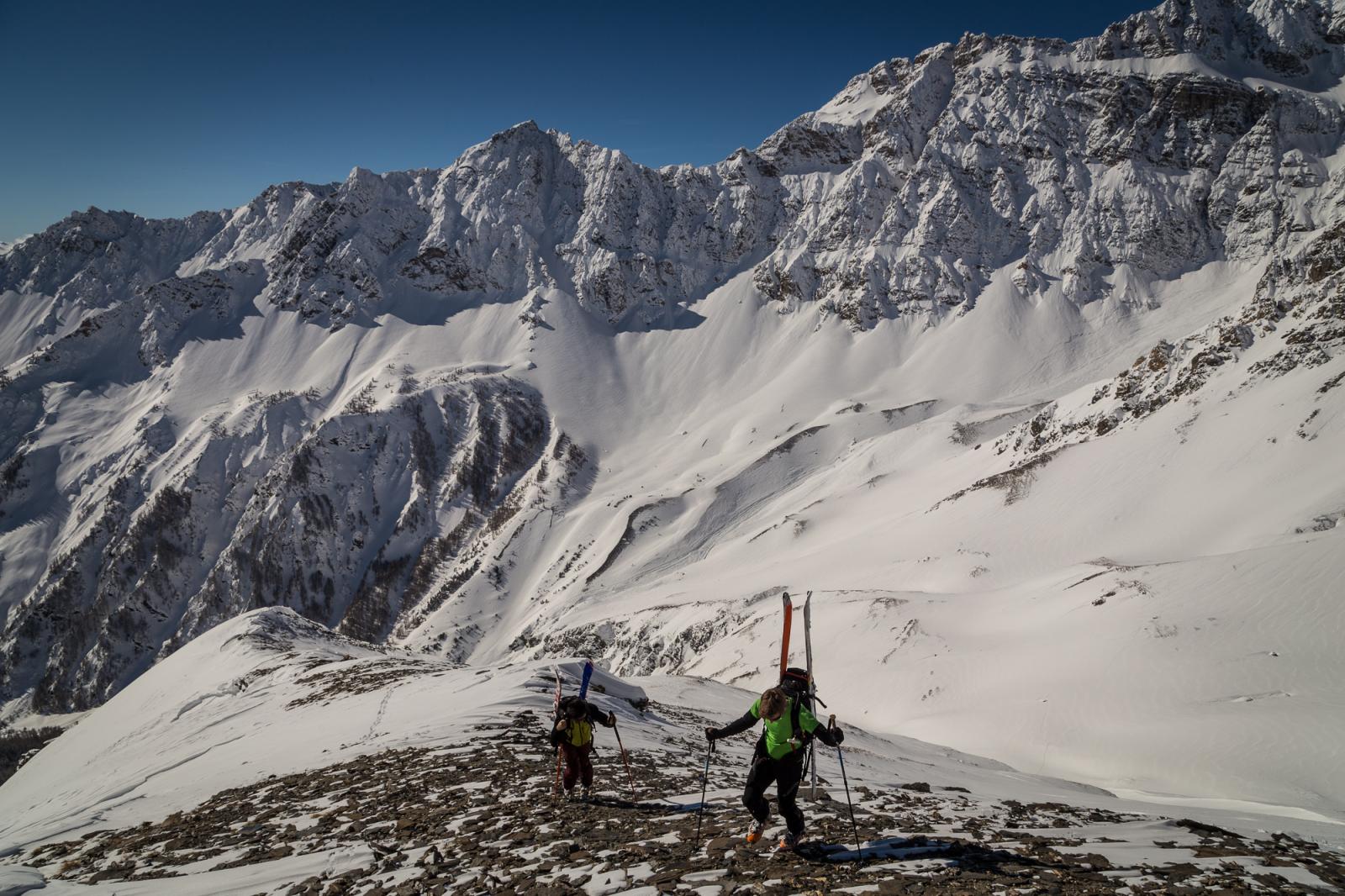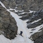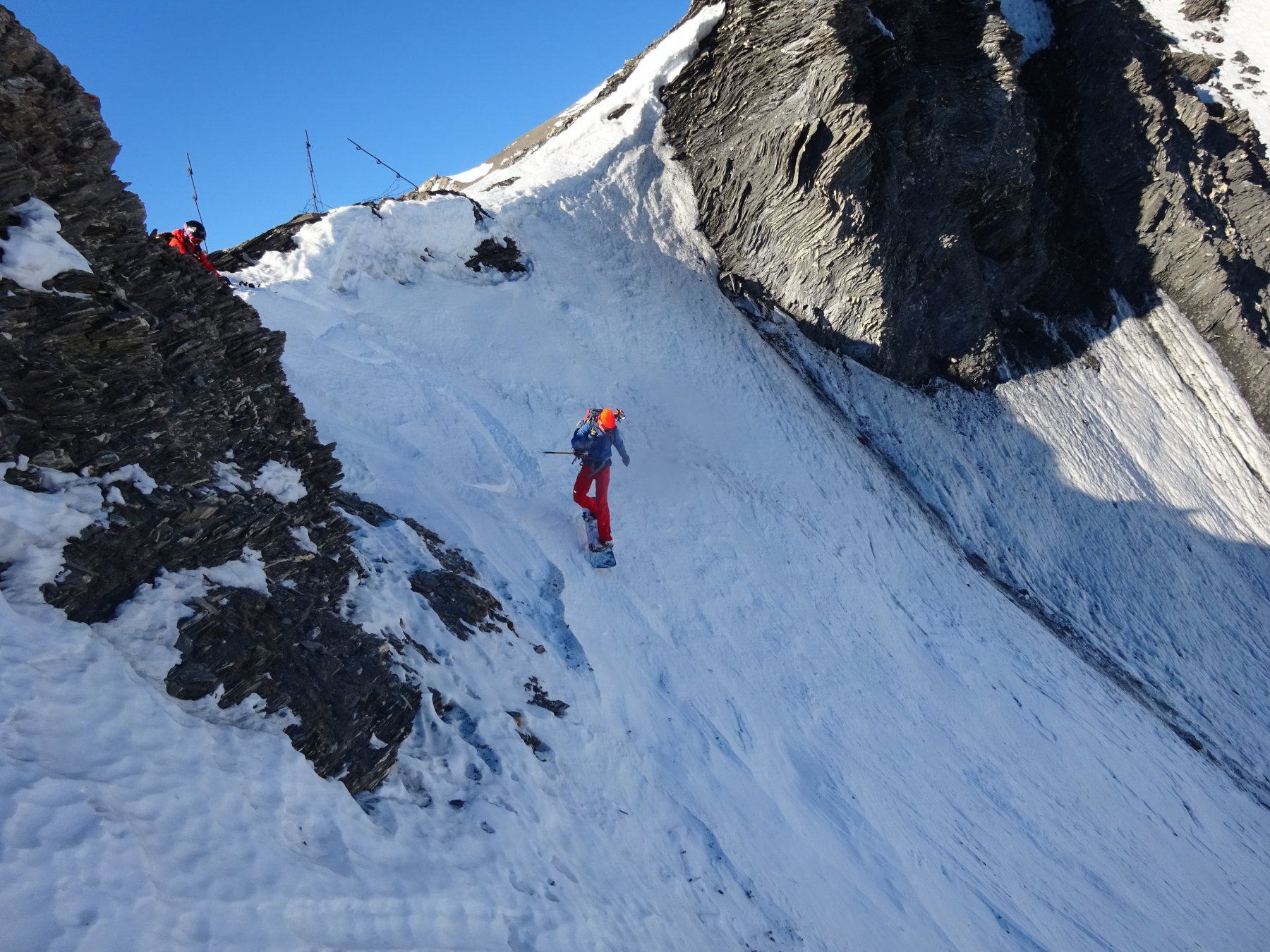 Discesa: entrare nel canale e scendere un primo tratto intorno ai 40°-45° esposto a nord est, incassato tra le pareti di scisti neri degli avancorpi della parete sud della punta nera.
