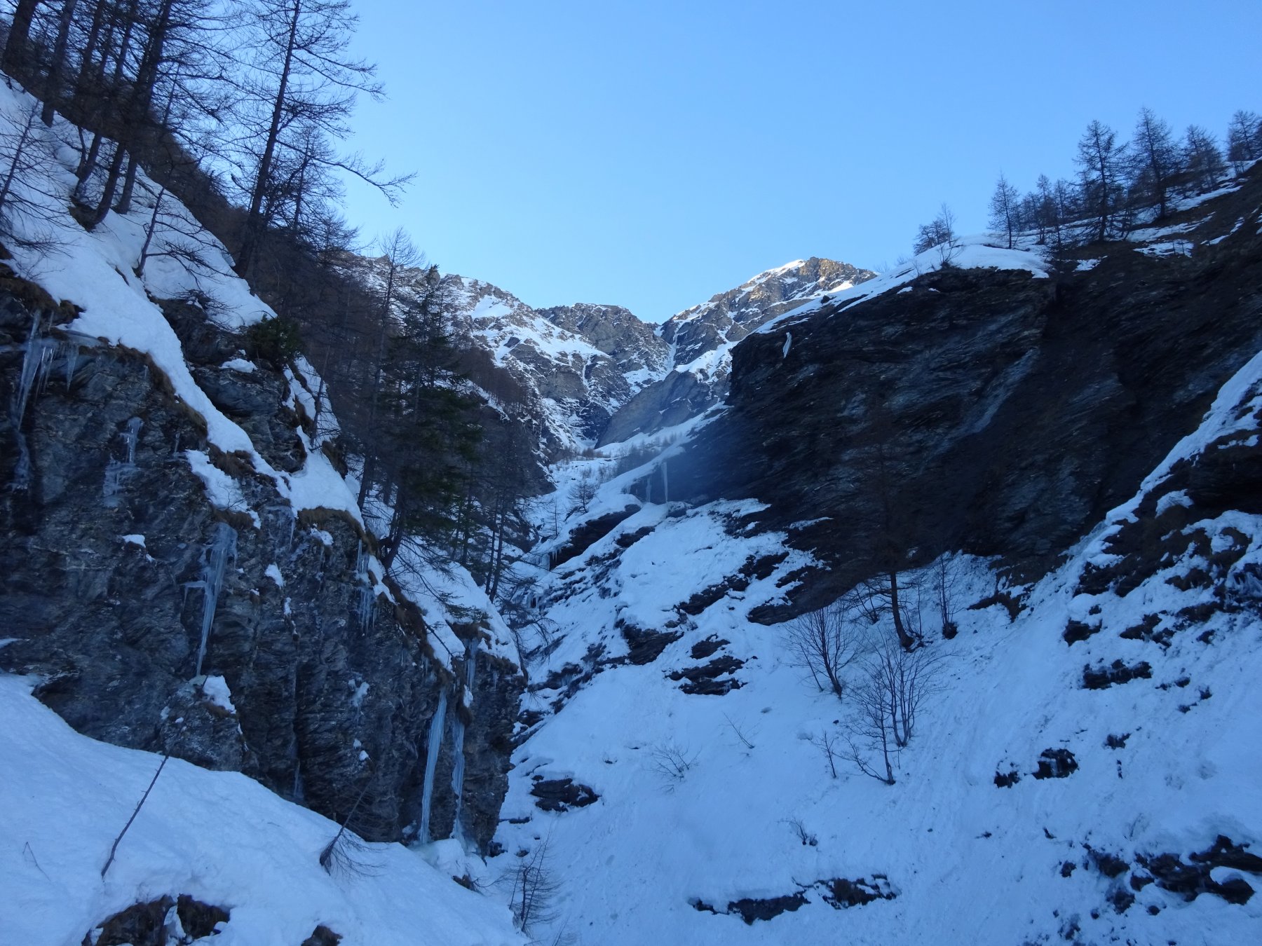 Da qui si prosegue per uno stretto canyon fino ad incontrare, intorno ai 1950 m, un primo salto artificiale da aggirare a sinistra. Poco sotto un secondo salto artificiale si aggira ancora a sinistra, mentre l’ultimo salto, appena prima della strada, si aggira a destra con brecve risalita nel bosco.