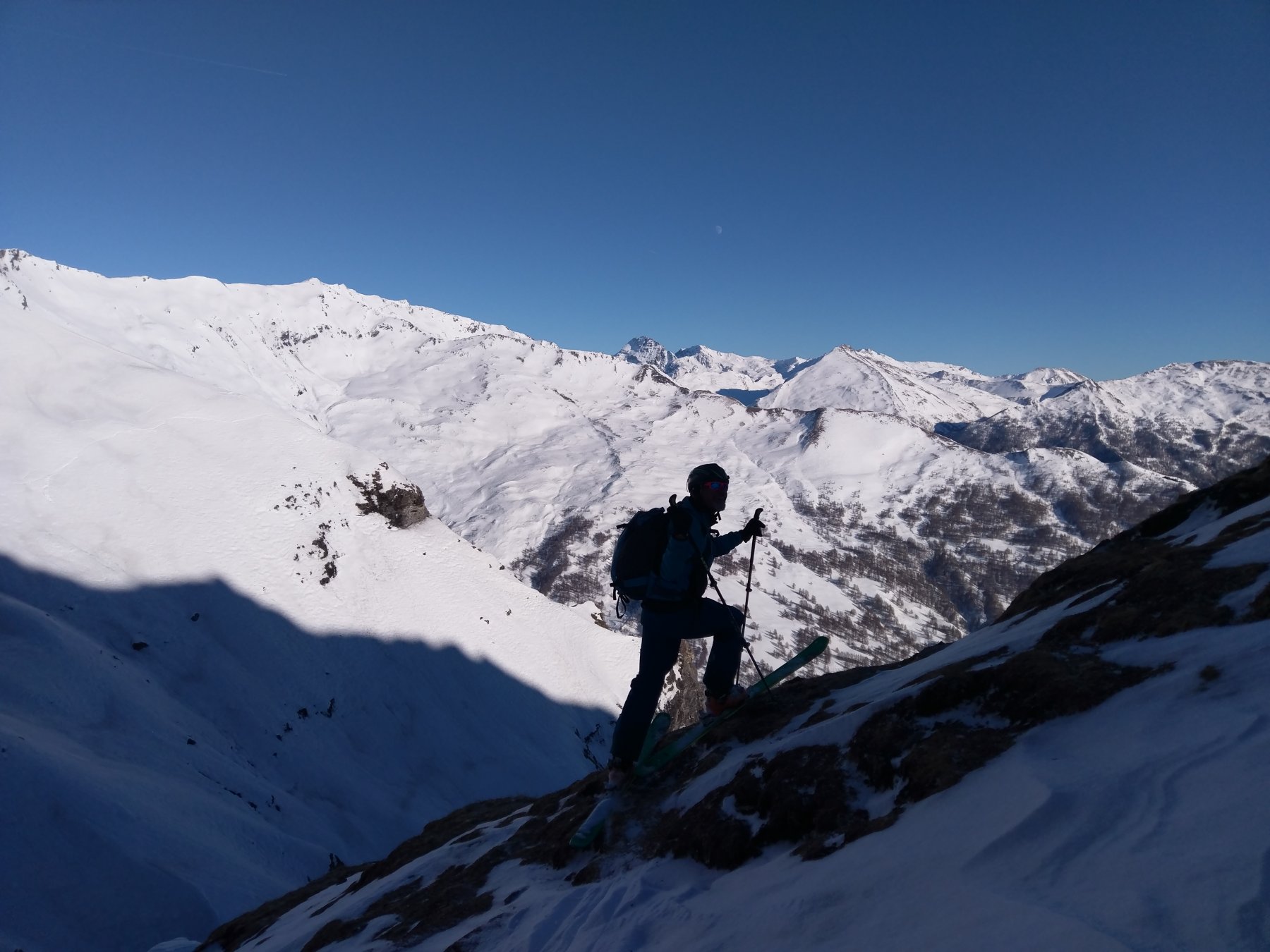 Da qui proseguire per cresta su terreno sassoso, talvolta presenti scisti scivolosi, per raggiungere e superare una punta di sassi sul costone che unisce la Blave alla punta Nera e pervenire ad una selletta da cui parte il canale.