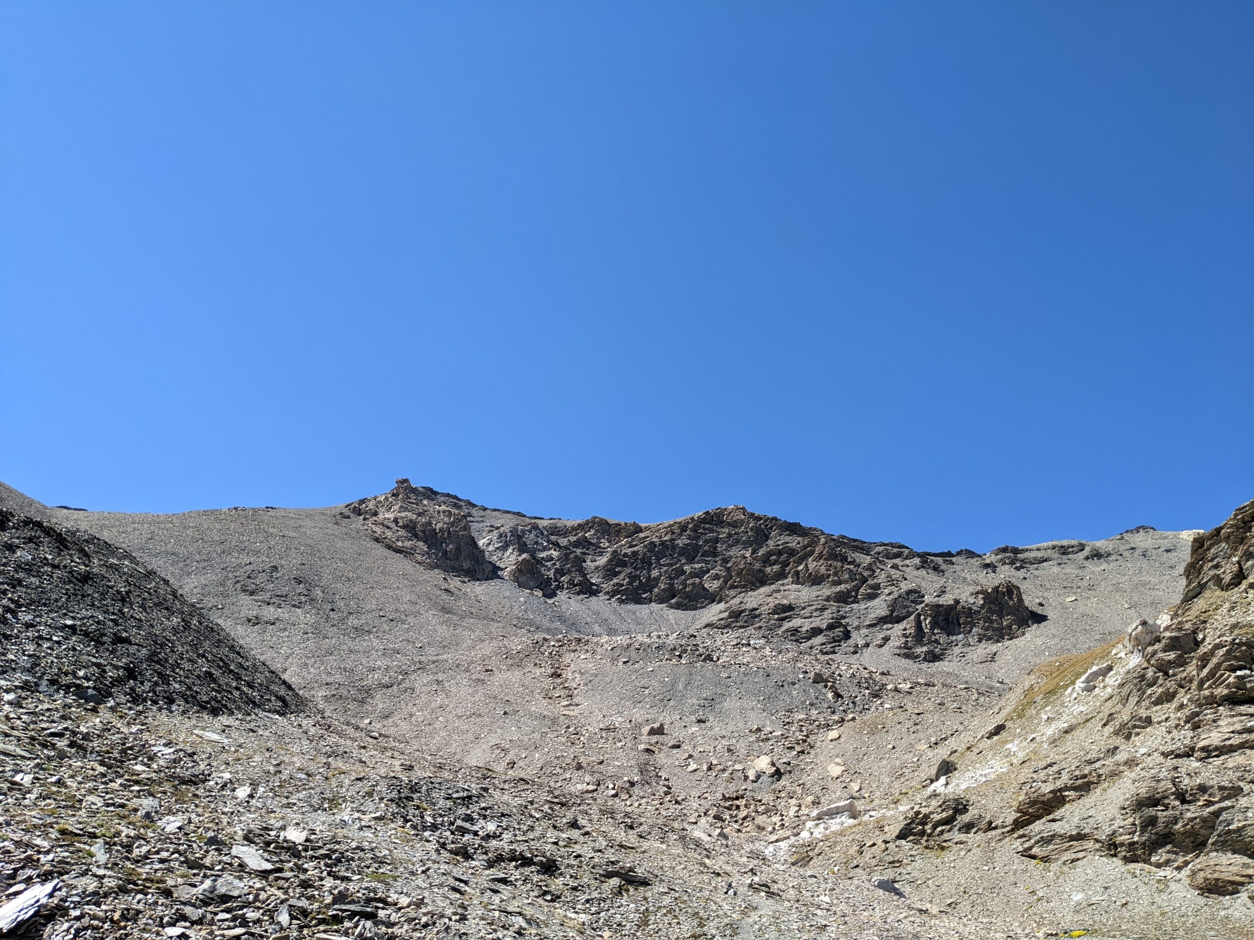 In ogni caso è possibile salire praticamente ovunque sul pendio di detriti più o meno scomodi. Giunti nella parte superiore del pendio puntare decisamente al colletto (quota ~3000 m) che divide le due punte senza lasciarsi tentare dalle vie più dirette; giunti al colletto si apre una vista spettacolare!