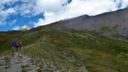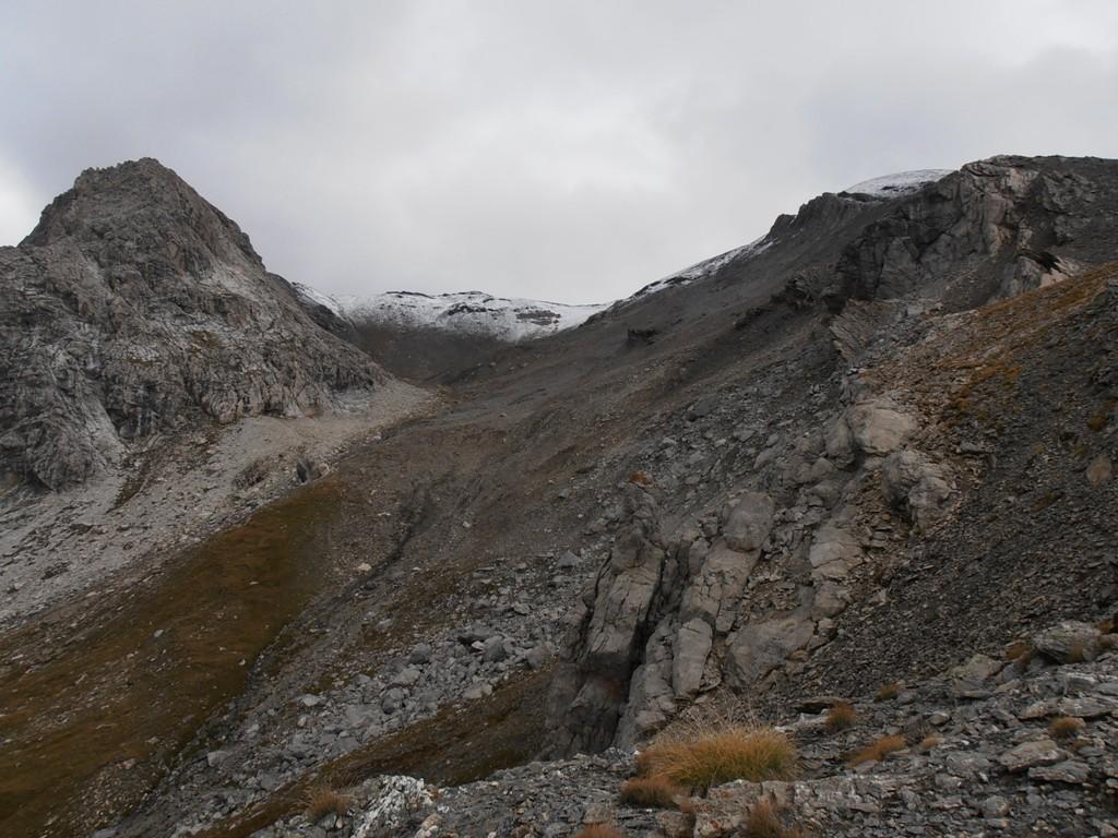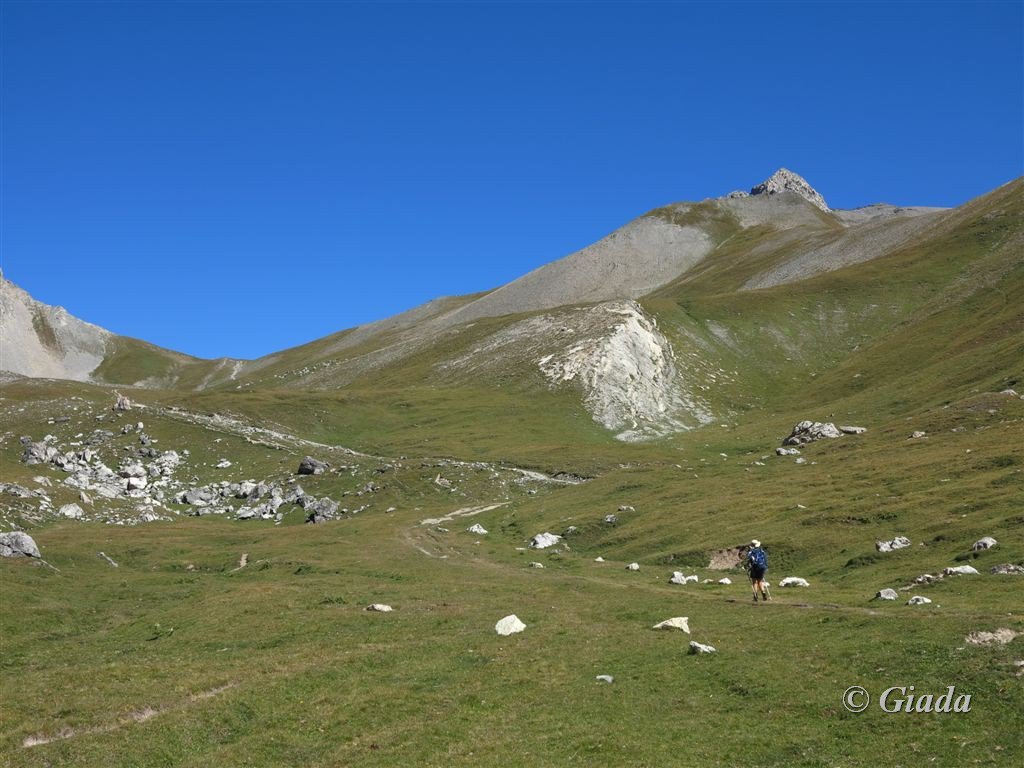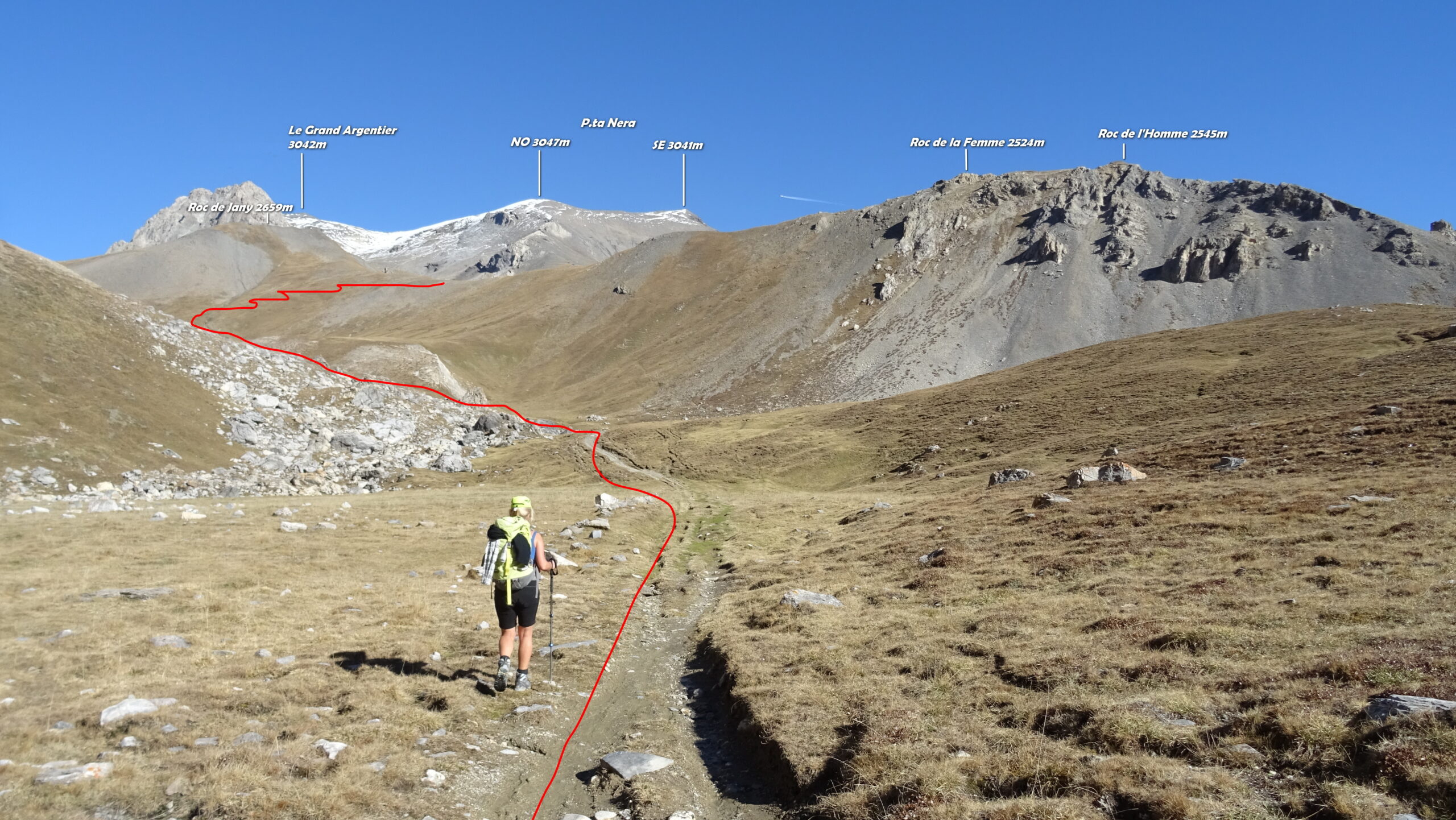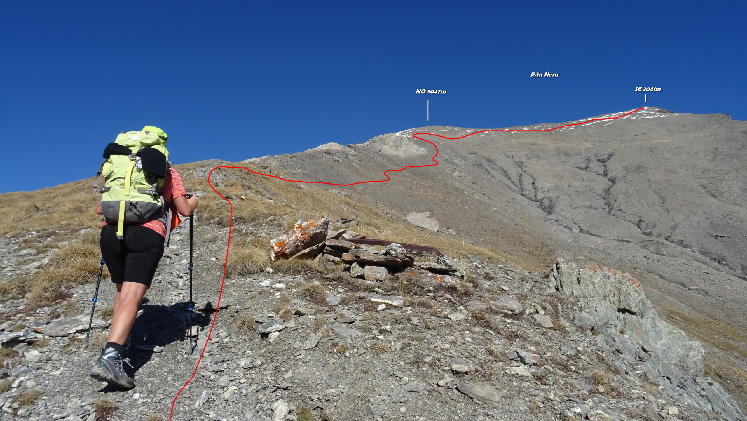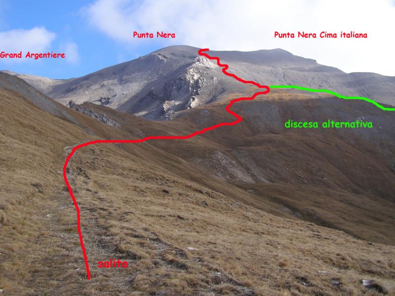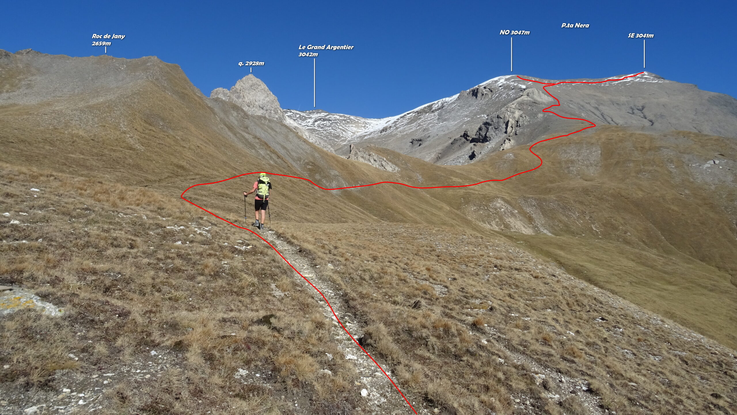 Si attraversa quindi il Piano dei Morti in direzione del Colle della Rho, ; Si incontra una palina – dopo circa 50 metri si volge a dx su una traccia che scavalca la dorsale sotto il Roc de Jany, continua per un tratto parallela alla cresta S-O, spostandosi poi sul versante che risale a strette svolte in direzione della lieve depressione fra la q. 3047 m e la Punta Nera.