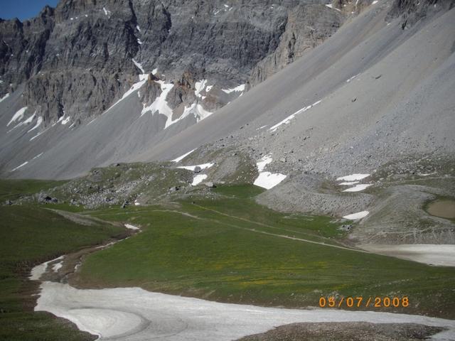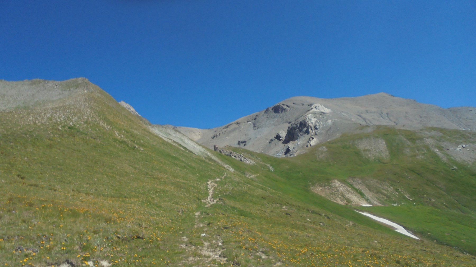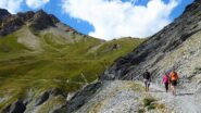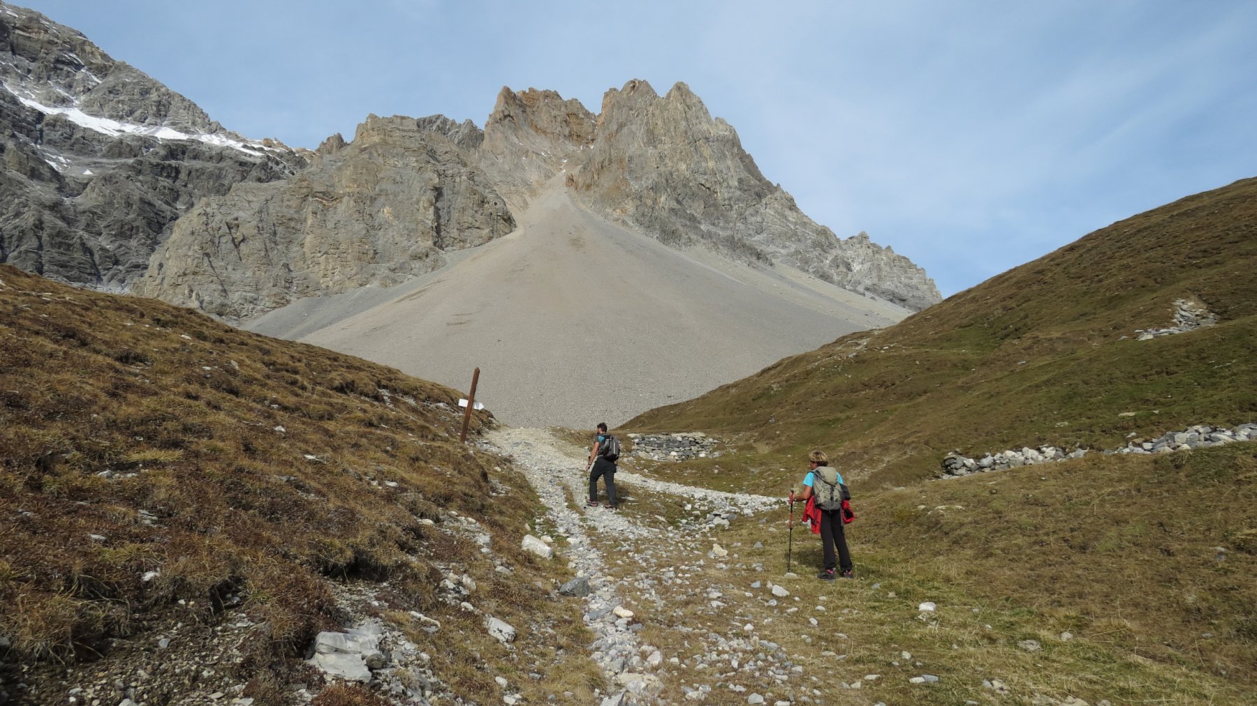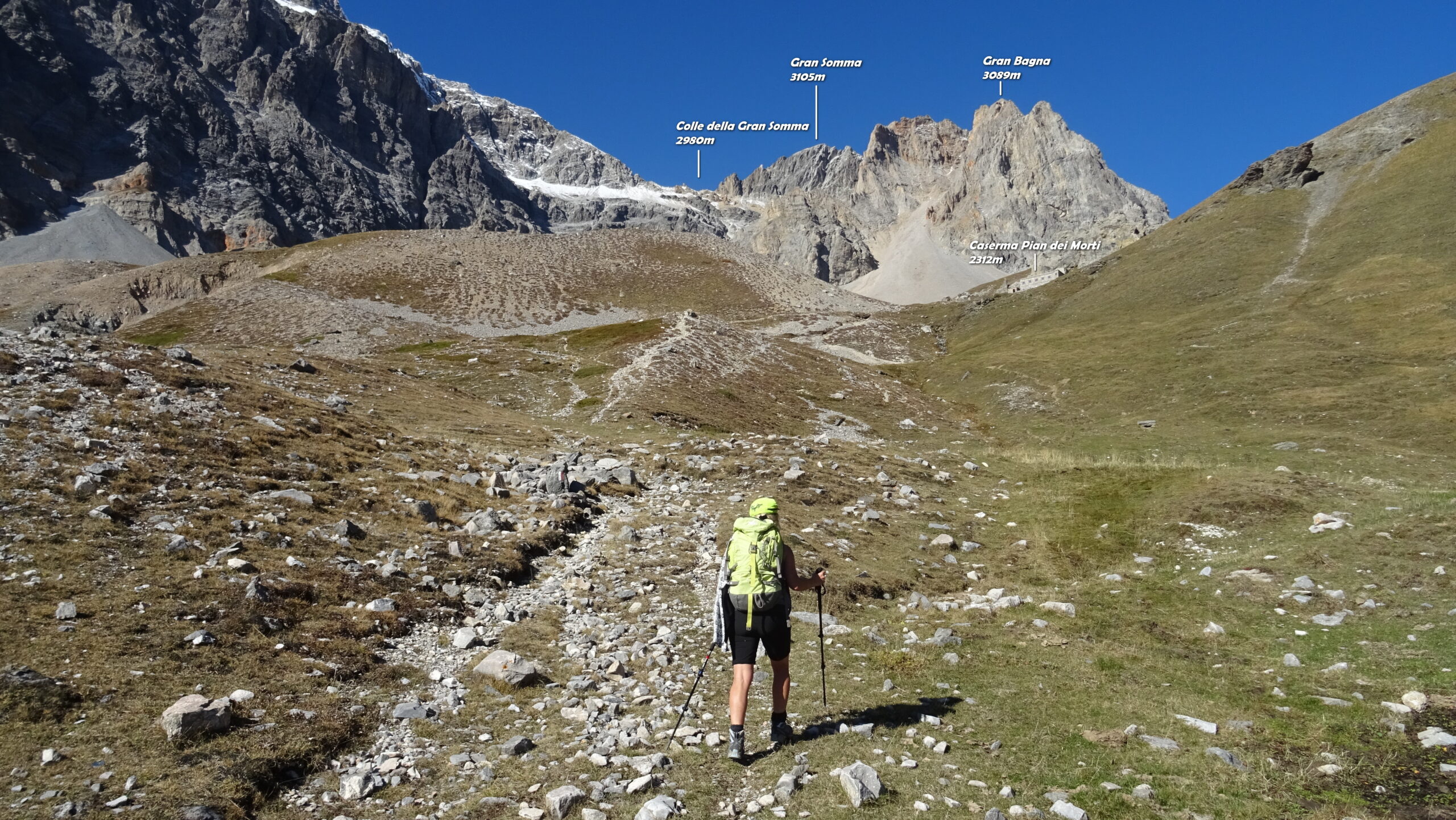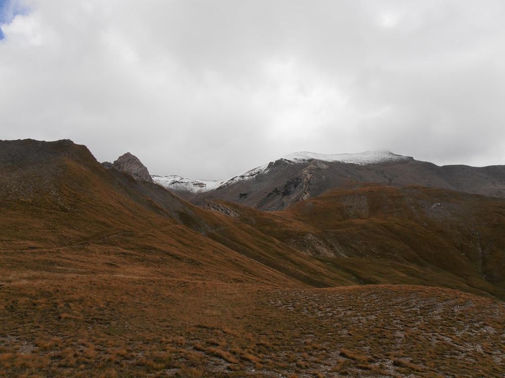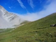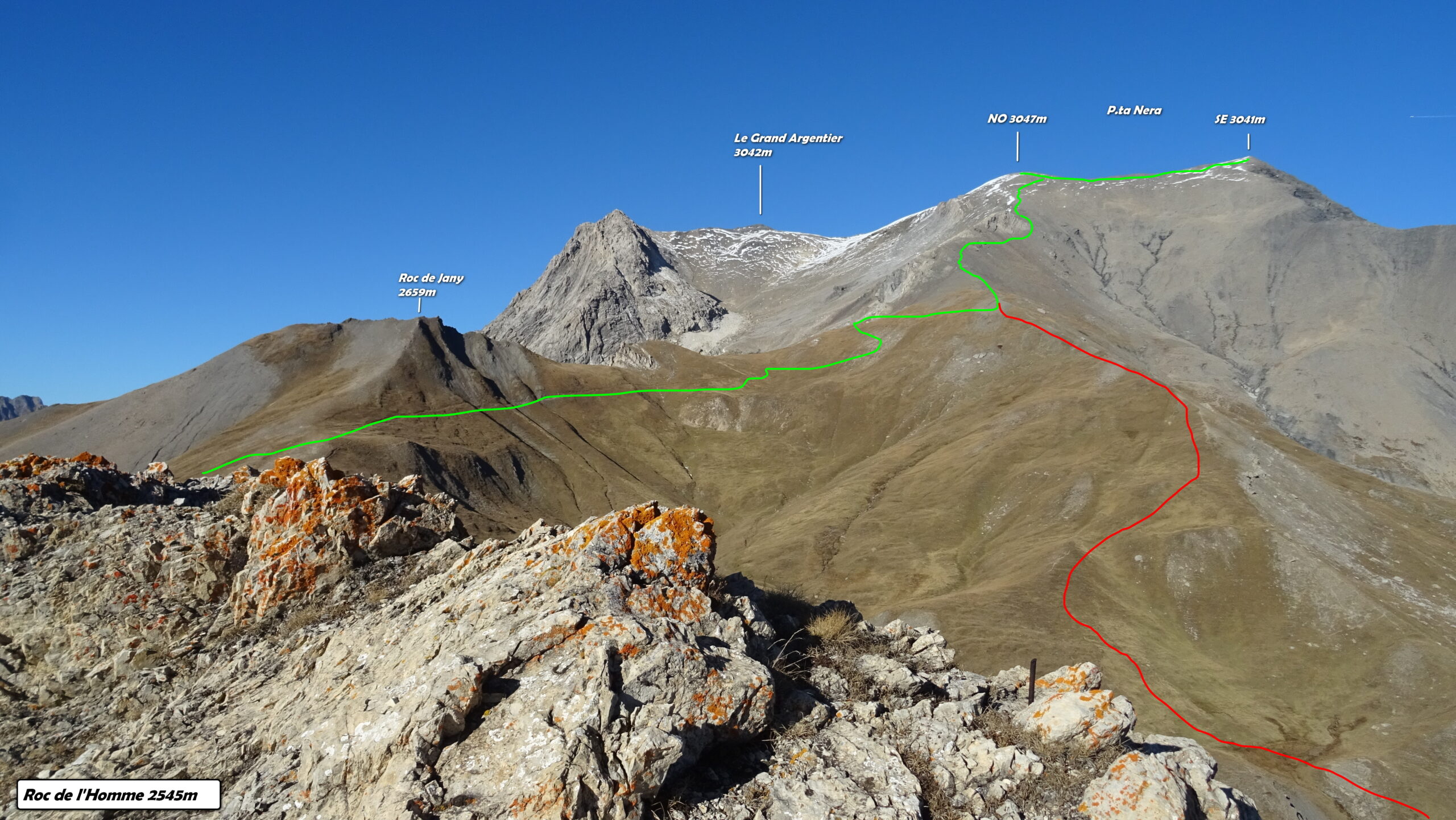 Si attraversa quindi il Piano dei Morti in direzione del Colle della Rho, ; Si incontra una palina – dopo circa 50 metri si volge a dx su una traccia che scavalca la dorsale sotto il Roc de Jany, continua per un tratto parallela alla cresta S-O, spostandosi poi sul versante che risale a strette svolte in direzione della lieve depressione fra la q. 3047 m e la Punta Nera.