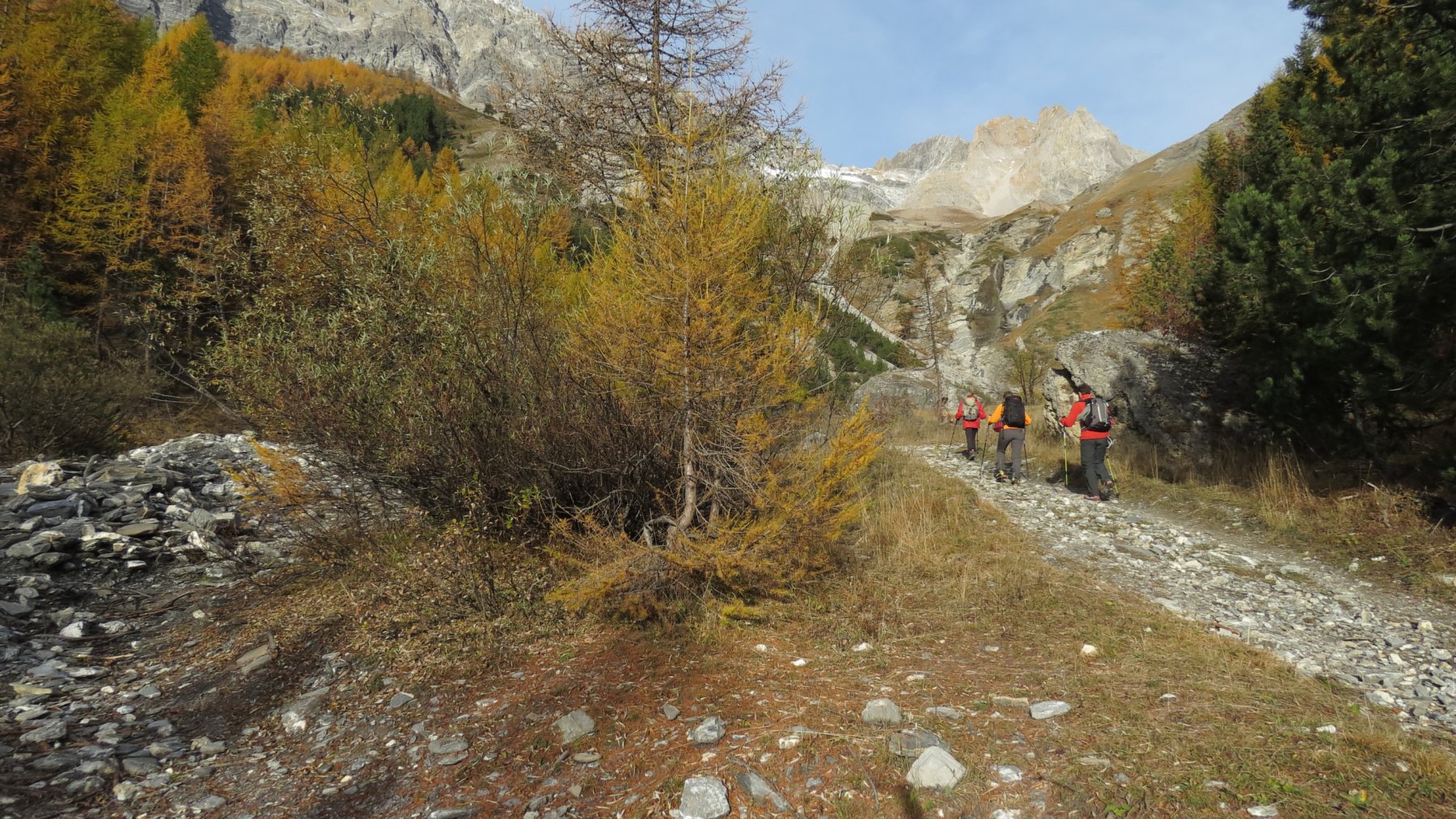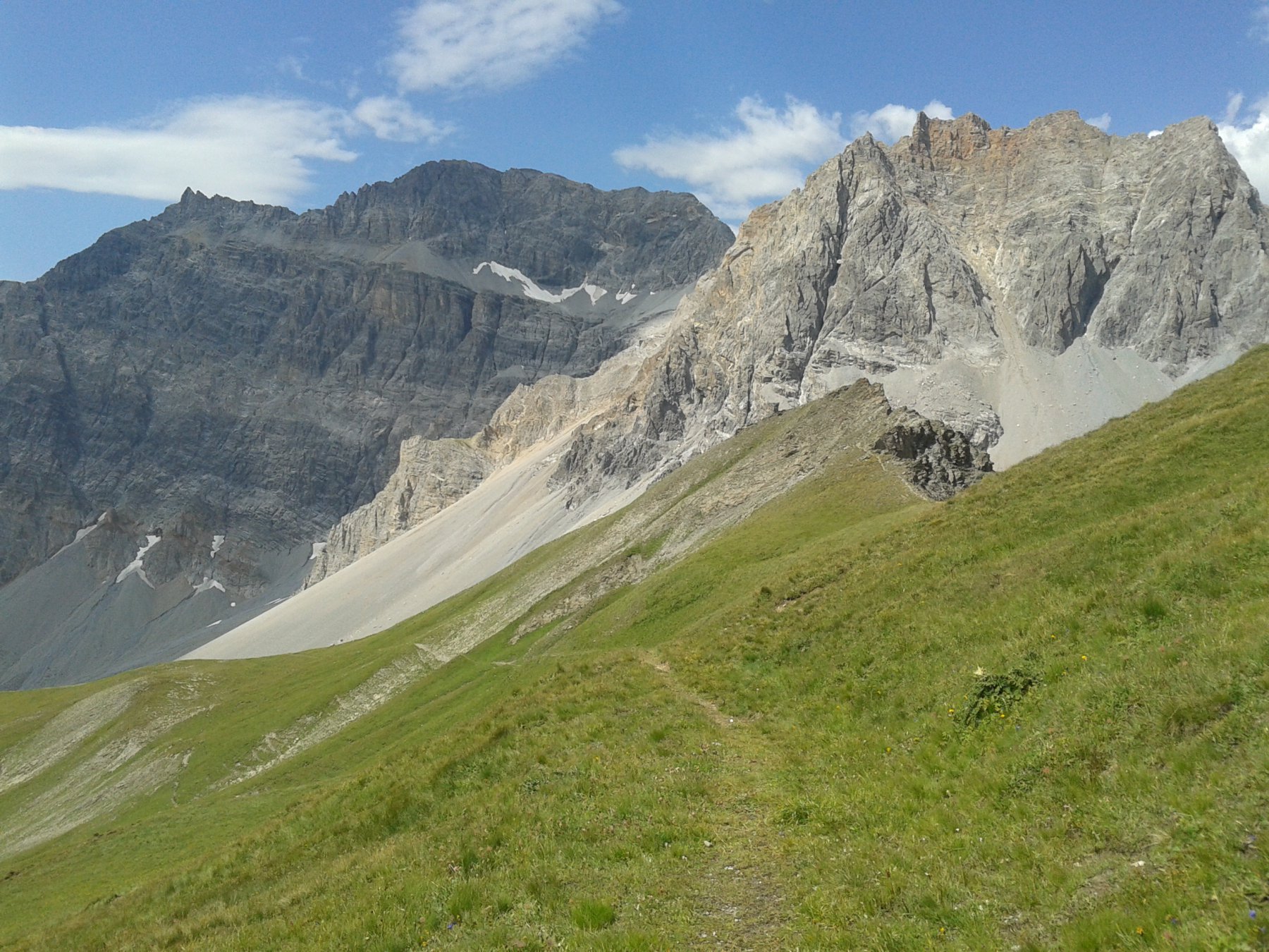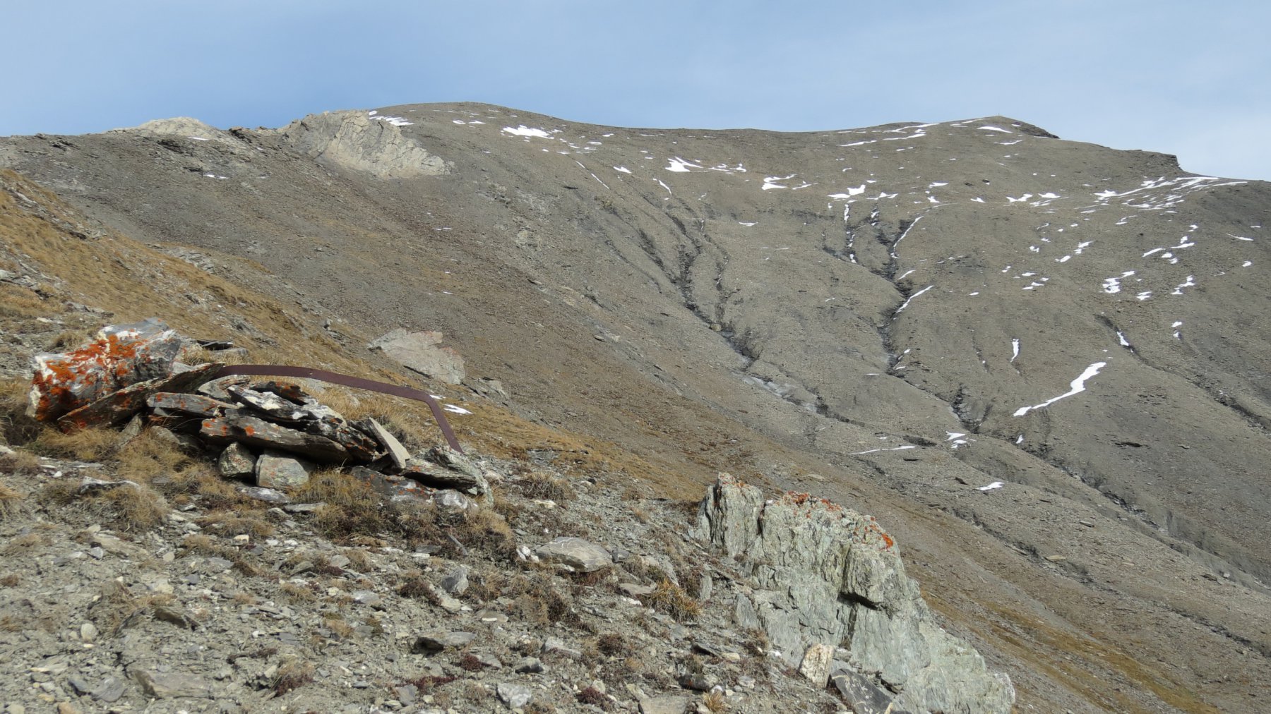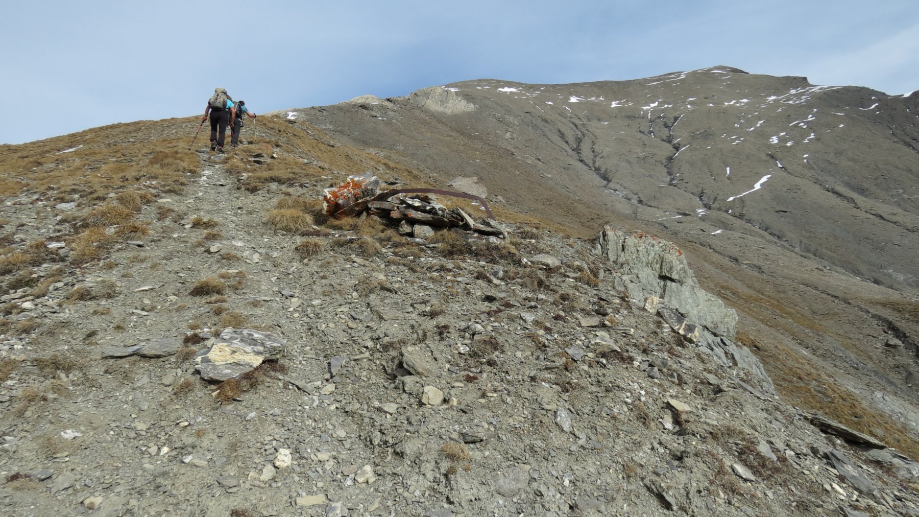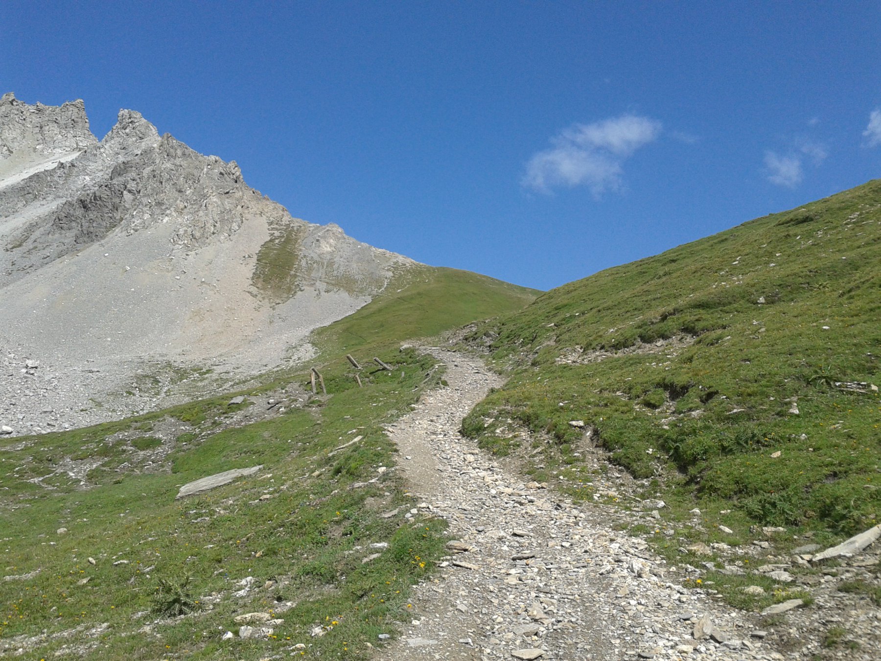Si attraversa quindi il Piano dei Morti in direzione del Colle della Rho, ; Si incontra una palina – dopo circa 50 metri si volge a dx su una traccia che scavalca la dorsale sotto il Roc de Jany, continua per un tratto parallela alla cresta S-O, spostandosi poi sul versante che risale a strette svolte in direzione della lieve depressione fra la q. 3047 m e la Punta Nera.