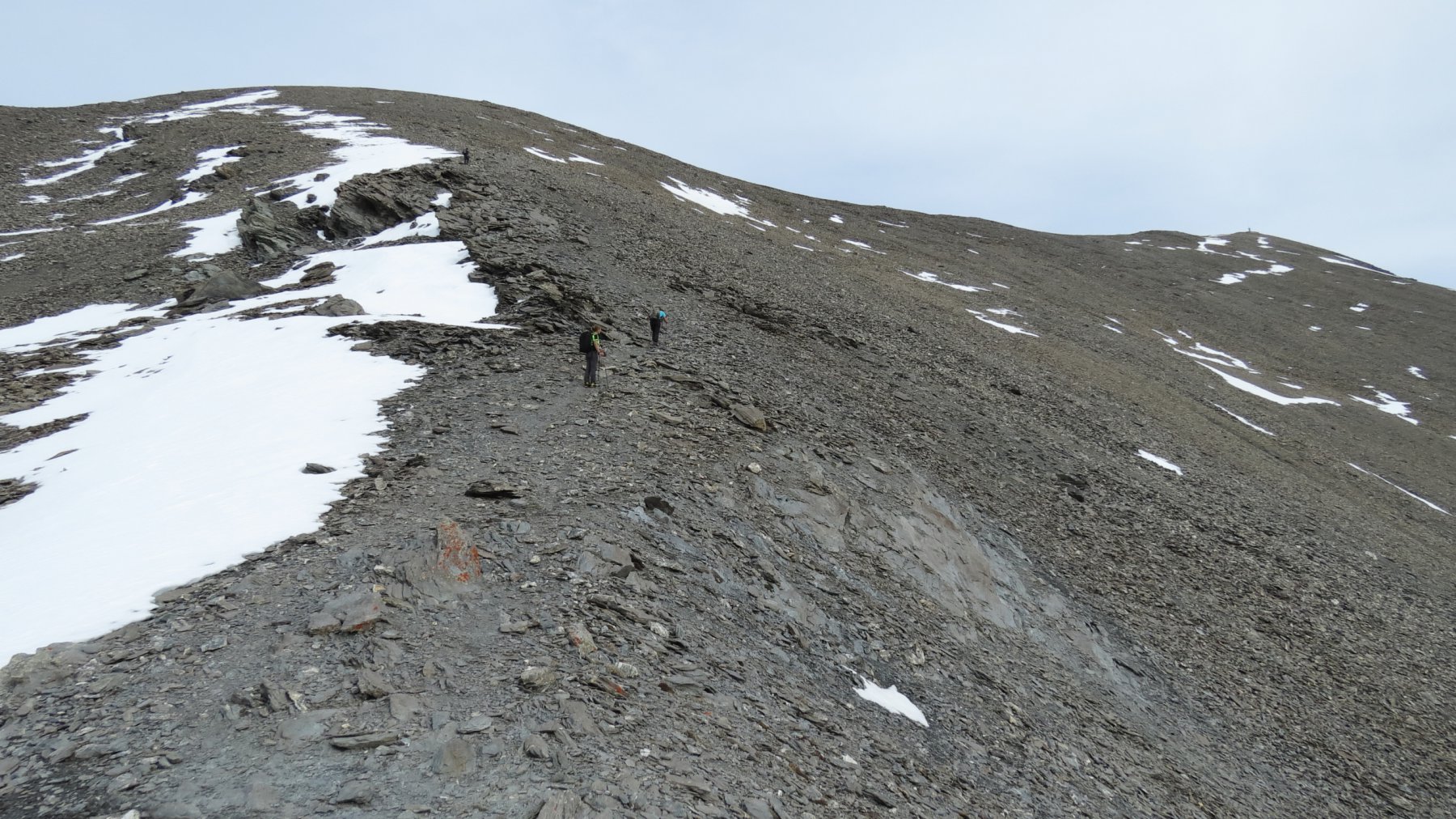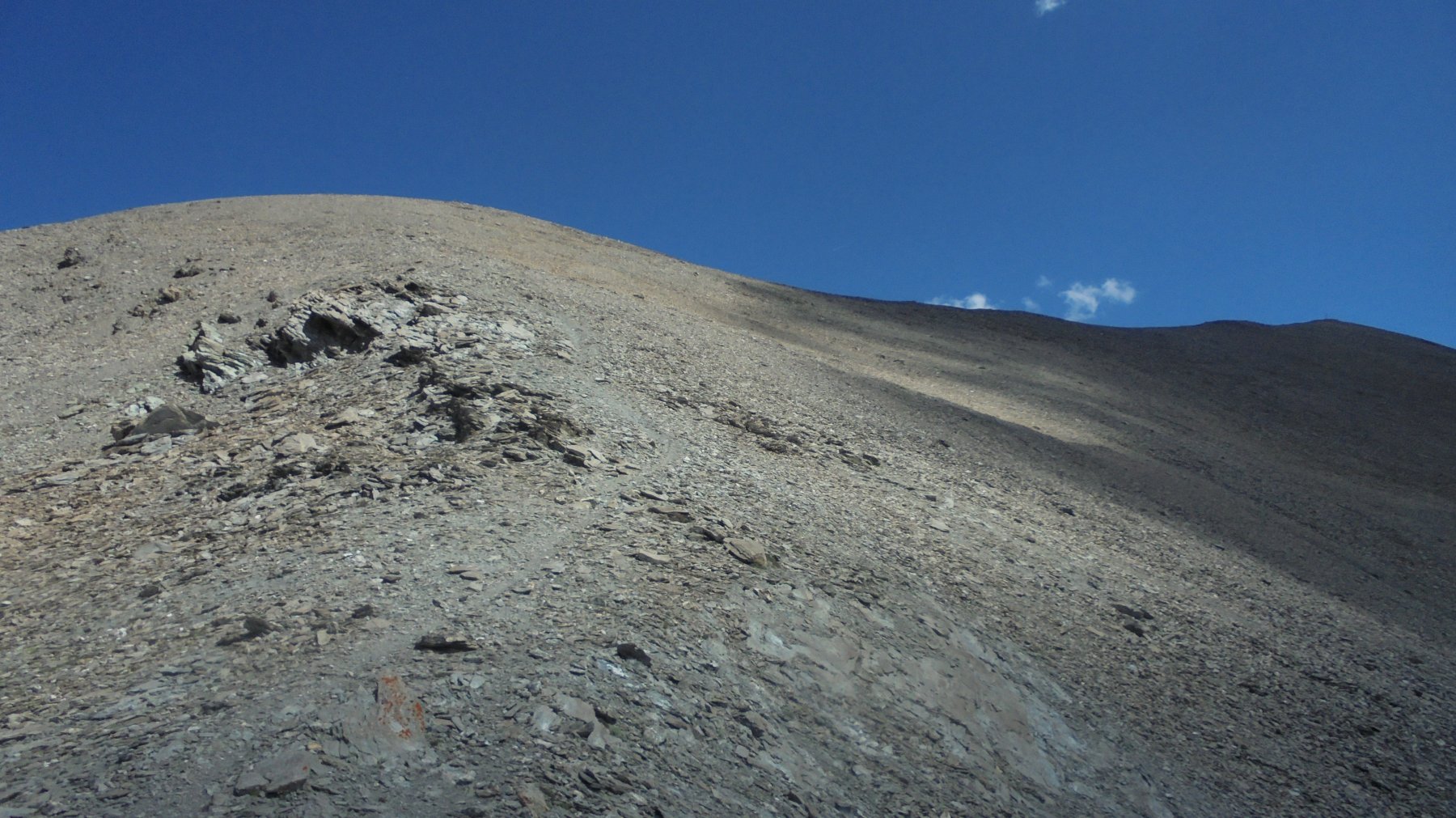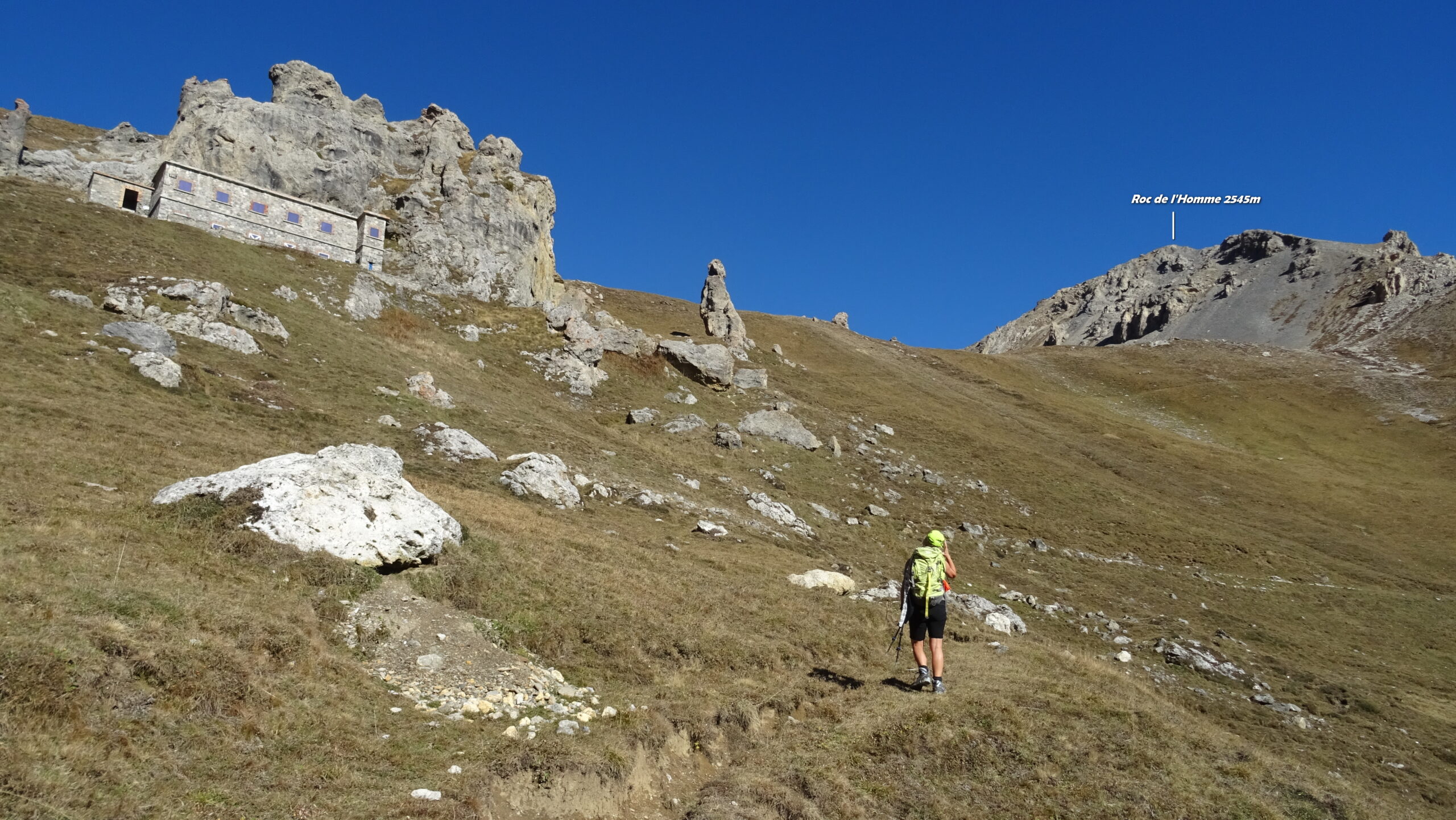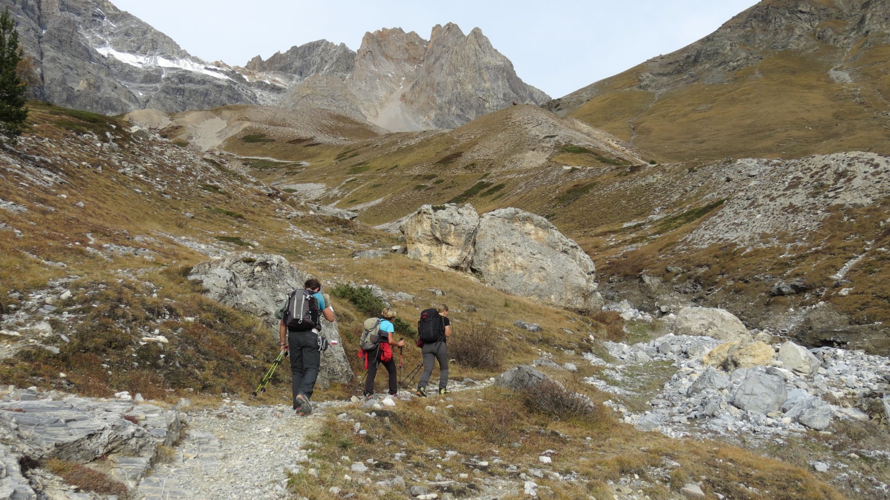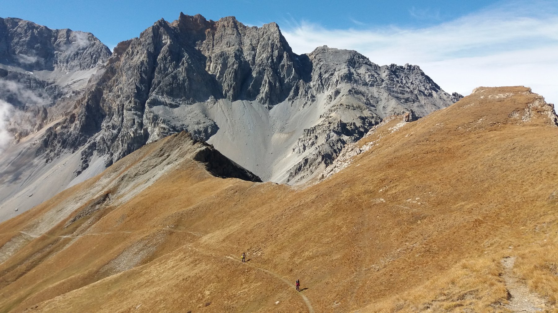 Si attraversa quindi il Piano dei Morti in direzione del Colle della Rho, ; Si incontra una palina – dopo circa 50 metri si volge a dx su una traccia che scavalca la dorsale sotto il Roc de Jany, continua per un tratto parallela alla cresta S-O, spostandosi poi sul versante che risale a strette svolte in direzione della lieve depressione fra la q. 3047 m e la Punta Nera.