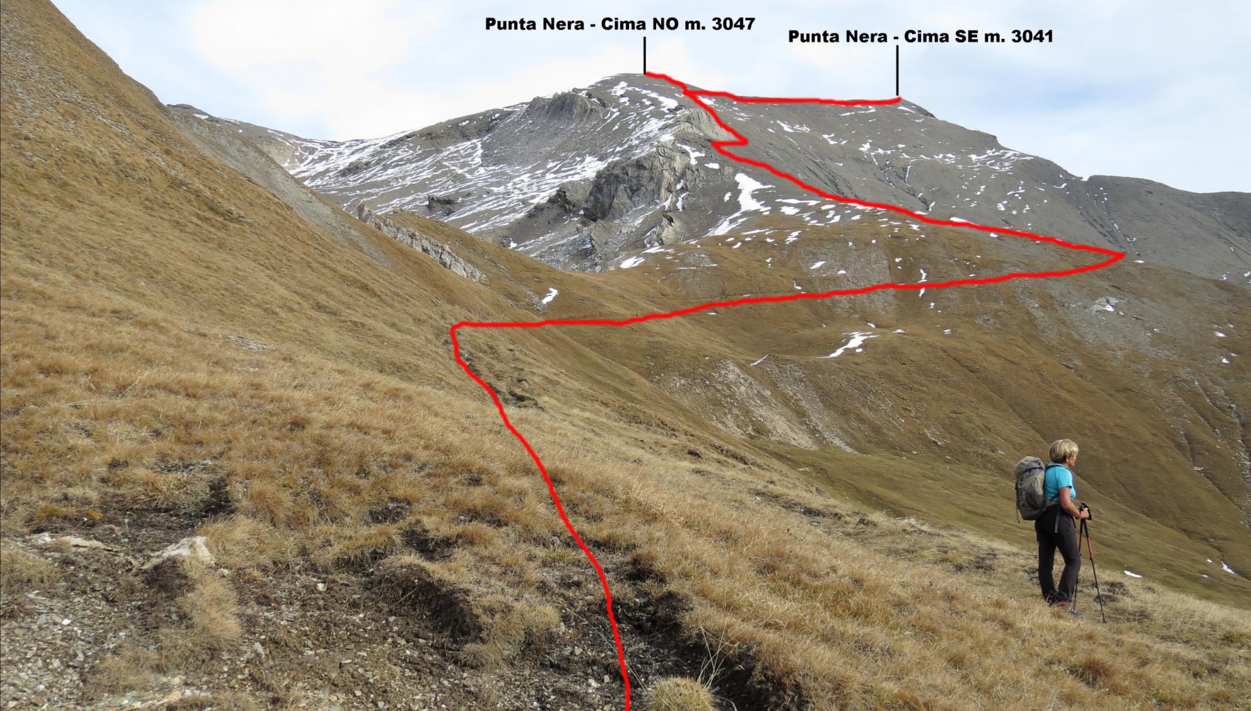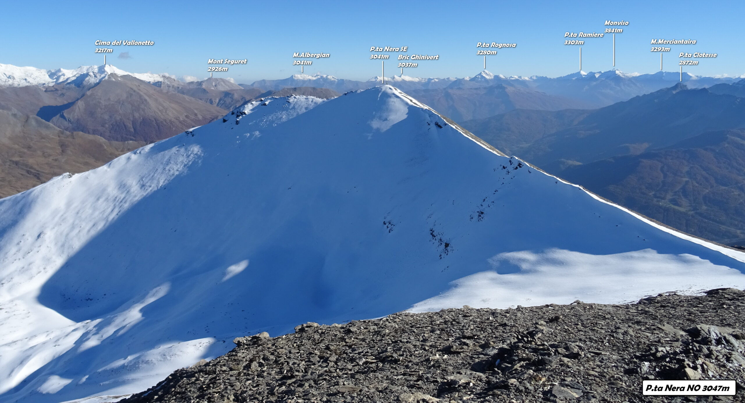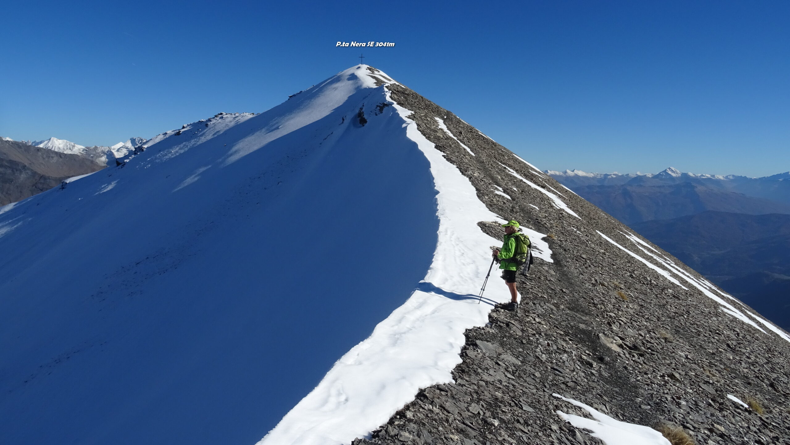 Volgendo a dx si tocca in breve la Punta Nera (croce di vetta); piegando invece a sx si raggiunge la q. 3047 m (segnale dell’IGN).