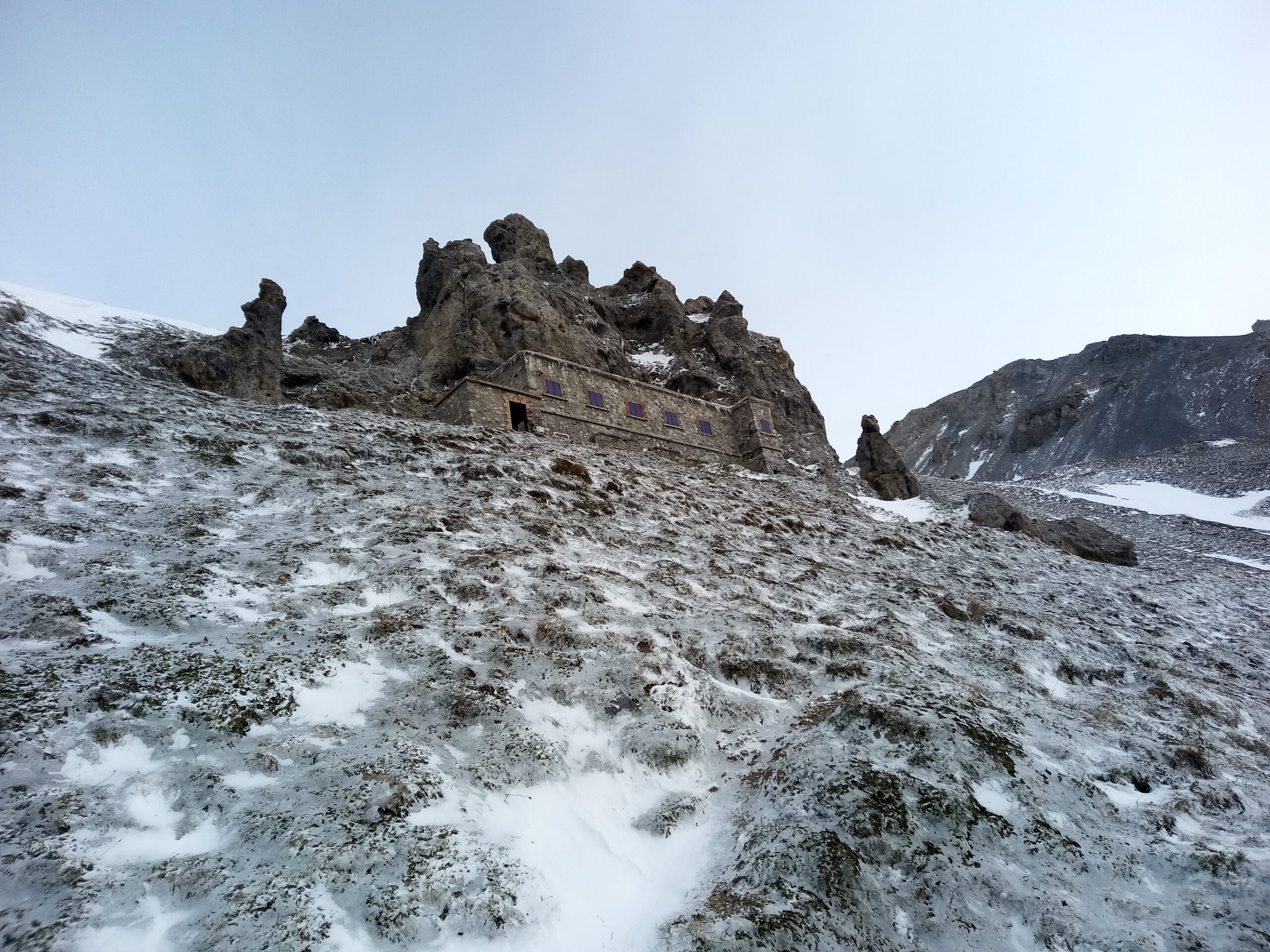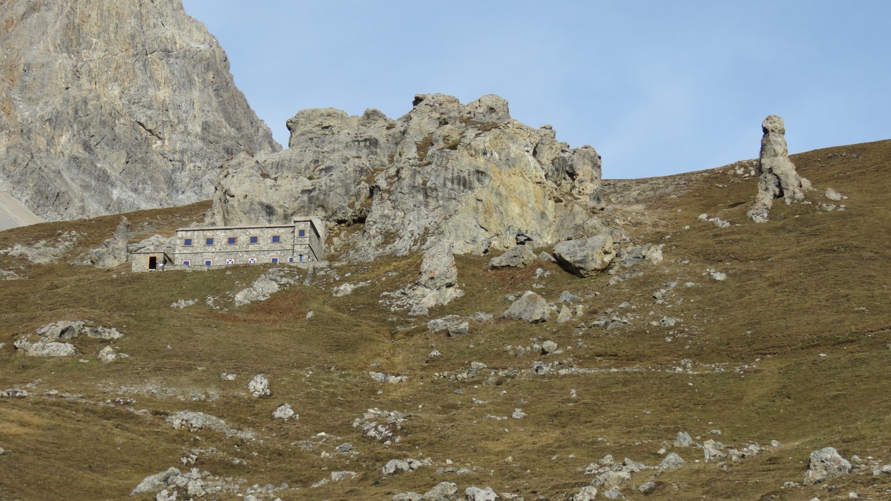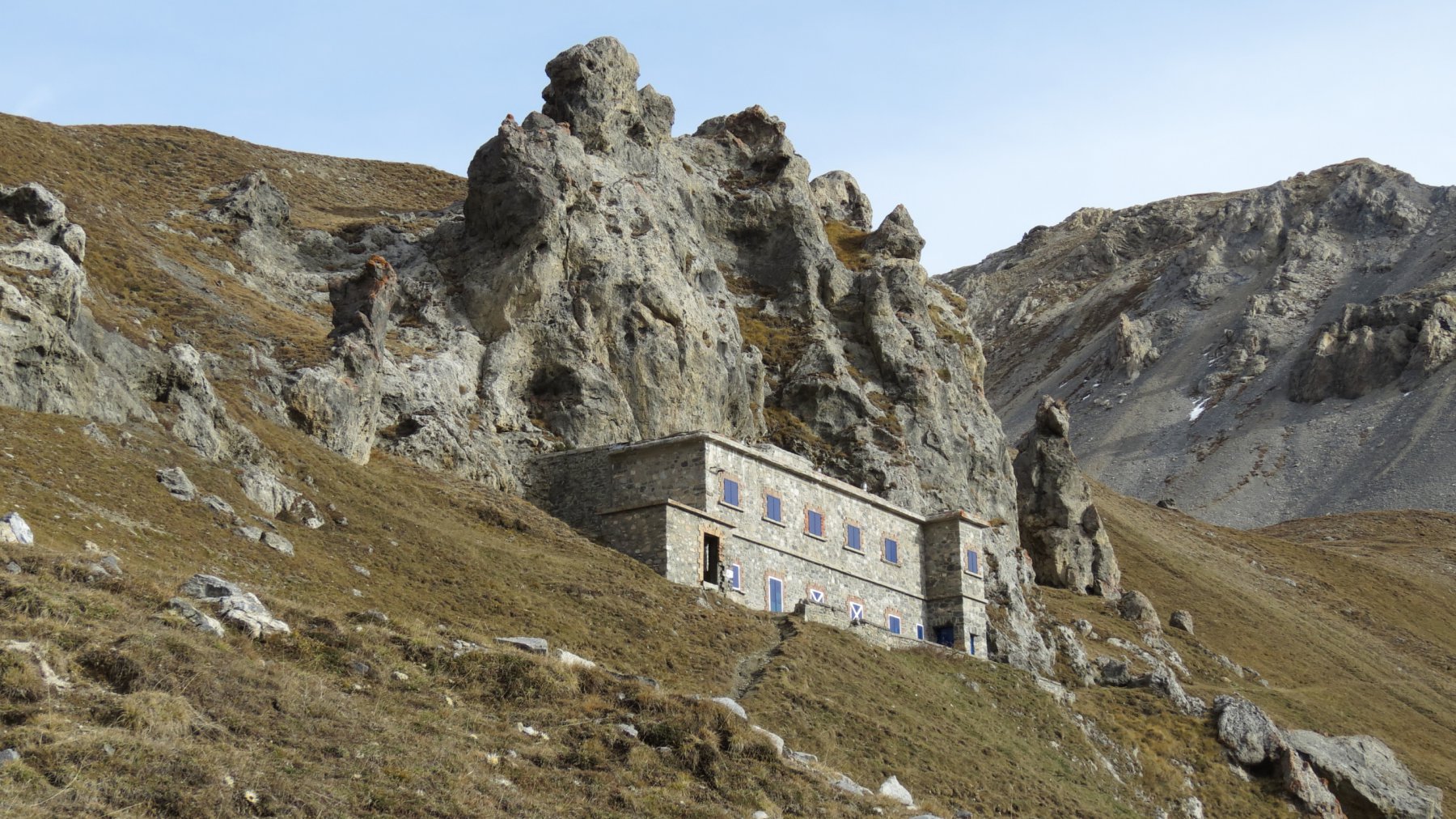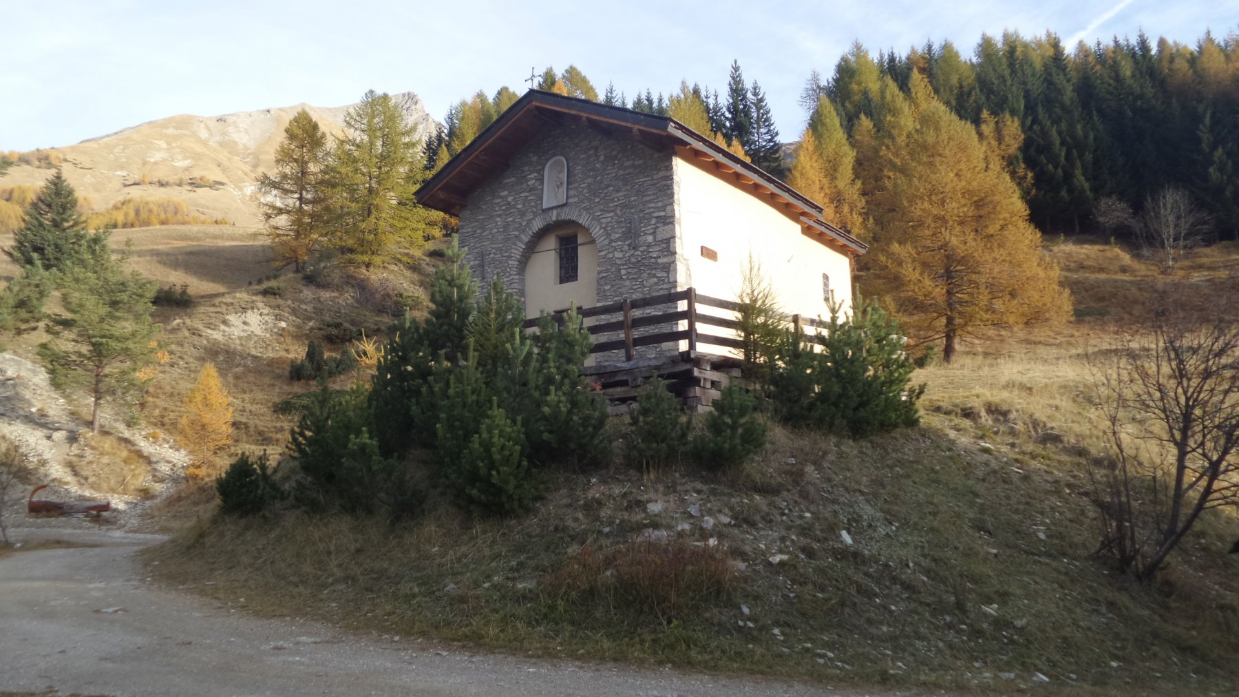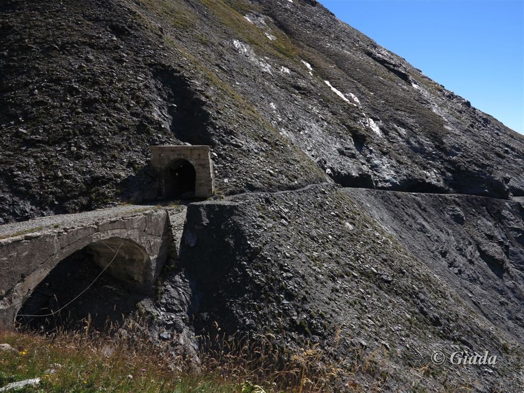 La mulattiera (?) molto pietrosa (interessata da lavori per l’acquedotto) prende quota e raggiunge un pianoro dove si riattraversa il torrente. Si rimonta un costone e si raggiunge la caserma soprastante.