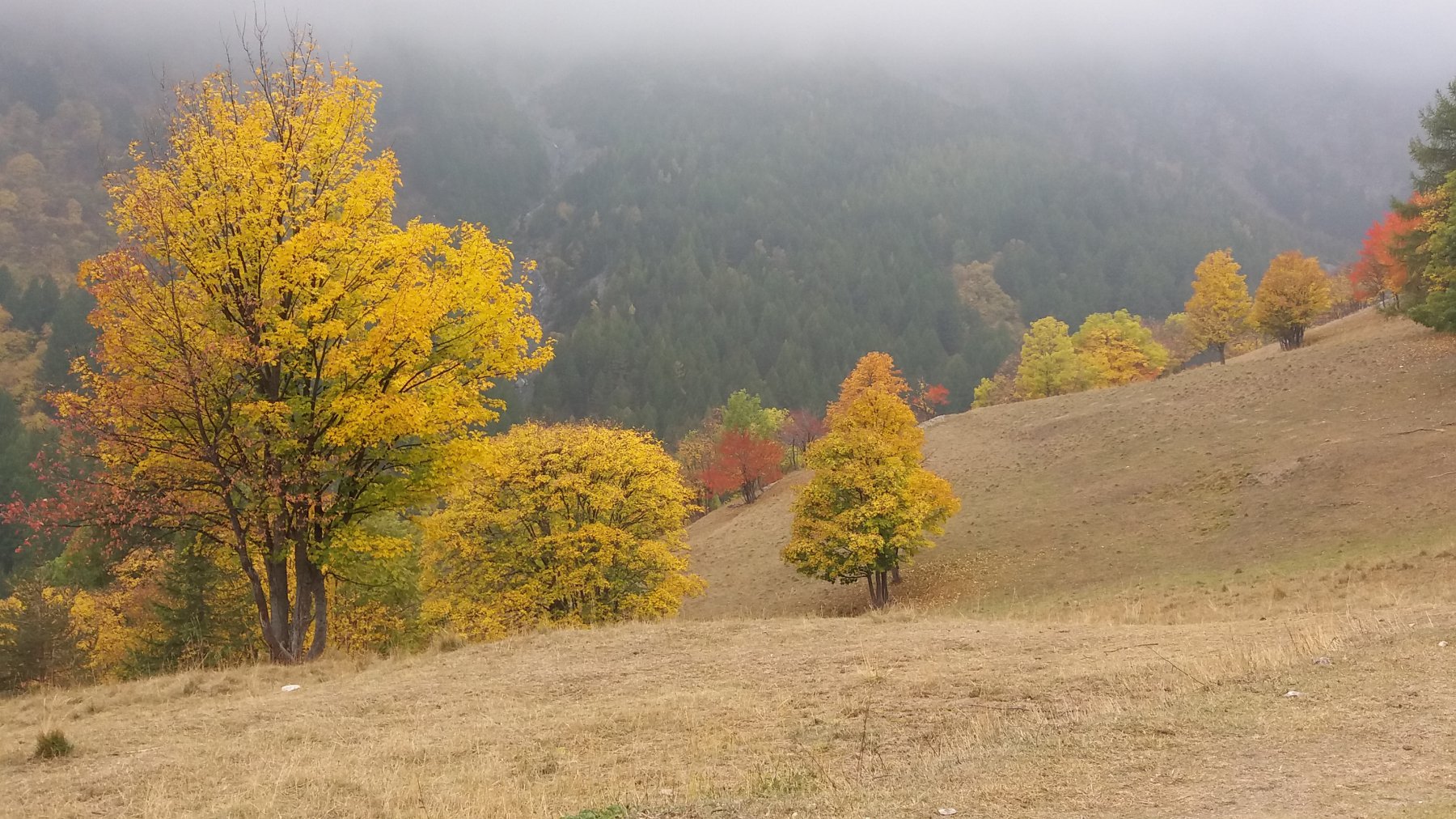 scendere dalla strada militare – dopo il tunnel quando la strada tende per un breve tratto a risalire (abbeveratoi sia sopra che sotto la strada) conviene abbassarsi per prati puntando in diagonale all’abitato delle grange della Rho