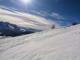 Siamo saliti prima alla Rocca Nera e in discesa stando su contropendenze ottima farina pressata con sciata da “antologia”. Arrivati al pianoro a 2100m circa, abbiamo ripellato salendo verso la pitre d aigle, con altra discesa bella ricercando le zone di farina ed evitando le placche da vento ben distinguibili e le vecchie tracce rigelate(non troppe..)