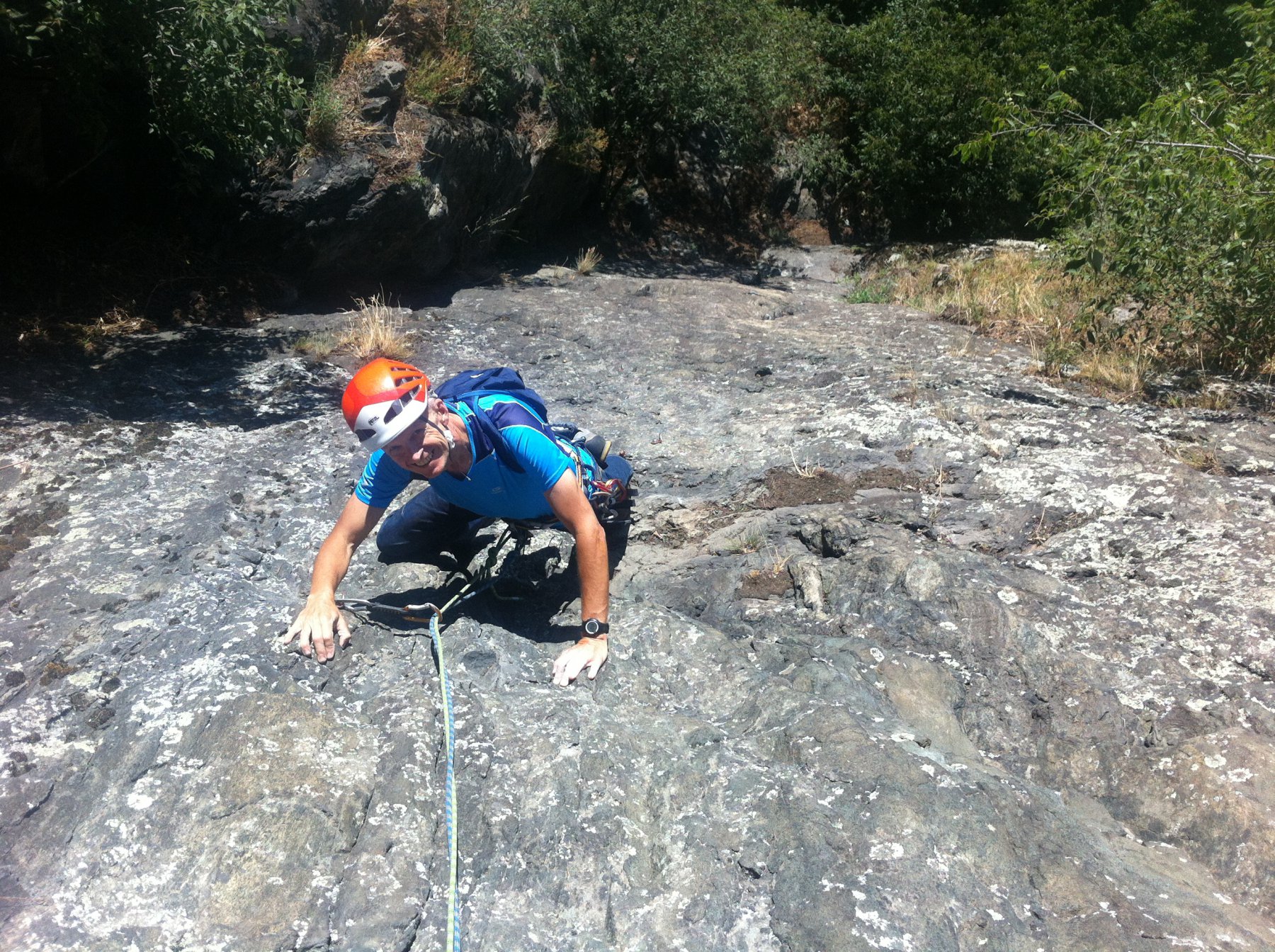 Per cercare uniformità di grado abbiamo salito ad Anticaprie i primi due tiri della Fessura Meneghin ed il terzo ed il quarto di Grazie di Tutto. Dall’uscita di questa meno di dieci minuti di sentiero comodissimo. In totale quindi 9 tiri sul filo del 5c.