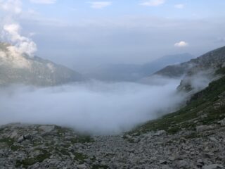 Bell’allenamento di poco più che 2000m di salita, poco panorama in quota per via delle nebbie che andavano e venivano. Tempo di salita con passo medio 5h e 15’, tempo di discesa 4h, rallentati dalla pietraia sulla dorsale sud – ovest con sfasciumi e cenge erbose. Dopo il bivacco Cravetto la descrizione propone due vie alternative: in andata abbiamo seguito quella che sale verso la sella più a sud, percorrendo però il tratto in cresta senza scendere e tenendo il lato sinistro dell’ampia pietraia della dorsale che sale al Mont Nery; in discesa abbiamo percorso la stessa pietraia tenendo la sinistra, e sulla sella prossima alla dorsale si intravedono dall’alto due ometti a punta che indicano dove scendere e percorrere il breve tratto con corda fissa che permette di superare facilmente 5 metri di placca liscia; da qui diversi ometti contornano la pietraia sottostante e in breve si raggiunge il Cravetto. Peccato solo in discesa i segnavia poco evidenti che ci hanno fatto “ravanare” un po’ tra i pascoli.