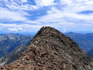Sentiero ben segnalato fino al Bivacco Cravetto ottimamente gestito (fornello a gas, coperte, stufa). Fontana non attiva, ma torrente vicino dove poter prendere acqua. Dal bivacco al colle il sentiero si perde un po’: scendere su pianoro erboso costellato di massi erratici, rari bolli e alcuni ometti conducono alle prime corde fisse che permettono di salire al colle. Si prosegue tenendo, idealmente, la cresta per mano sulla sx. Risalendo la ripida pietraia, si arriva all’attacco della cresta, si superano alcune cengie (tratto pericoloso in caso di terreno umido) e si avvistano le prime corde fisse che conducono in cima. Sconsigliato con meteo incerto e terreno umido. Si può pensare di portare imbrago e longe di sicurezza, alcuni punti sono molto esposti. Cima mediamente aerea.