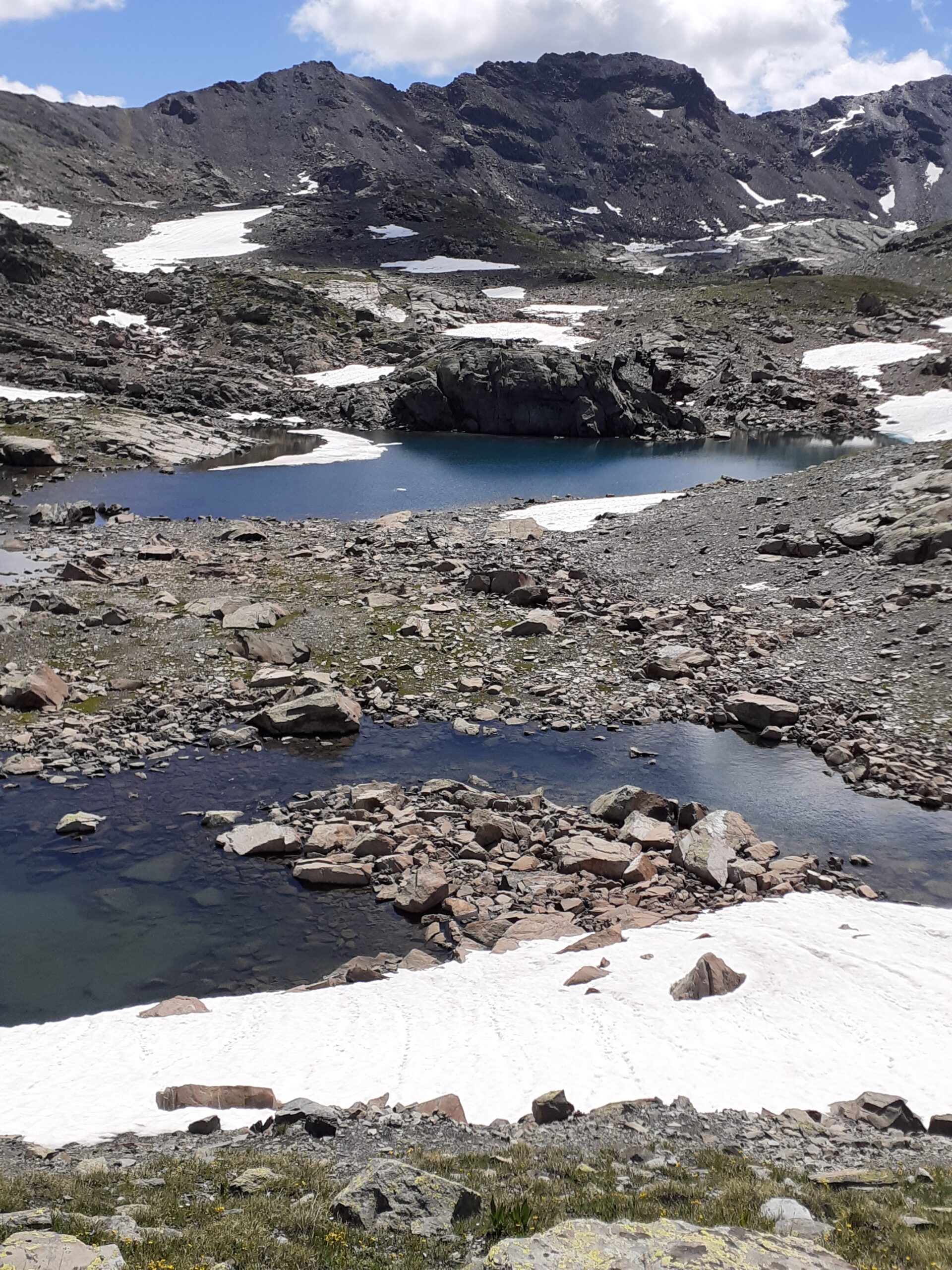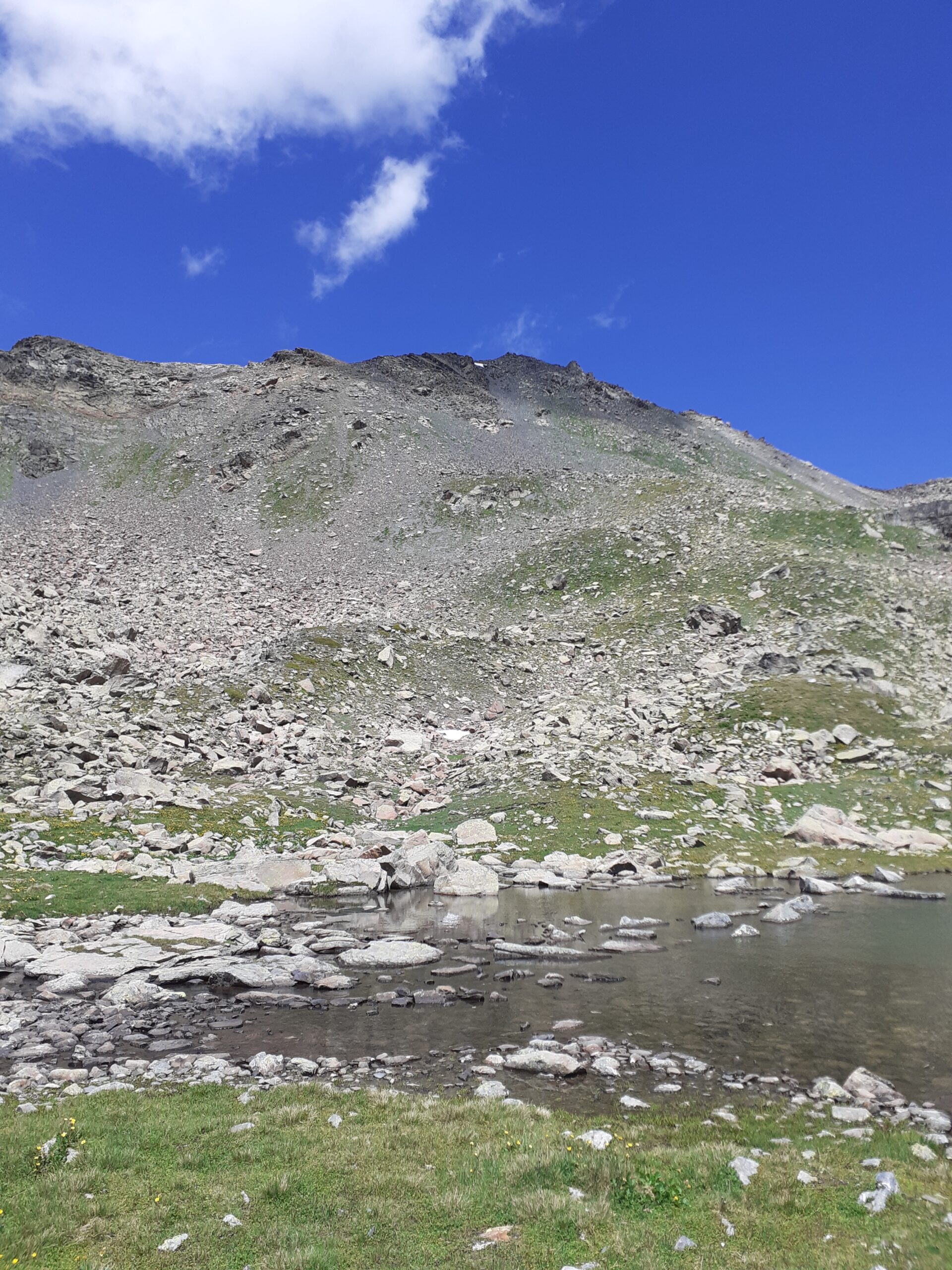 Il sentiero inizia così a salire per dossi tra bancate rocciose, raggiungendo piuttosto in fretta il Lac Long 2300 m circa. Lo si costeggia sulla sinistra per poi riprendere a salire il dosso al fondo del lago, che poterà nella caotica pietraia che precede il Lac Rond. Qui si incontrano numerosi sentieri che si districano tra il pietrame, occorre un po’ di pazienza e finalmente si giunge al bel lago, dove il terreno torna erboso.