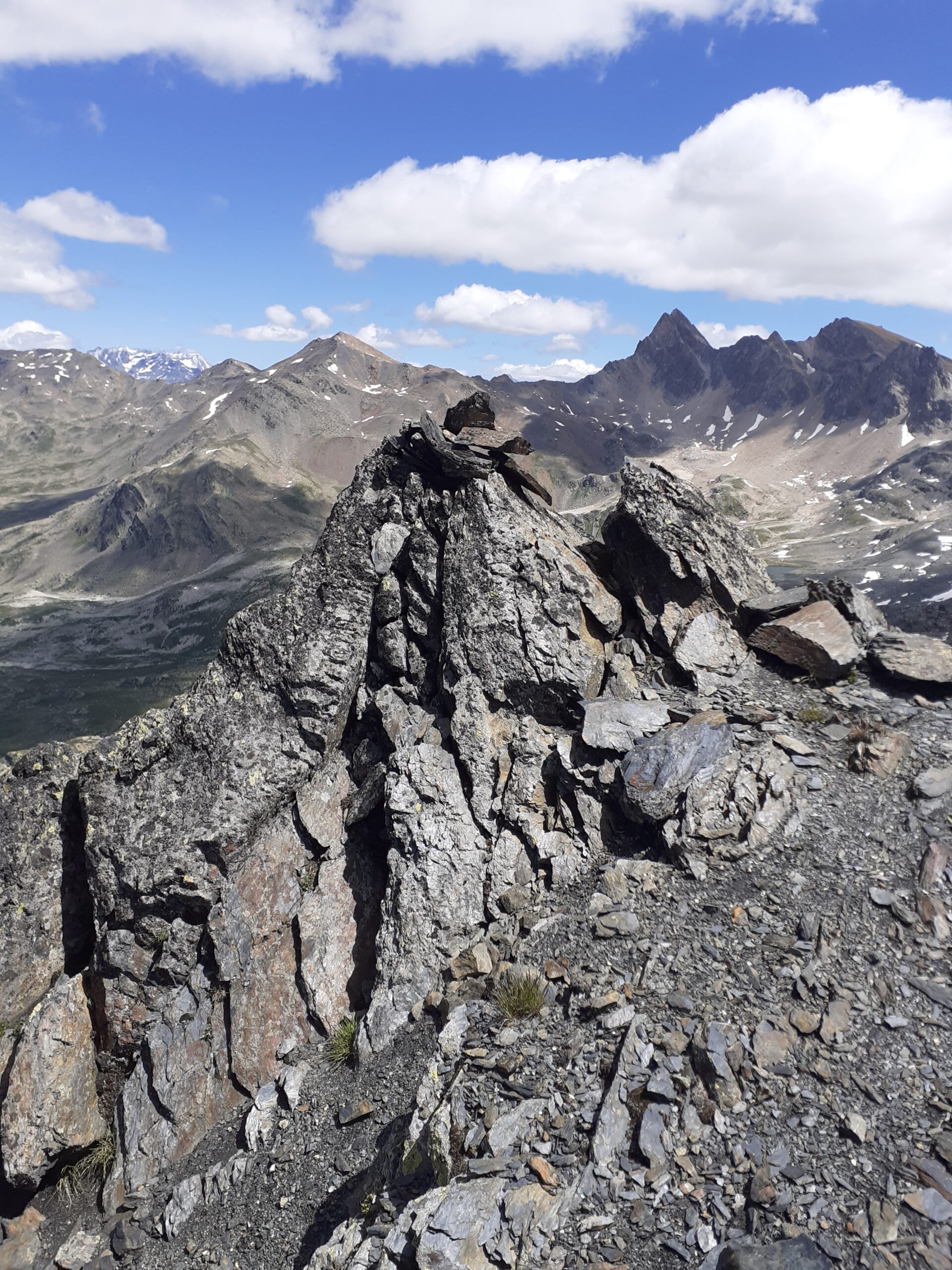 Guardando verso ovest lungo la prosecuzione della cresta, si nota una seconda elevazione 2889 m, che ha un ometto di pietre con un paletto di legno, ma per raggiungerla occorre scendere in un canalone sud dal versante opposto a quello di salita, contornare le propaggini di una parete rocciosa, e infine risalire un pendio-canalone simile a quello già affrontato per la cima.