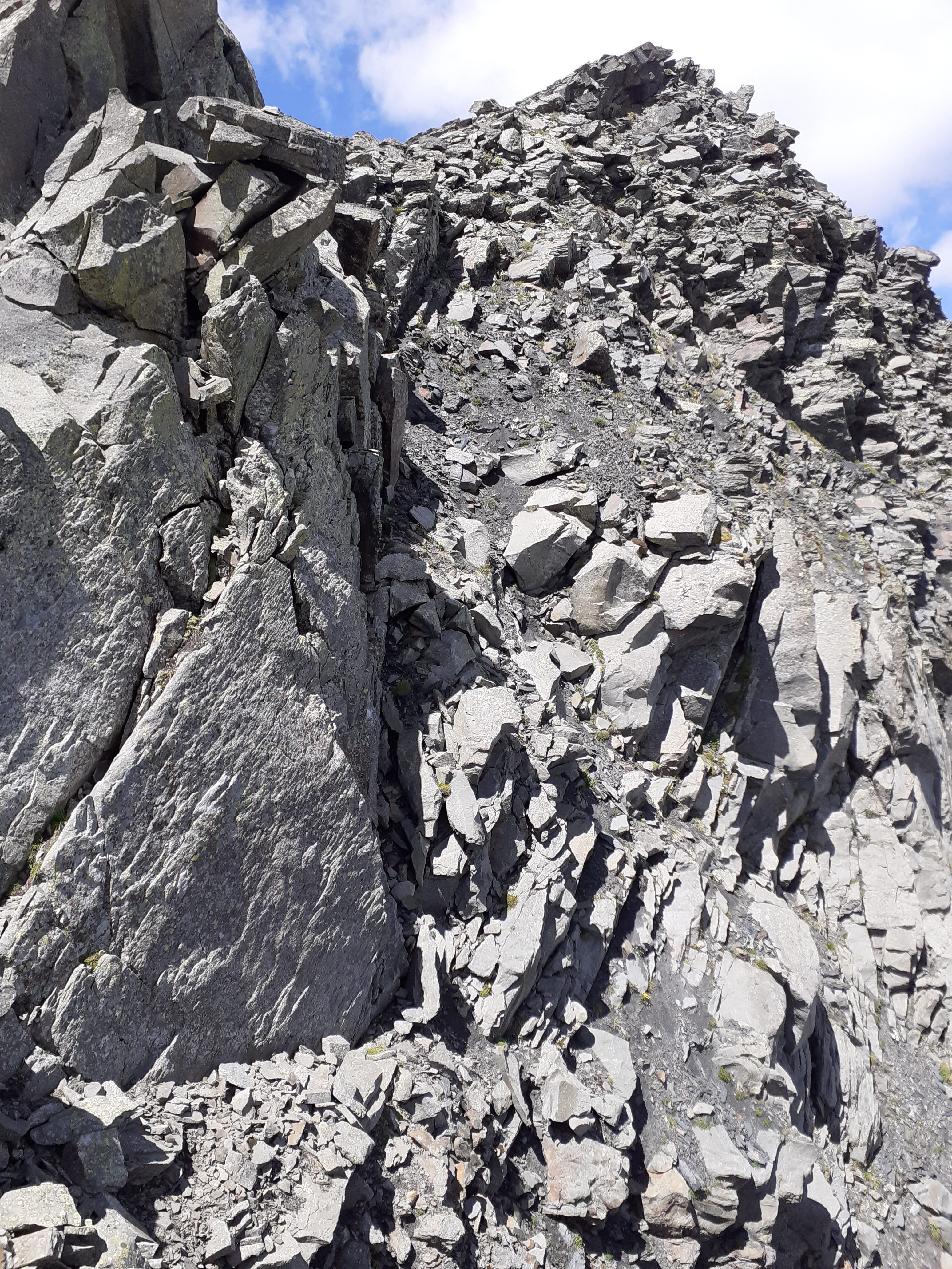 Se si resta sotto invece di deve affrontare un terreno non difficile ma scomodo e faticoso; risalito tutto il canalone si giunge direttamente alla cima (piccolo ometto di pietre).