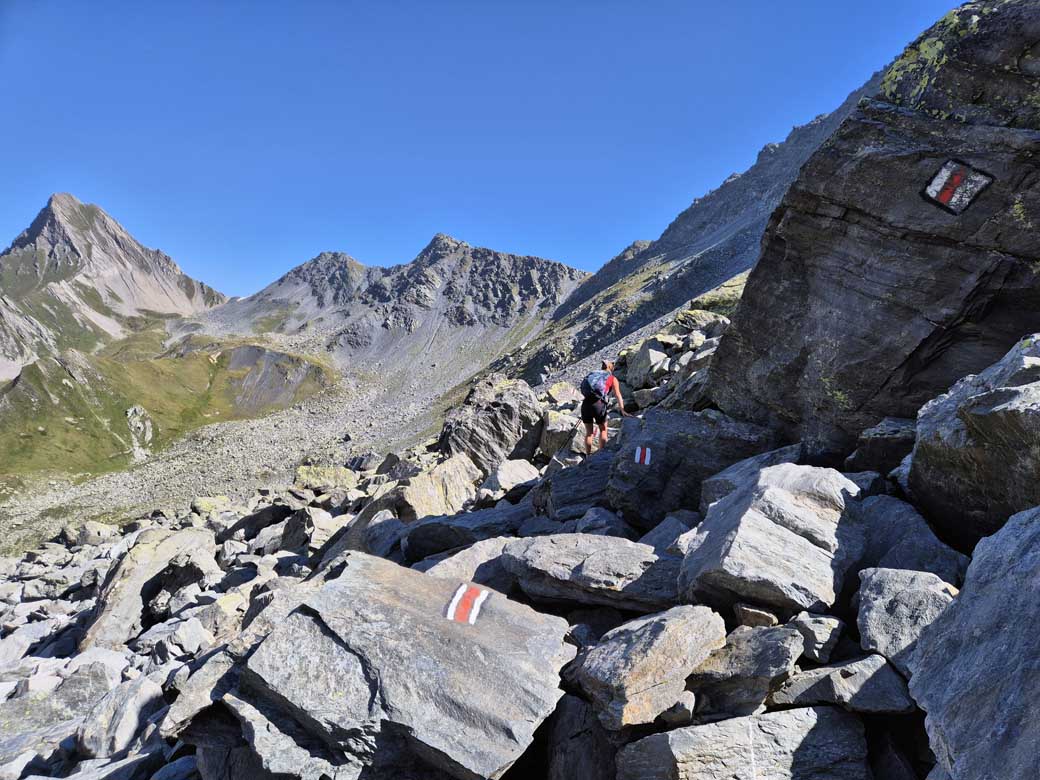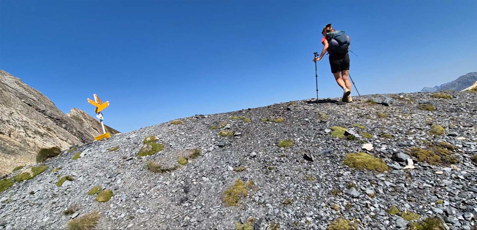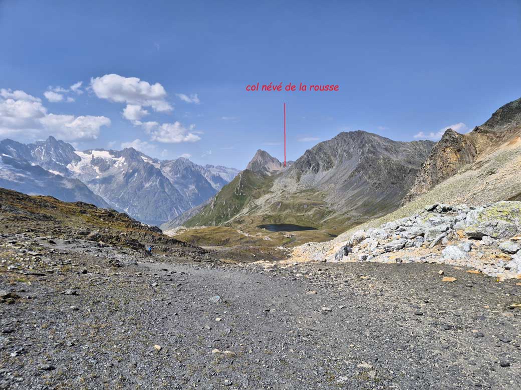 Dalla baita si sale sul ben marcato sentiero per la Fenêtre de Ferret, dal quale si scende sino in bei laghi Fenêtre; raggiunto quello inferiore, si attraversa l’estuario e si tiene la sinistra ignorando il sentiero che scende a Ferret. Qui, seguendo le indicazioni delle paline per il Col Névé de la Rousse, si rimane sulla sinistra attraversando una striscia di pietre per poi risalire il vallone col sentiero che porta al Col d’Arpalle. Da questo, scesi ripidamente per un breve tratto, si arriva ad una pietraia, piuttosto larga, che si attraversa seguendo i bolli di vernice; ripreso il sentiero si compie un lungo traverso dove si attraversa una seconda, ma più breve pietraia. Il sentiero continua, con qualche breve tratto un po’ esposto, sulla fiancata della montagna. Arrivati ad un bivio indicato da una palina, si sale a destra sul fianco di un piccolo promontorio raggiungendo un’ampia conca detritica; tenendo la sinistra, si prosegue rimanendo sulla destra dì un corto canale di sfasciumi. Sopra questo si traversa a sinistra raggiungendo, con un ultimo breve tratto ripido, l’ampia insellatura