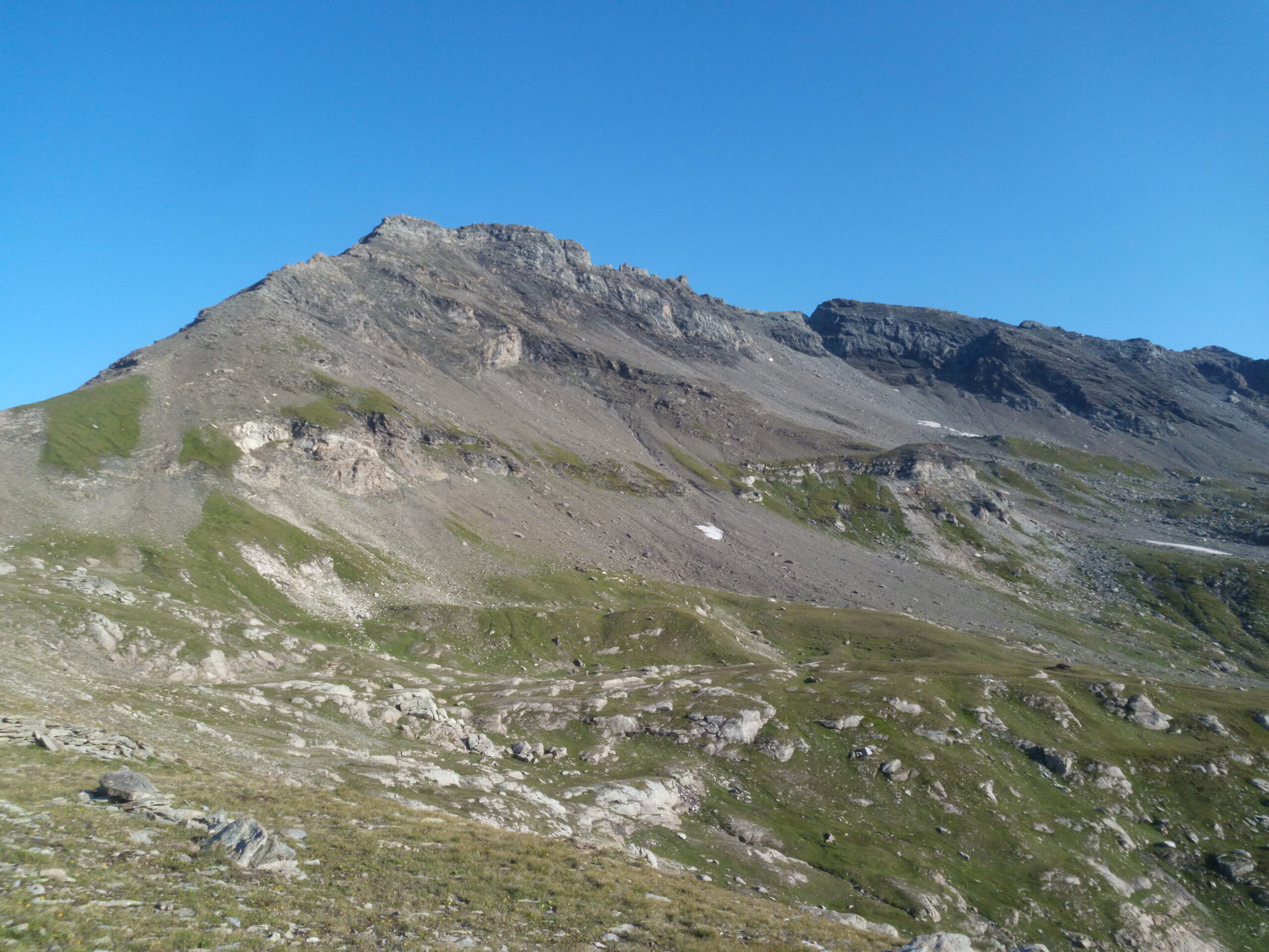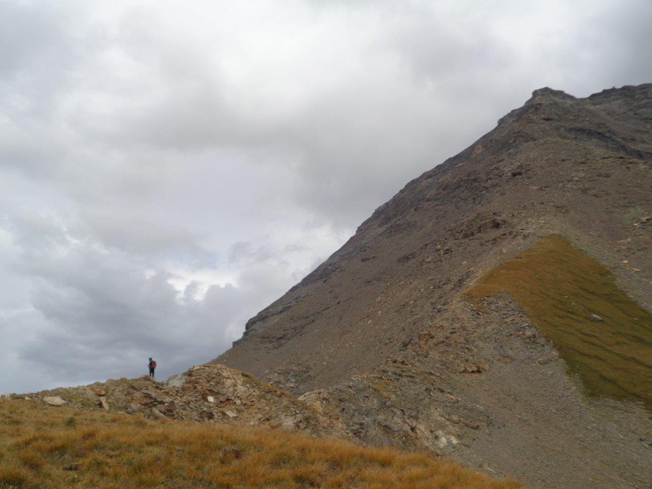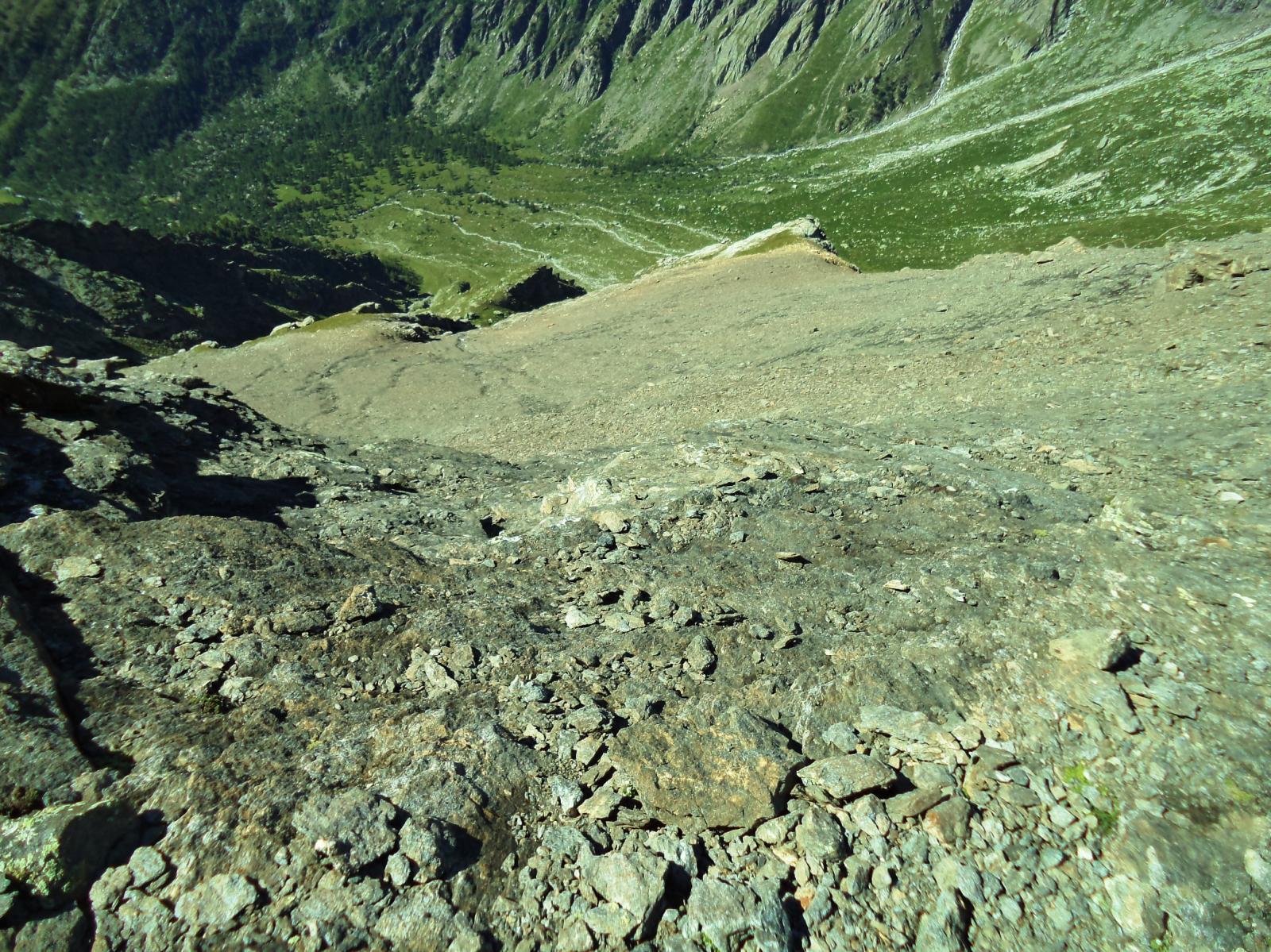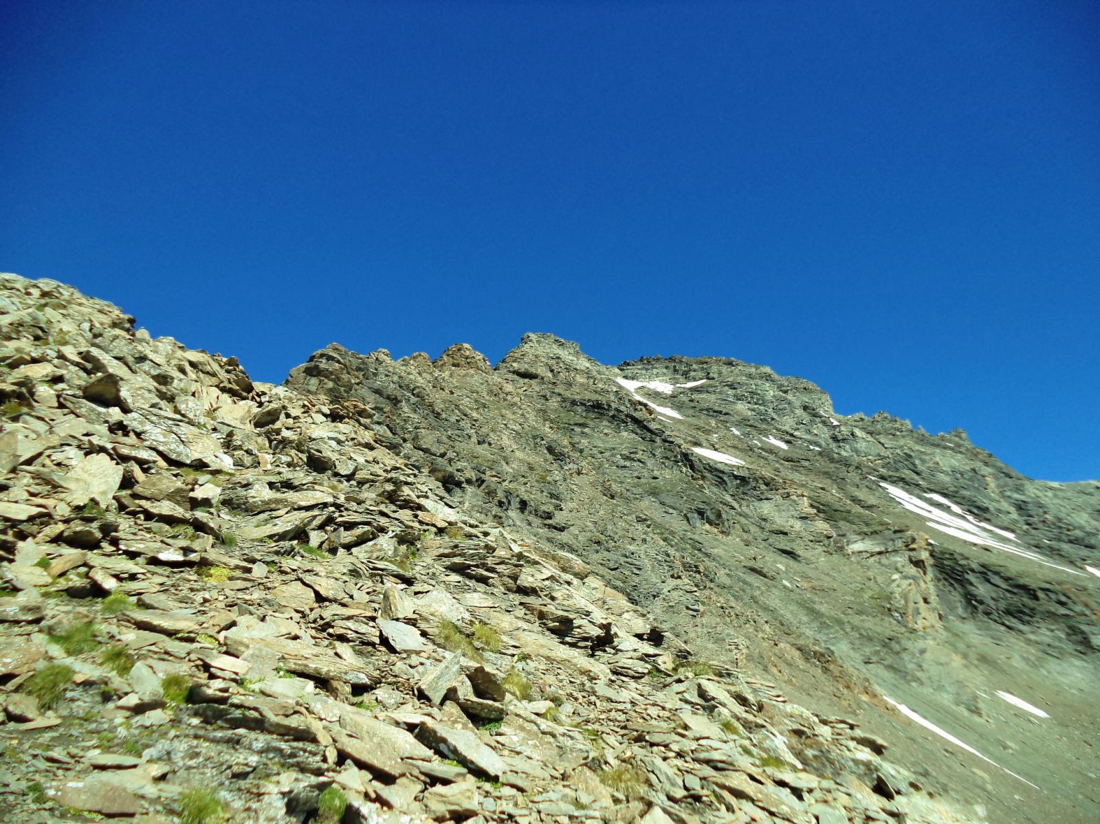 Di qui si abbandona il sentiero e si sale lungo i pendii erbosi della cresta sud-est. In breve si raggiunge una fascia di detriti che poi si trasformano in facili roccette scistose.