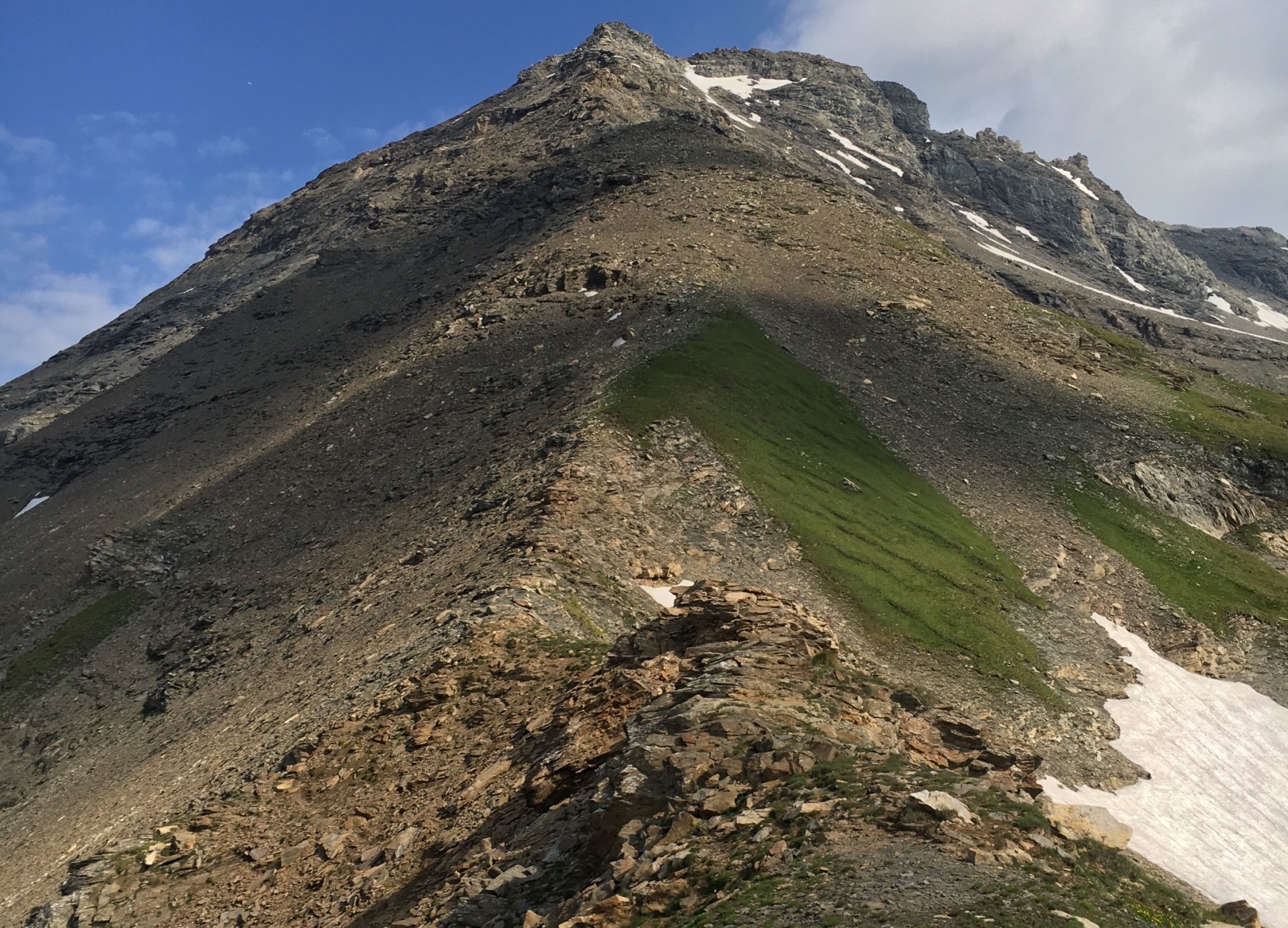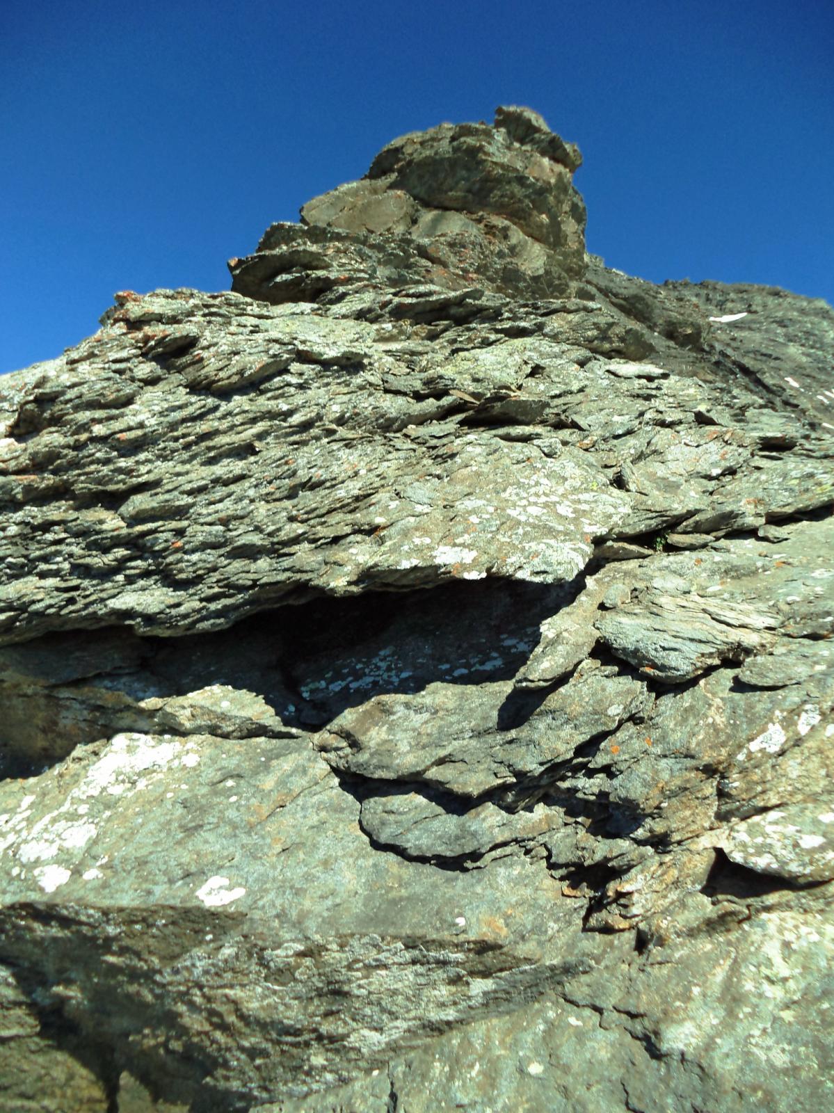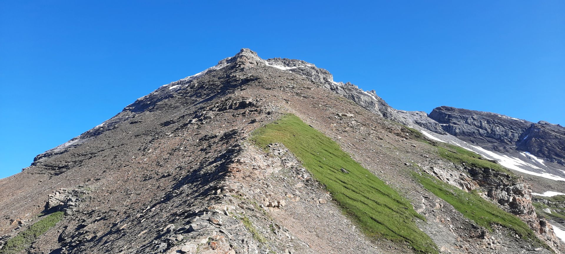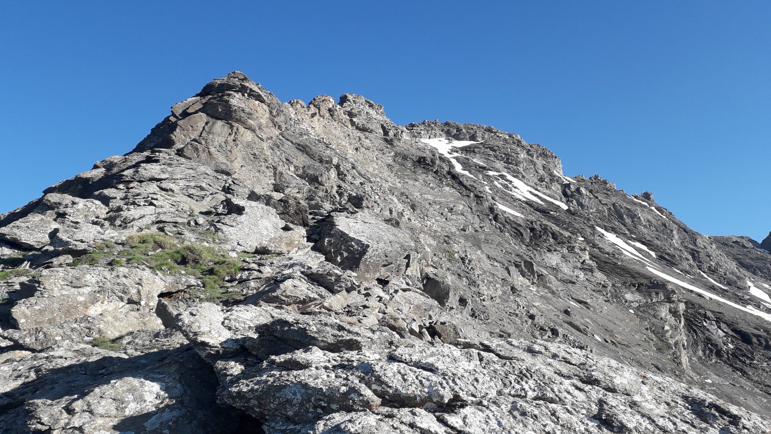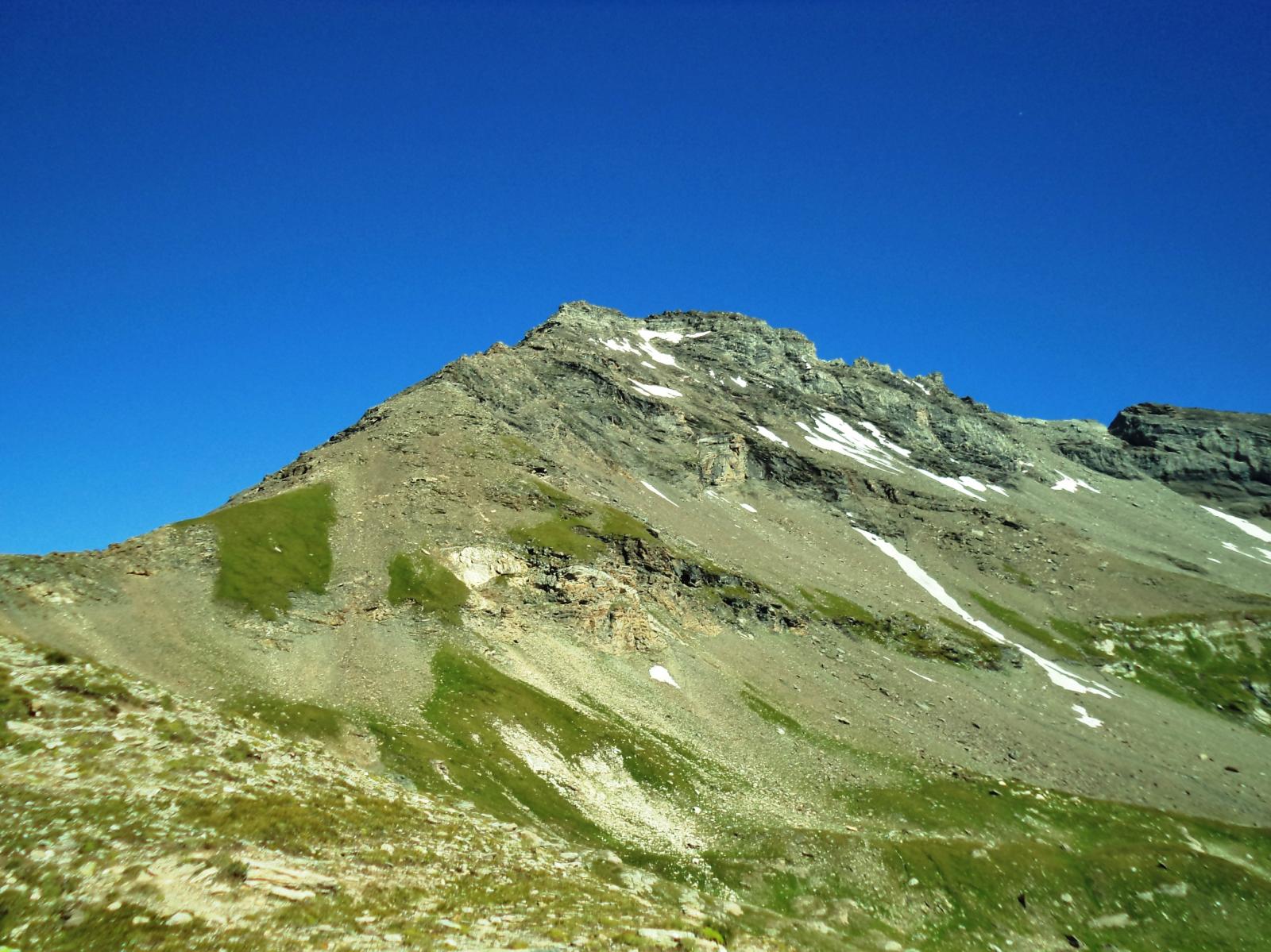 Di qui si abbandona il sentiero e si sale lungo i pendii erbosi della cresta sud-est. In breve si raggiunge una fascia di detriti che poi si trasformano in facili roccette scistose.