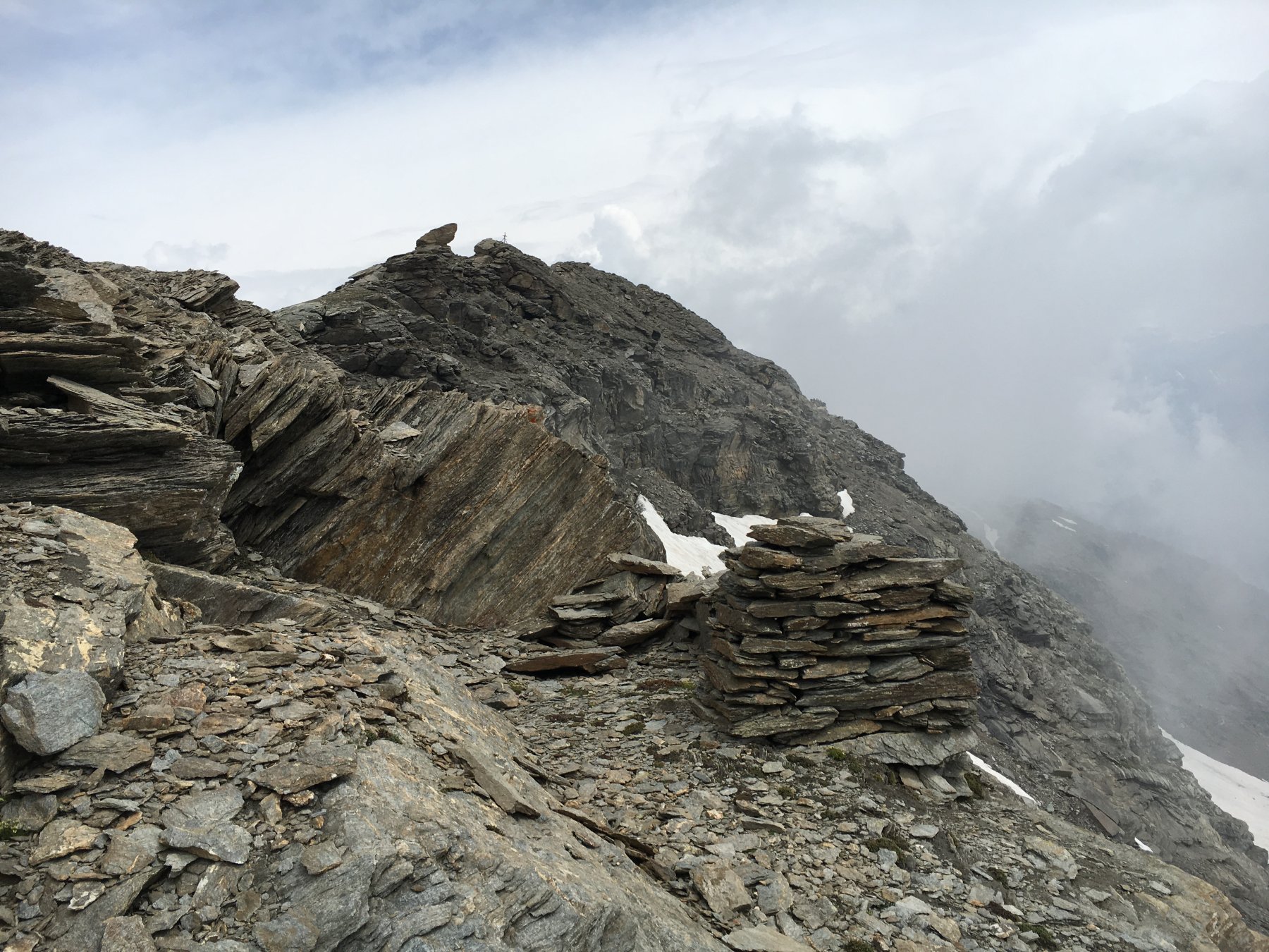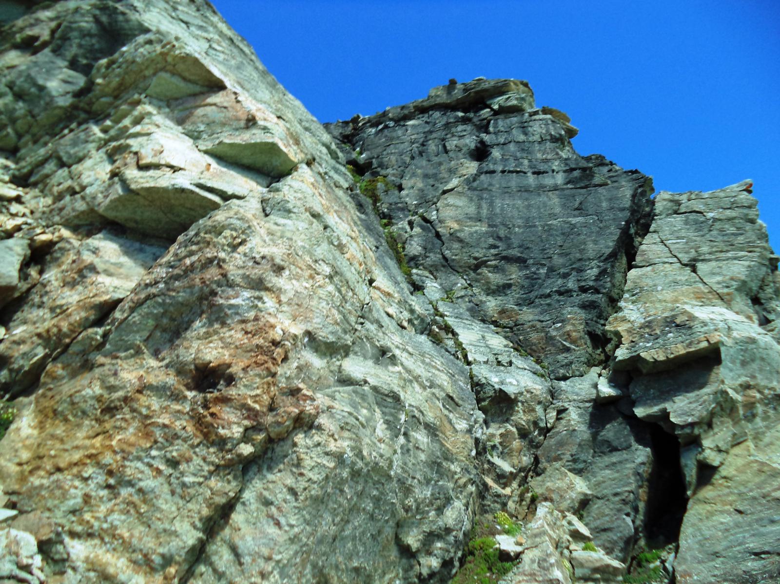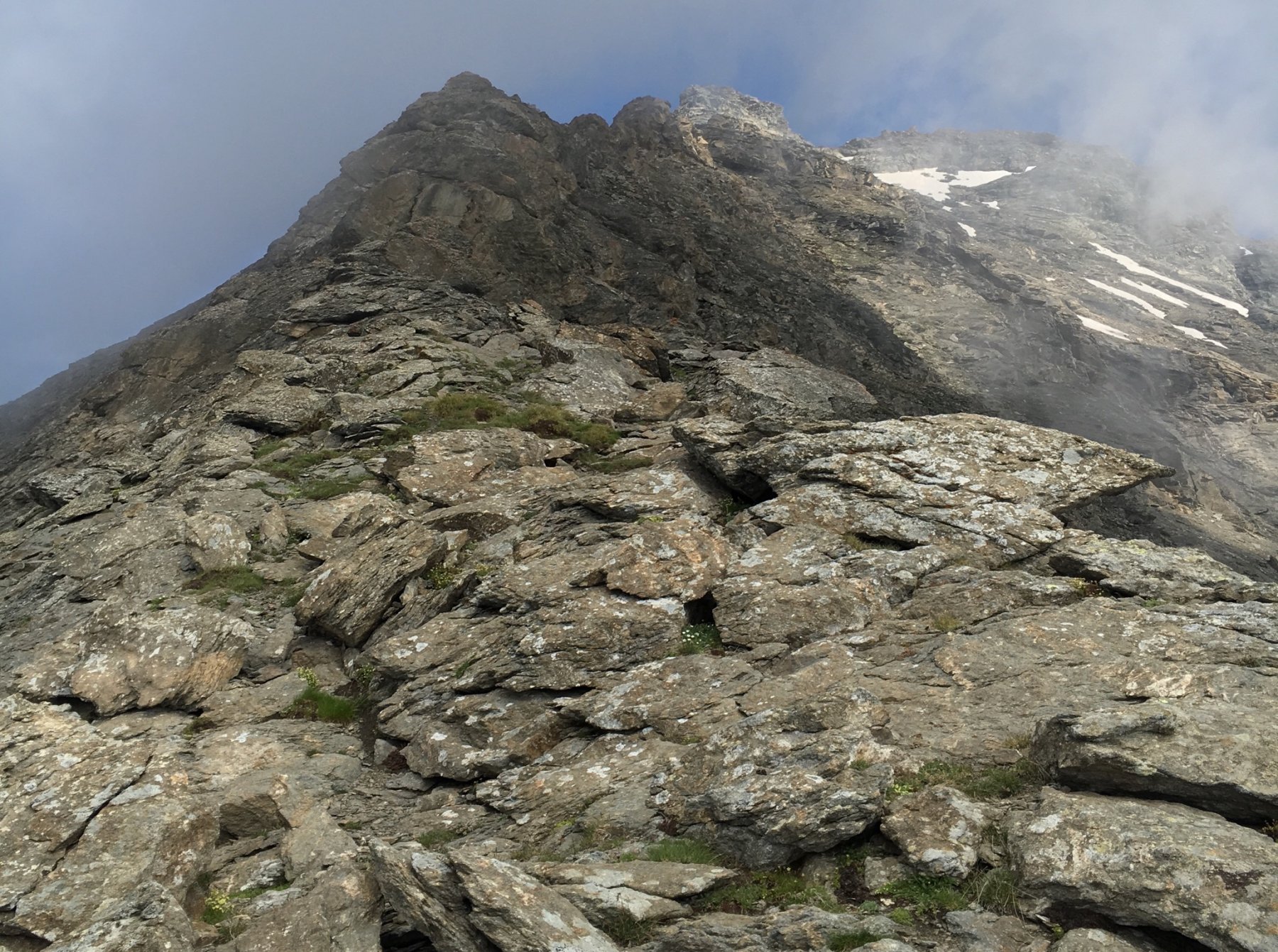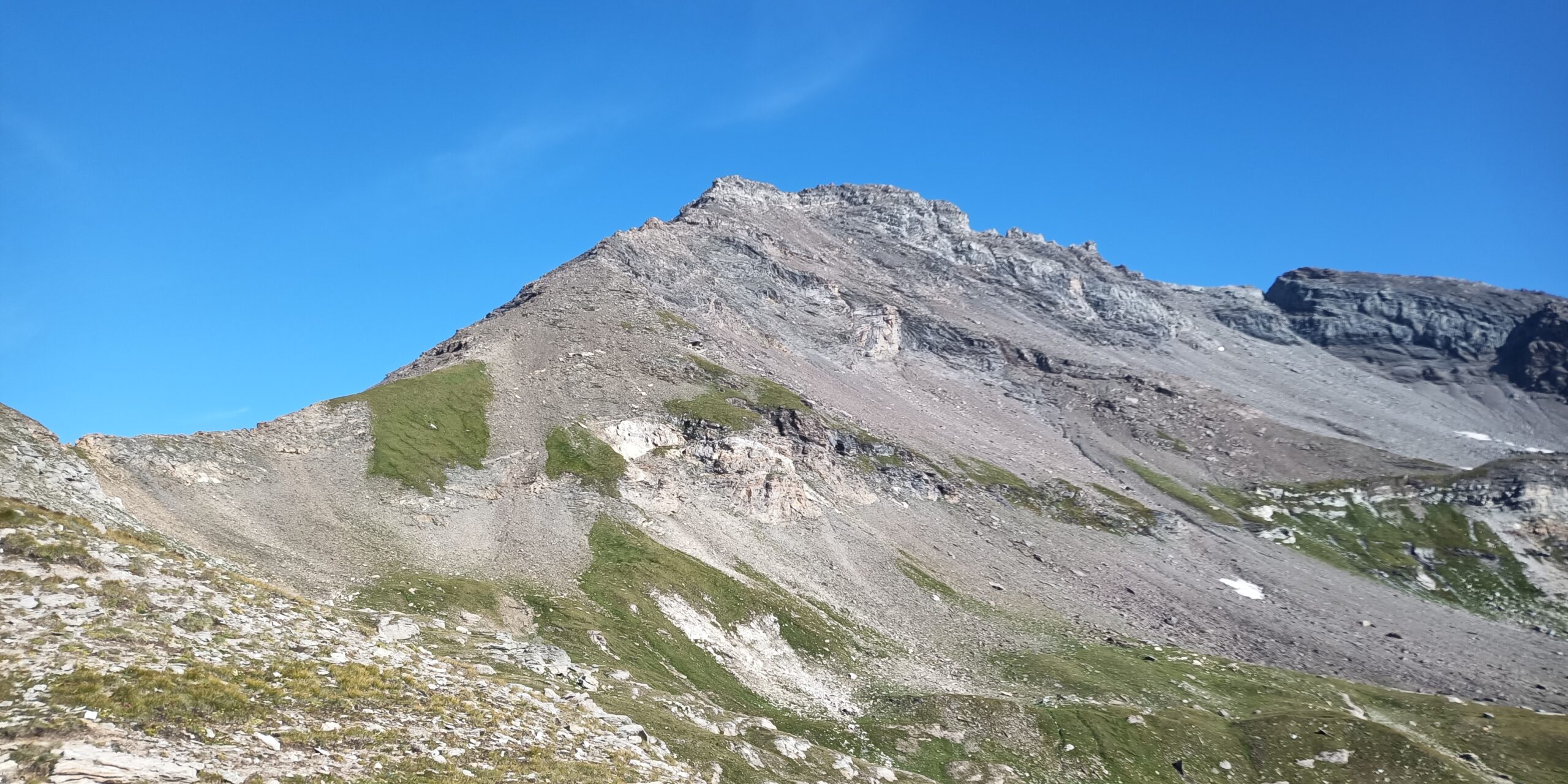 Di qui si abbandona il sentiero e si sale lungo i pendii erbosi della cresta sud-est. In breve si raggiunge una fascia di detriti che poi si trasformano in facili roccette scistose.