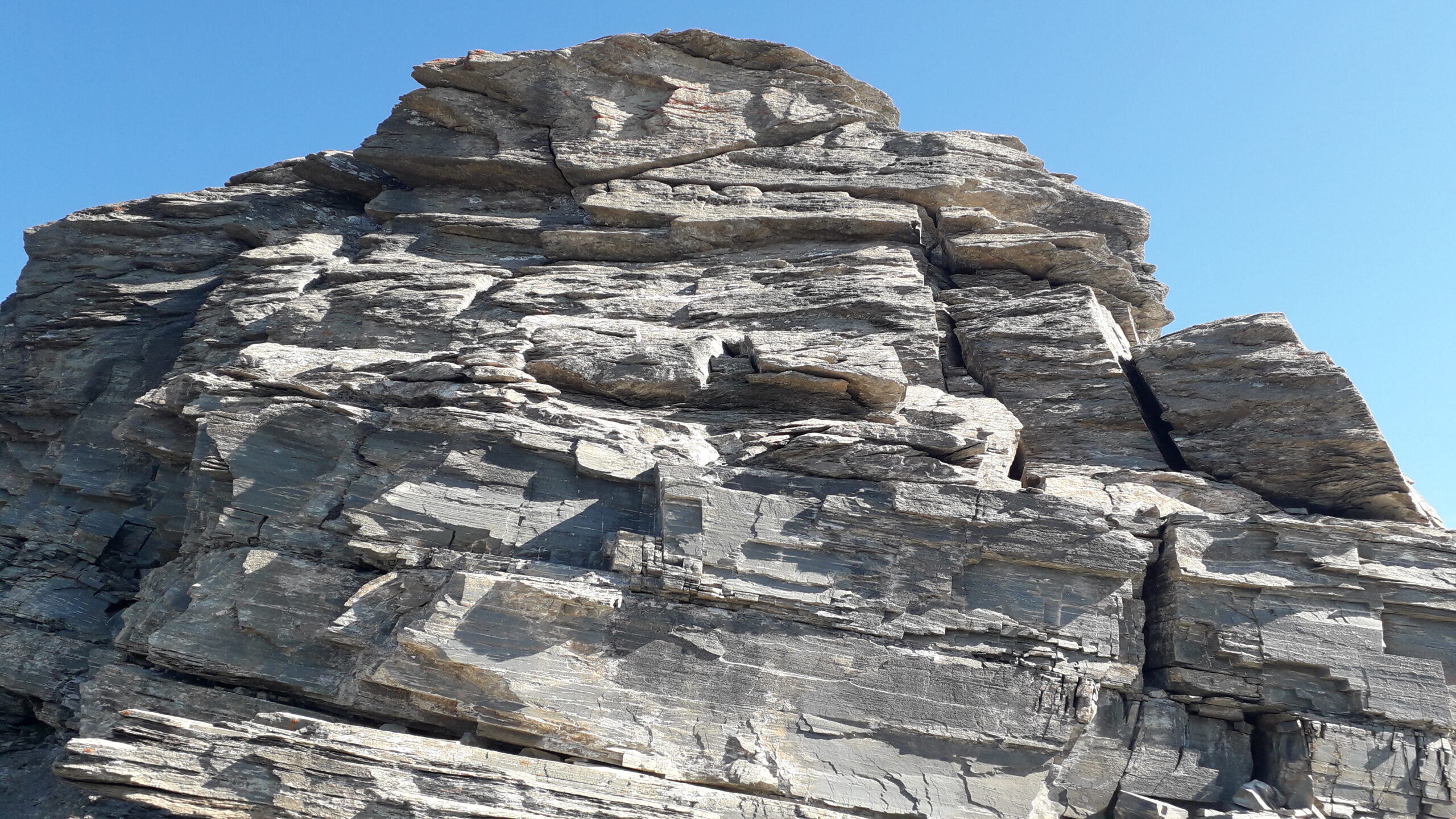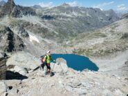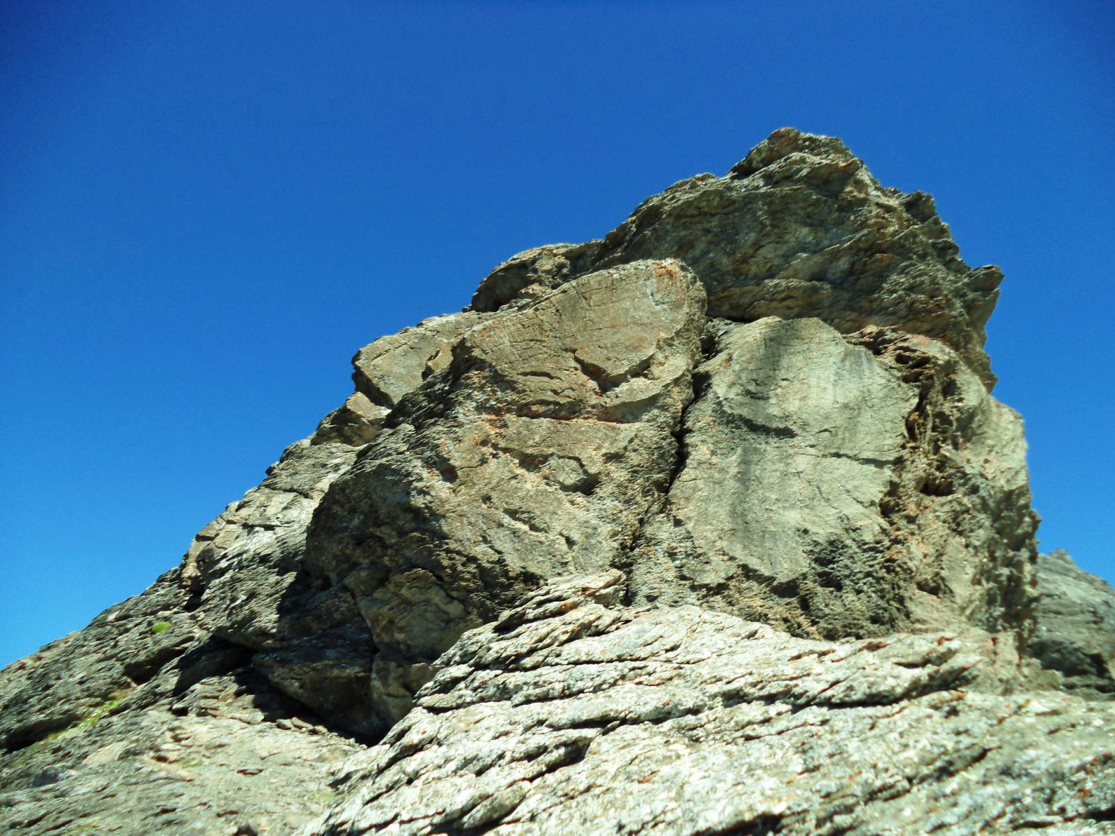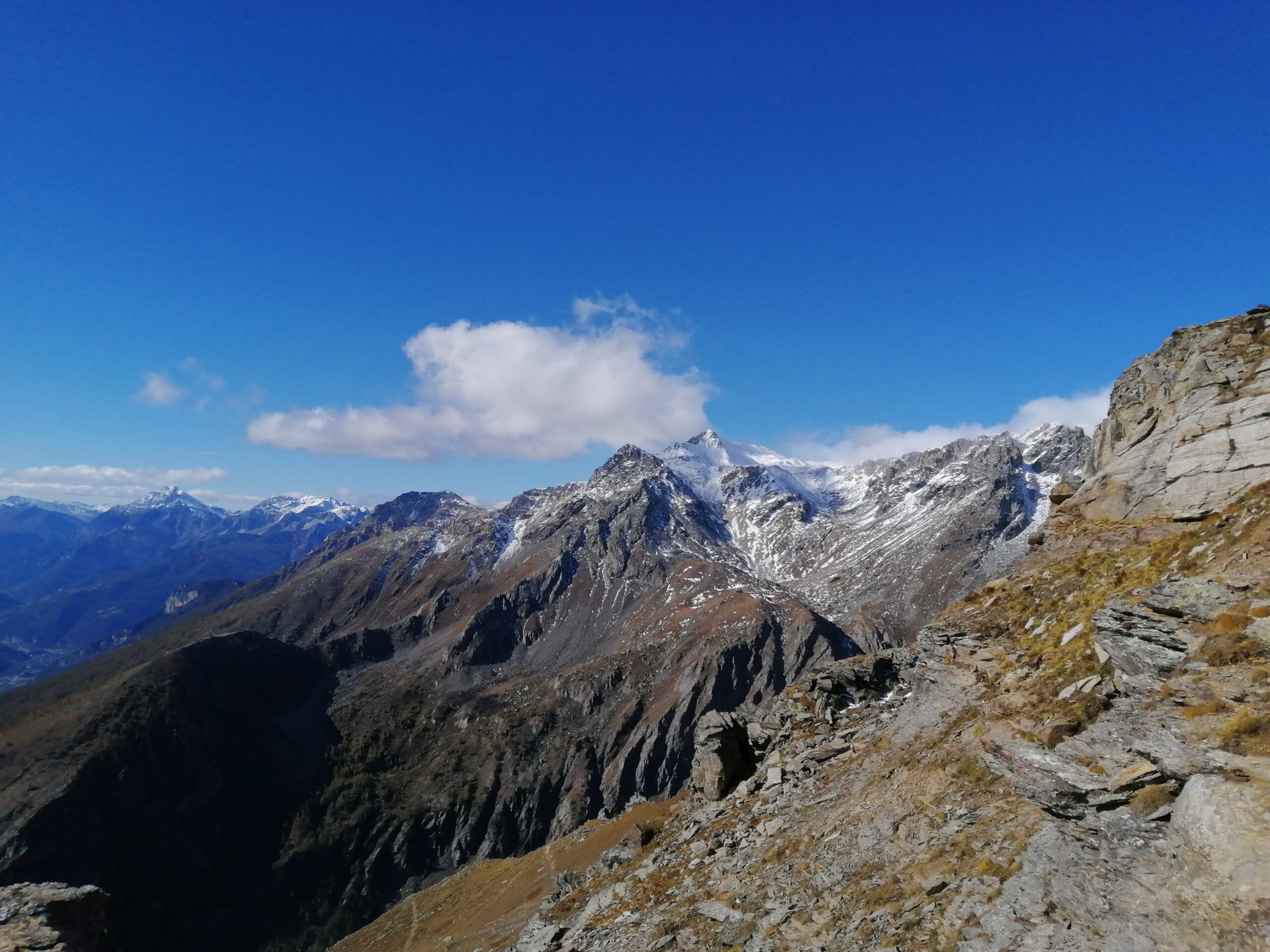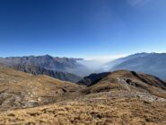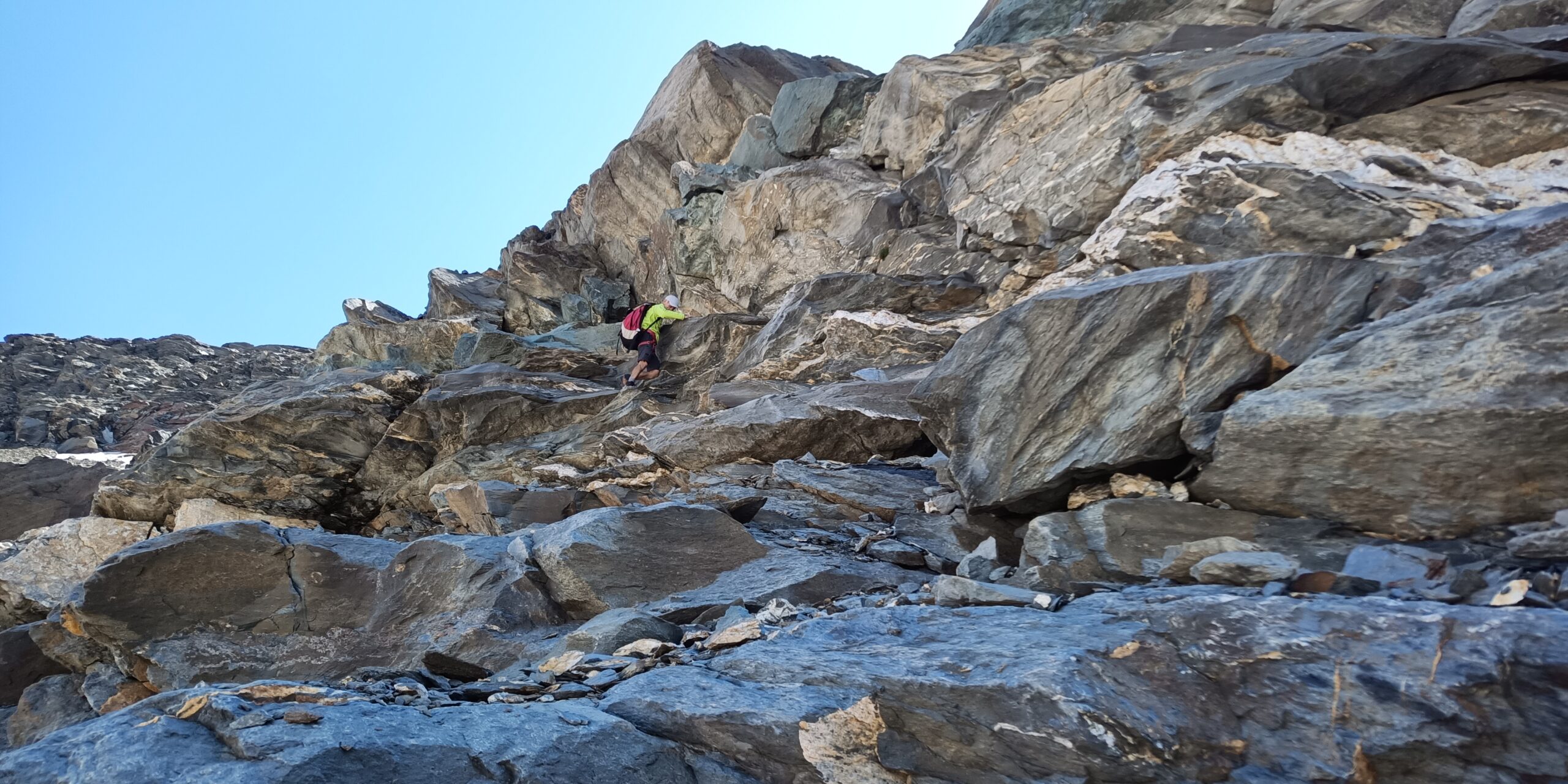 Di qui si abbandona il sentiero e si sale lungo i pendii erbosi della cresta sud-est. In breve si raggiunge una fascia di detriti che poi si trasformano in facili roccette scistose.