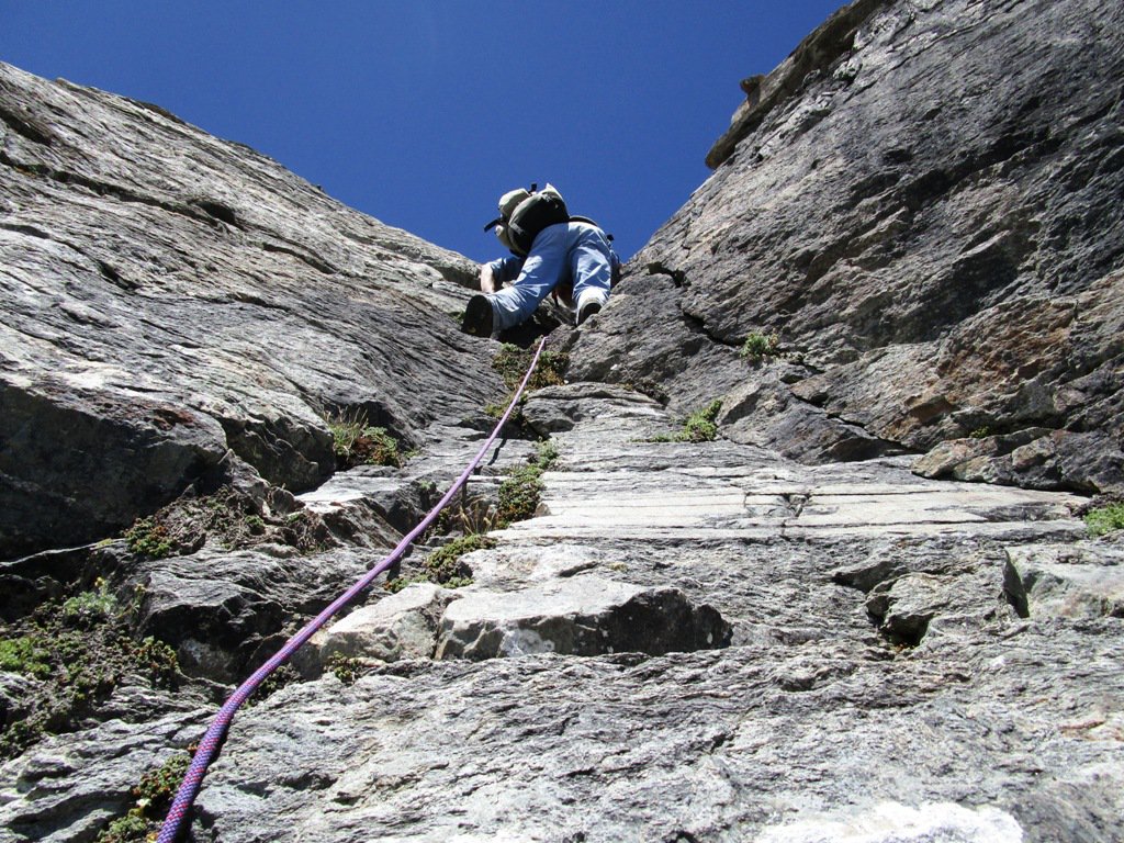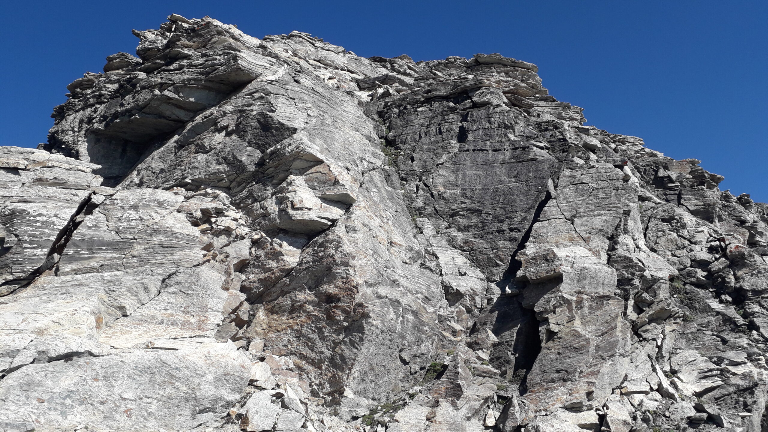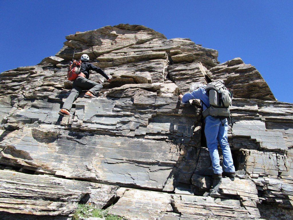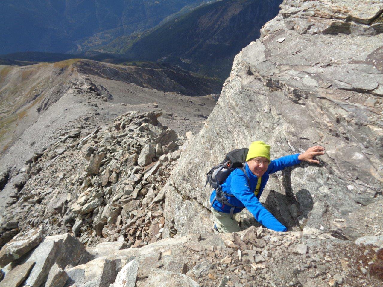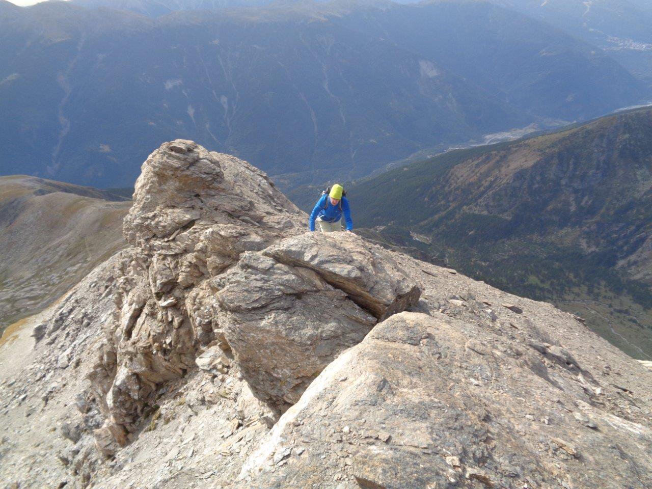 Seguendo sempre fedelmente la dorsale, a quota 3100 circa inizia la parte propriamente alpinistica della salita. Superati alcuni risalti sulle rocce del filo di cresta (passaggi di II), si perviene senza grosse difficoltà ad un diedro caratterizzato dalla presenza di una fessura (passaggio di III).