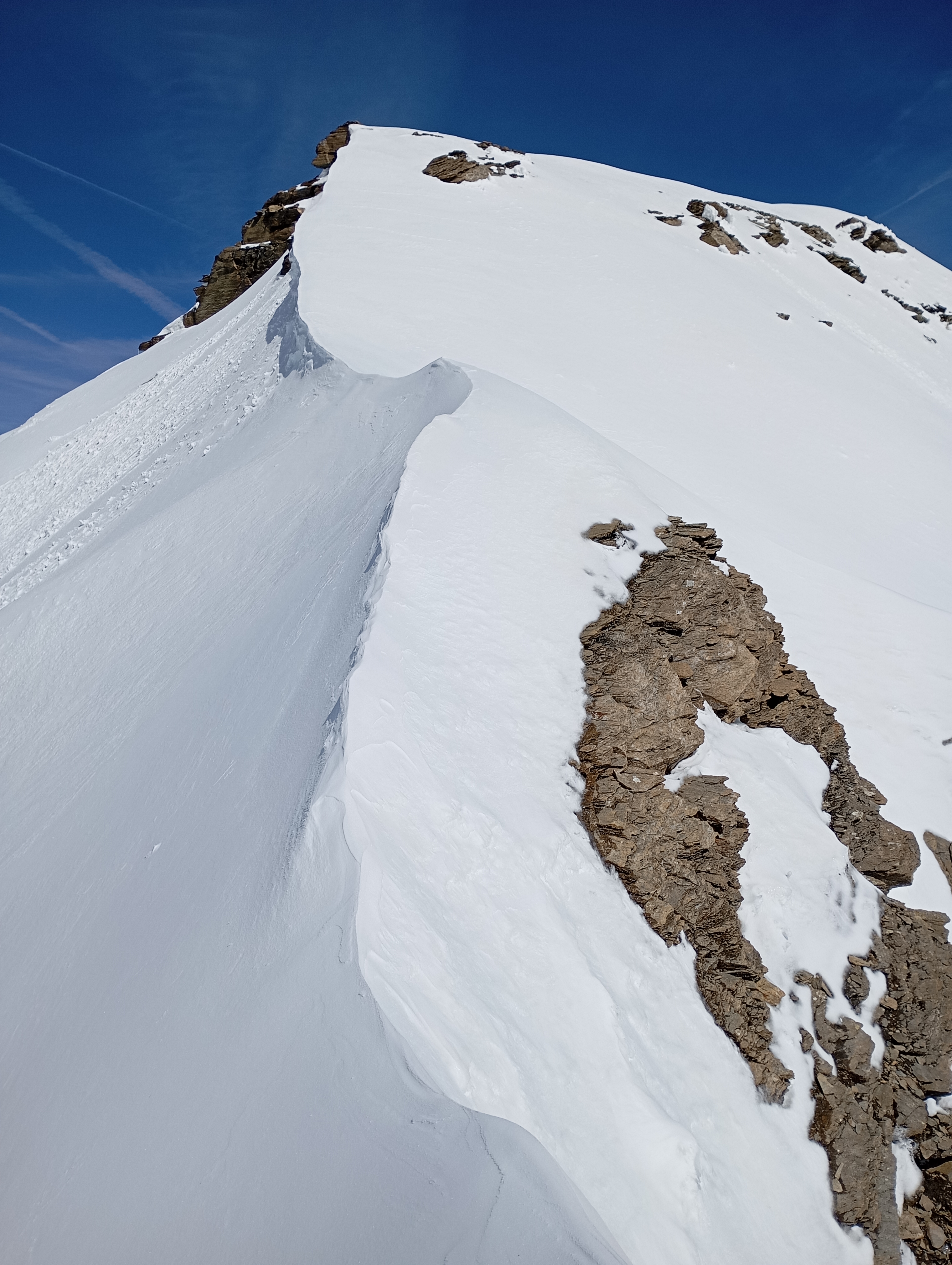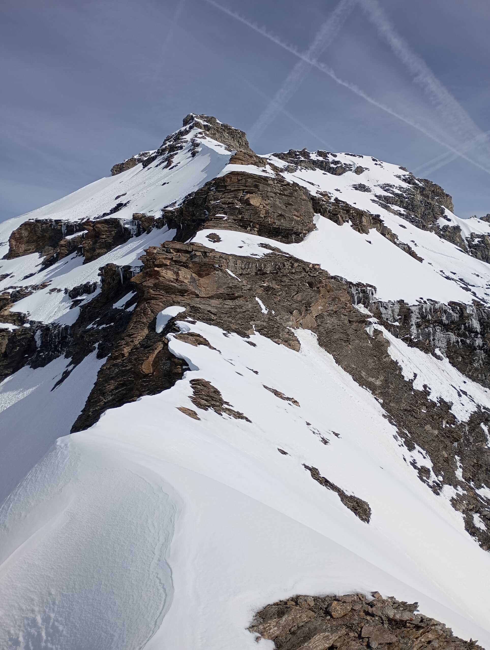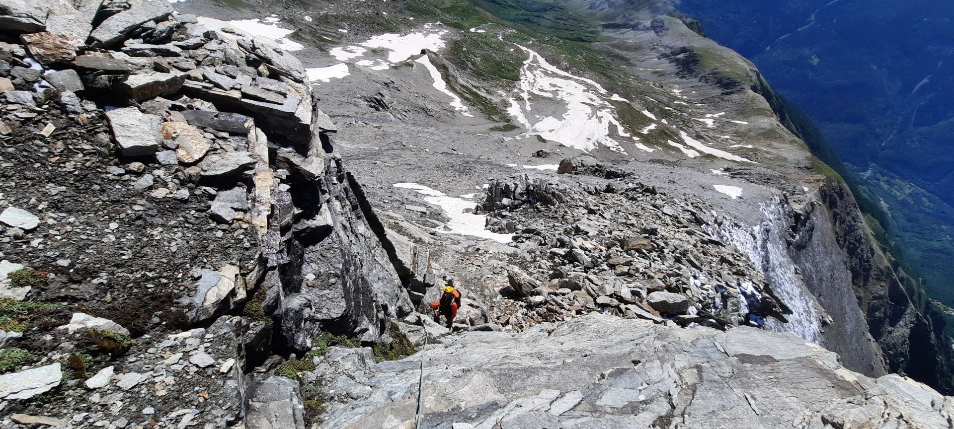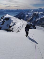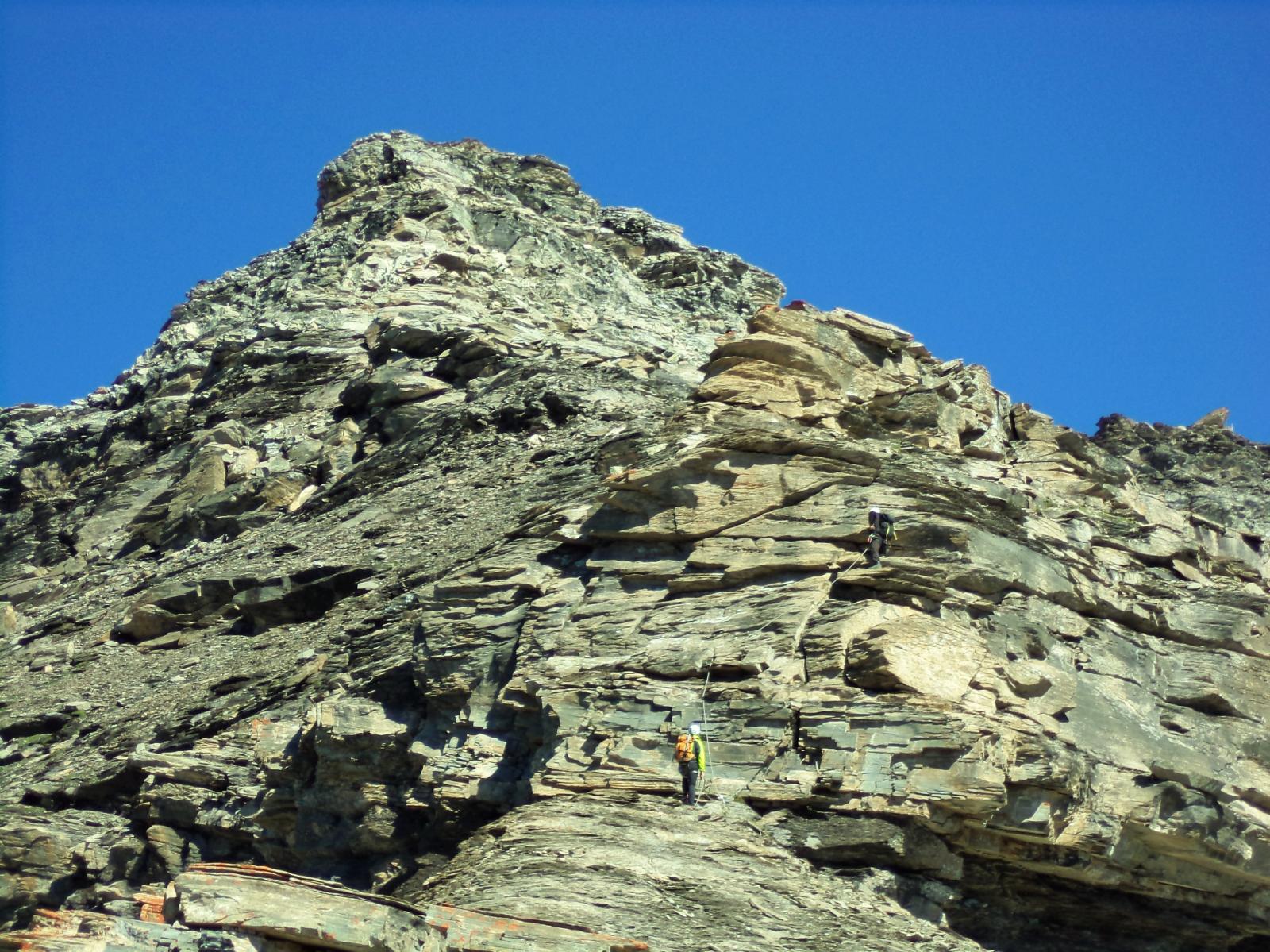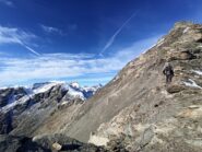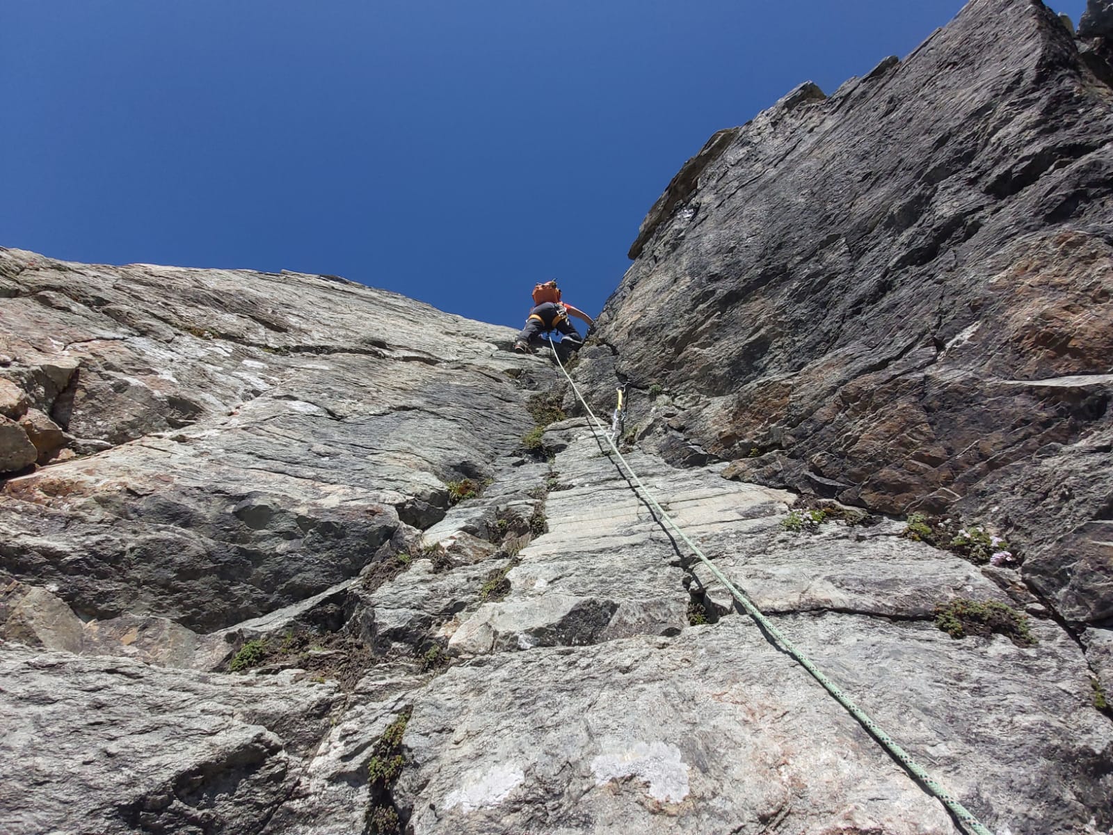 Seguendo sempre fedelmente la dorsale, a quota 3100 circa inizia la parte propriamente alpinistica della salita. Superati alcuni risalti sulle rocce del filo di cresta (passaggi di II), si perviene senza grosse difficoltà ad un diedro caratterizzato dalla presenza di una fessura (passaggio di III).