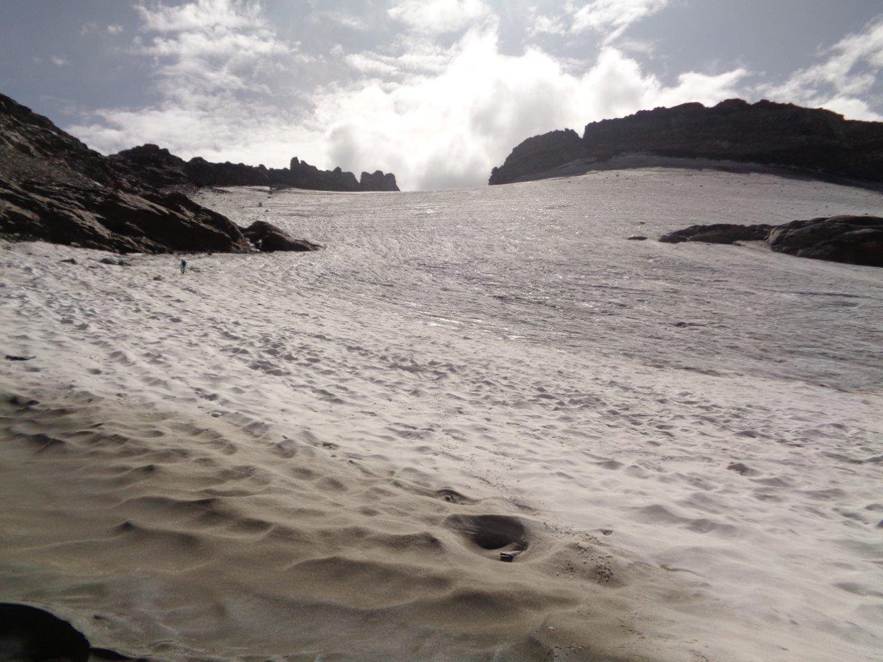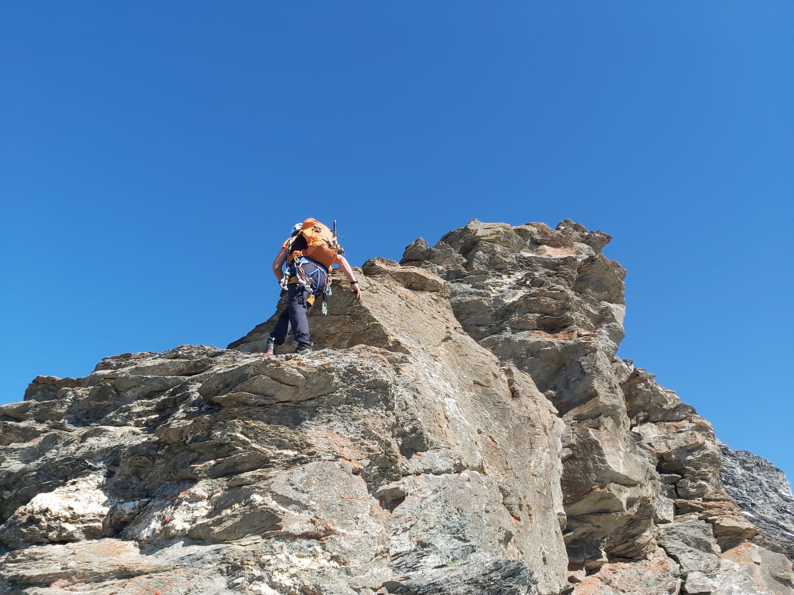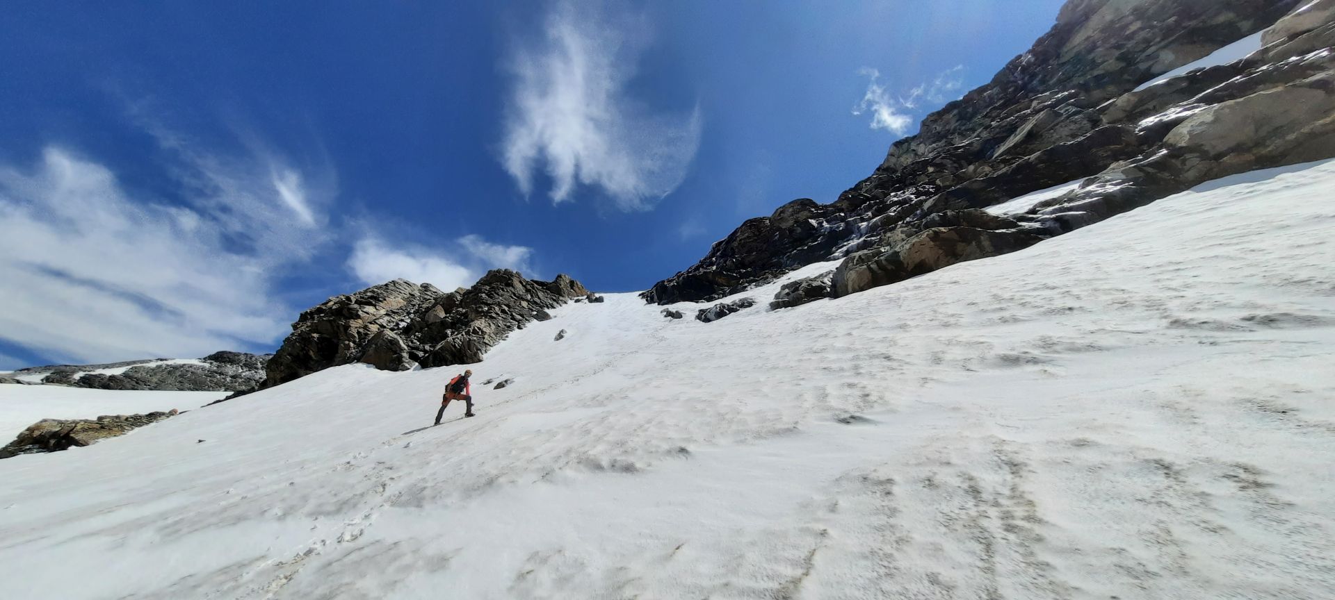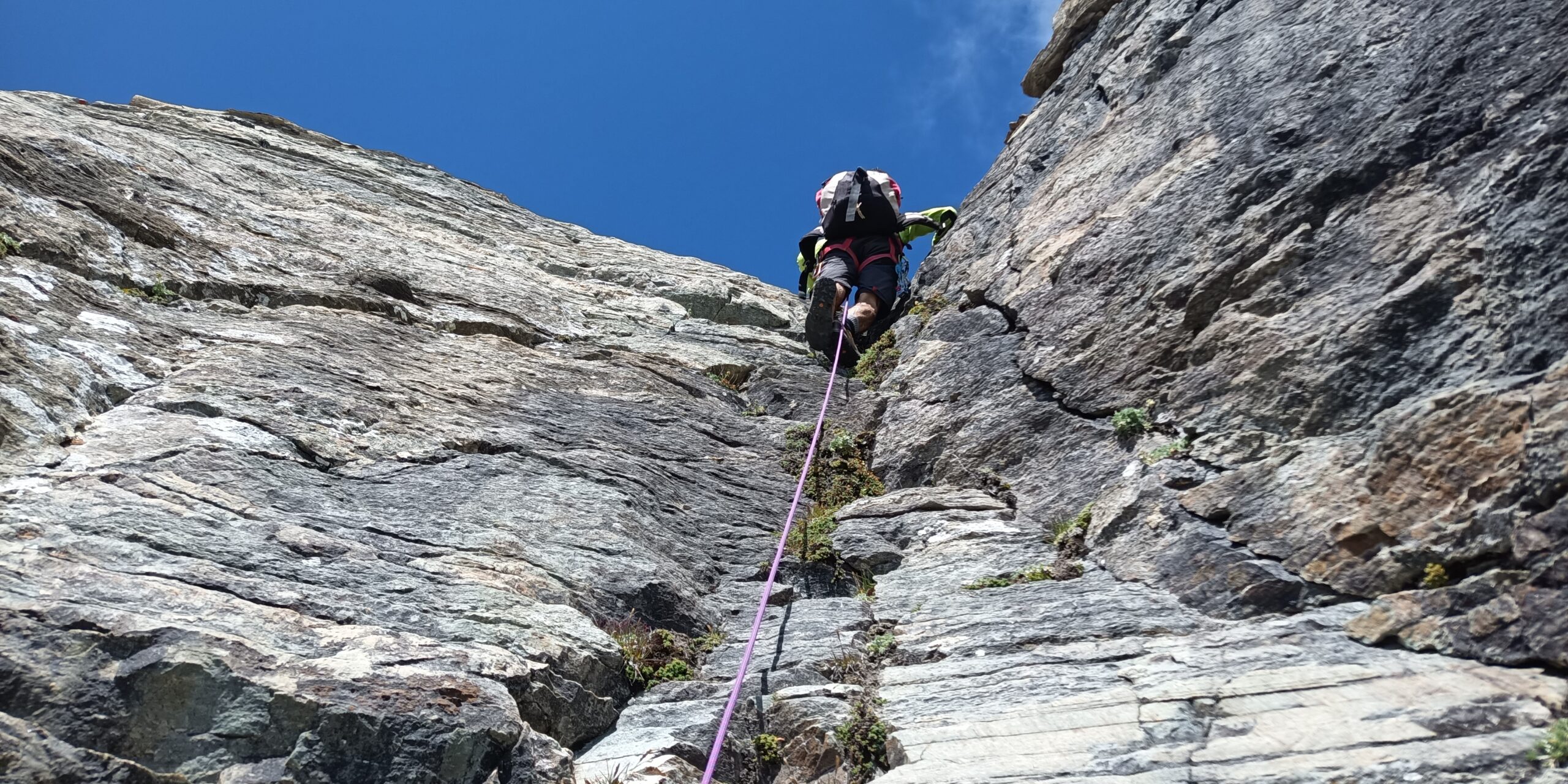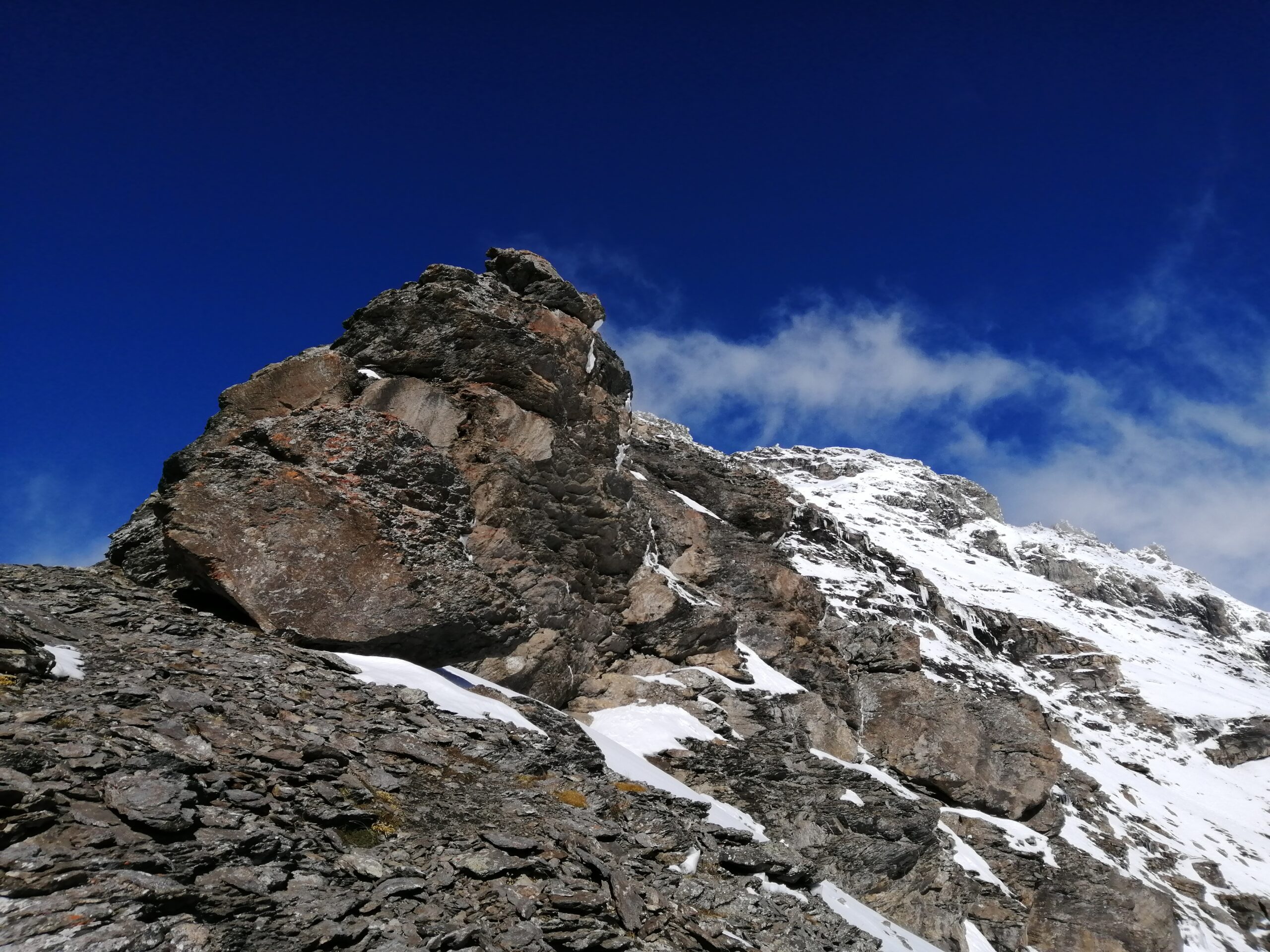Seguendo sempre fedelmente la dorsale, a quota 3100 circa inizia la parte propriamente alpinistica della salita. Superati alcuni risalti sulle rocce del filo di cresta (passaggi di II), si perviene senza grosse difficoltà ad un diedro caratterizzato dalla presenza di una fessura (passaggio di III).