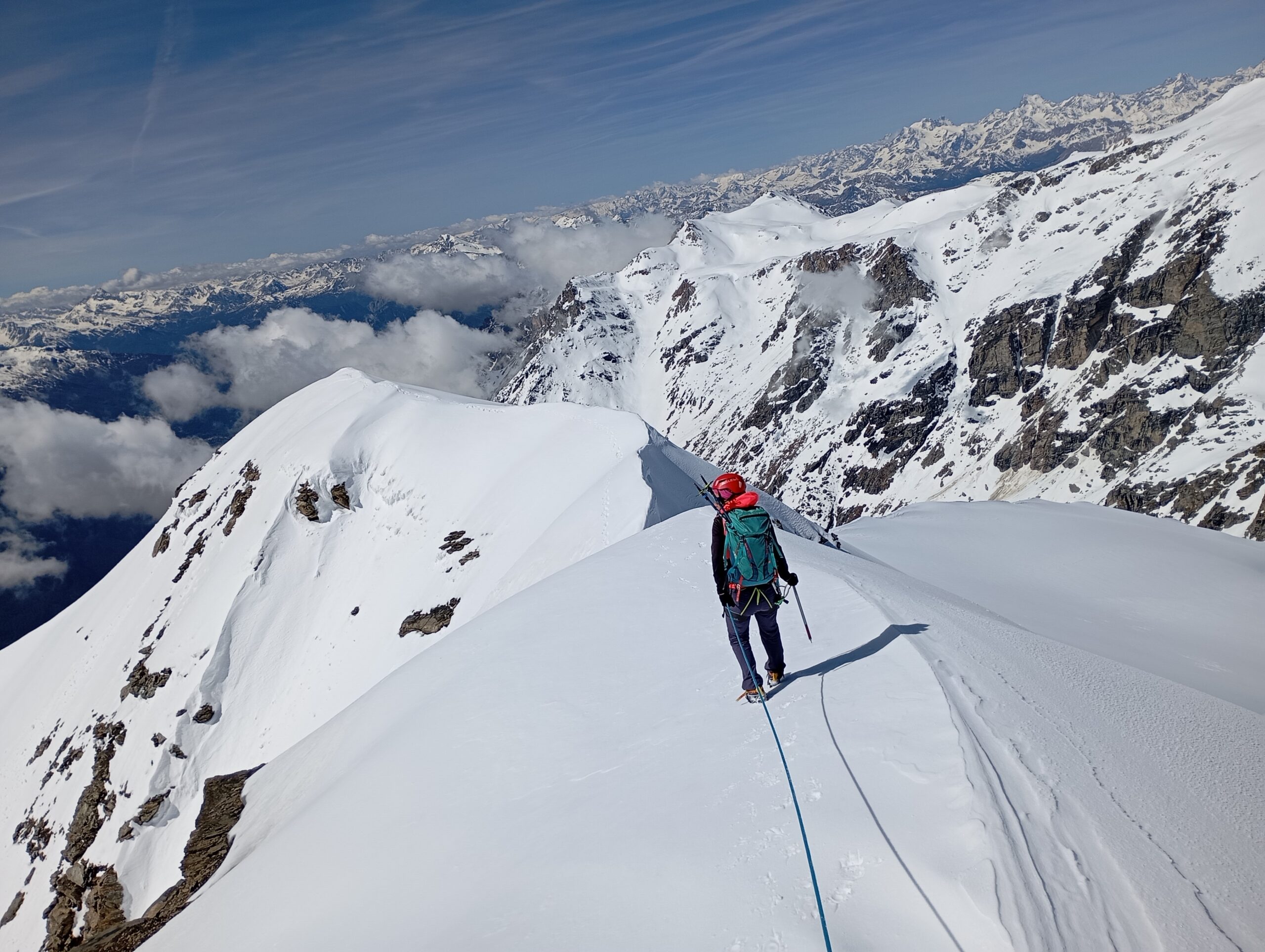 La discesa avviene lungo la via normale (difficoltà F). Utili ramponi e piccozza a inizio stagione e alcuni nuts e fettucce per la cresta (in generale poco proteggibile).