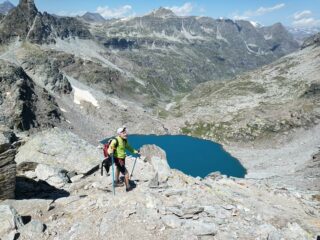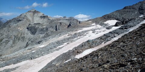Discesa dalla normale cercando di evitare il ghiacciaio, stando tutto a sx su rocce sfasciate, ma non ne vale la pena.