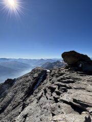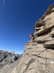Cresta semplice ma un po’ discontinua. Si sale in prevalenza su terreno facile e i passi di arrampicata sono sempre proteggibili. Usati friend fino al 2 BD. In discesa poca neve/ghiaccio, non sono serviti picca e ramponi.