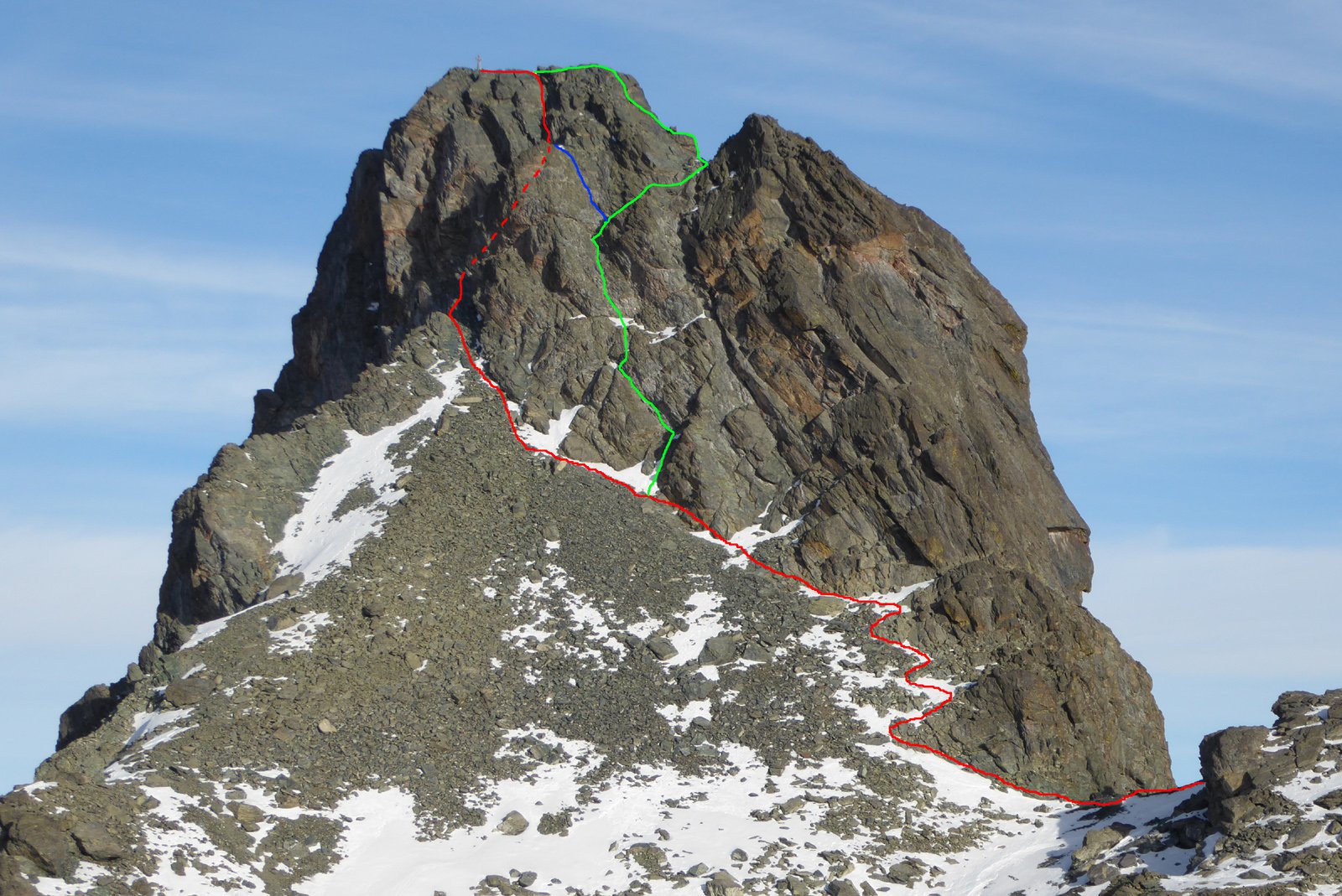 La via attacca qualche decina di metri prima della via normale, sotto la verticale del colletto fra cima e anticima, ed è individuabile da una scritta rossa ed una freccia dello stesso colore dipinte sulla roccia. Altri segni rossi e spit con moschettone incorporato, indicano il percorso di salita. Si imbocca un primo diedro molto ampio poi si piega a sx lungo un secondo diedro (passo di III) che dopo una dozzina di metri volge a dx e raggiunge una cengia detritica. Si prosegue ora leggermente verso sx (II+), quindi si piega a dx e si raggiunge, per terreno più facile, la forcella fra l’anticima e la cima. Si volge infine a sx e lungo la cresta S, nei primi metri stretta ed esposta, quindi pianeggiante, ampia e facile si raggiunge la croce di vetta.